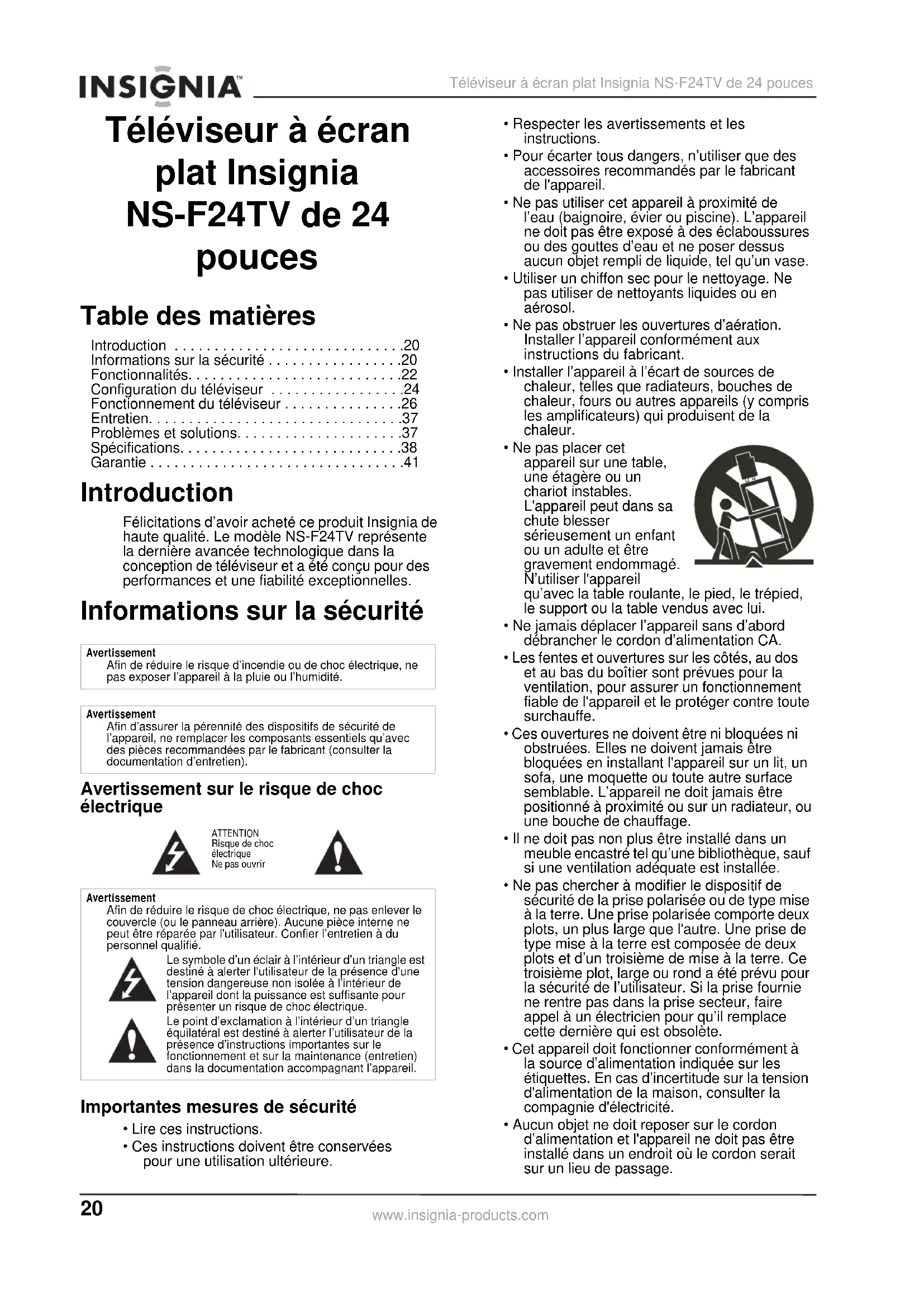 - Aucun objet ne doit reposer sur le cordon d’alimentation et l'appareil ne doit pas être installé dans un endroit où le cordon serait sur un lieu de passage. AvertissementAfin de réduire le risque d’incendie ou de choc électrique, ne pas exposer l’appareil à la pluie ou l’humidité.AvertissementAfin d’assurer la pérennité des dispositifs de sécurité de l’appareil, ne remplacer les composants essentiels qu’avec des pièces recommandées par le fabricant (consulter la documentation d’entretien).AvertissementAfin de réduire le risque de choc électrique, ne pas enlever le couvercle (ou le panneau arrière). Aucune pièce interne ne peut être réparée par l'utilisateur. Confier l’entretien à du personnel qualifié.Le symbole d’un éclair à l’intérieur d’un triangle est destiné à alerter l'utilisateur de la présence d'une tension dangereuse non isolée à l’intérieur de l’appareil dont la puissance est suffisante pour présenter un risque de choc électrique.Le point d’exclamation à l’intérieur d’un triangle équilatéral est destiné à alerter l’utilisateur de la présence d’instructions importantes sur le fonctionnement et sur la maintenance (entretien) dans la documentation accompagnant l’appareil.ATTENTIONRisque de choc électriqueNe pas ouvrir21 Téléviseur à écran plat Insignia NS-F24TV de 24 pouces www.insignia-products.com