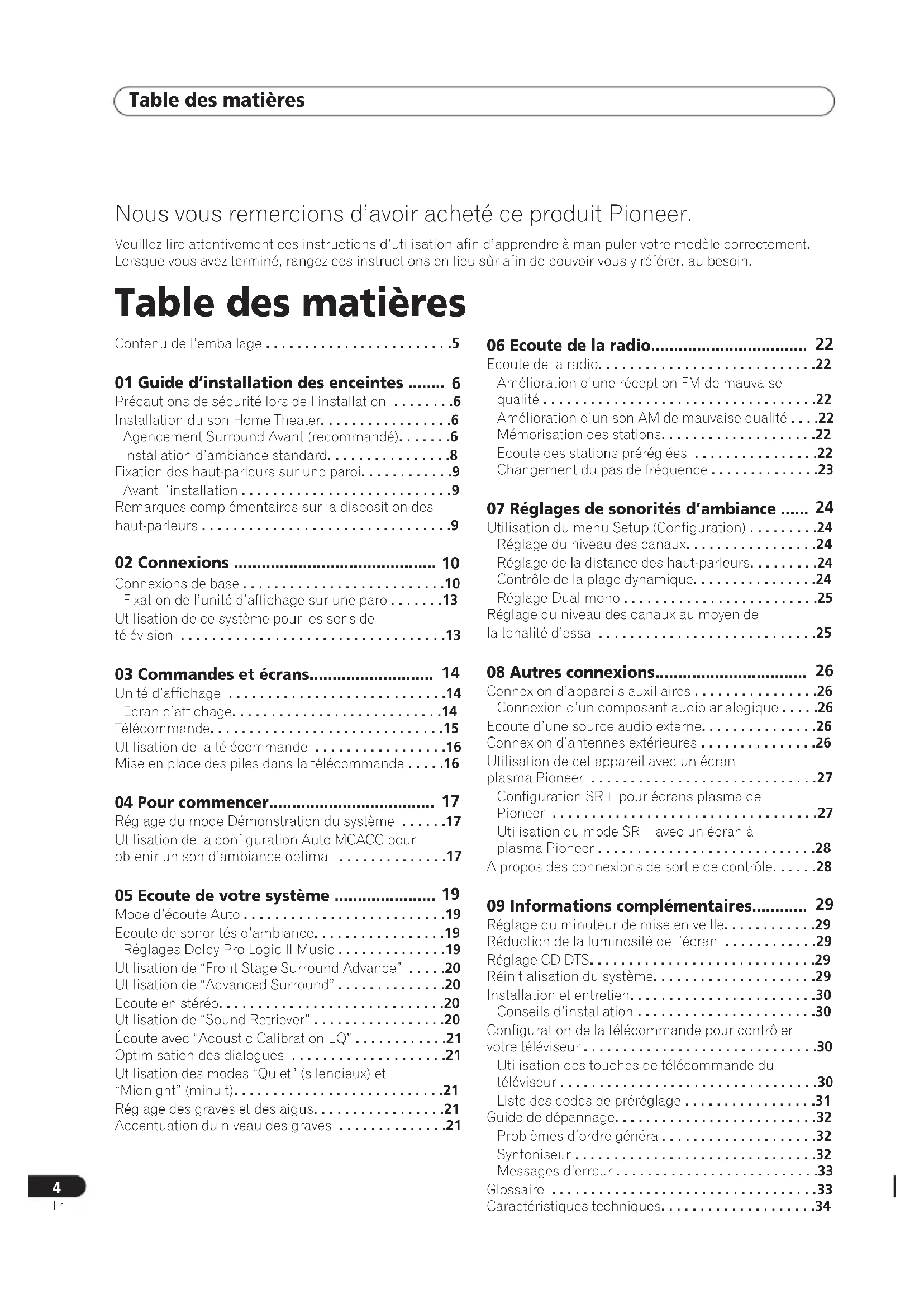 Nous vous remercions d’avoir acheté ce produit Pioneer. Veuillez lire attentivement ces instructions d’utilisation afin d’apprendre à manipuler votre modèle correctement. Lorsque vous avez terminé, rangez ces instructions en lieu sûr afin de pouvoir vous y référer, au besoin. Table des matières Contenu de l’emballage ...5 01 Guide d’installation des enceintes ........