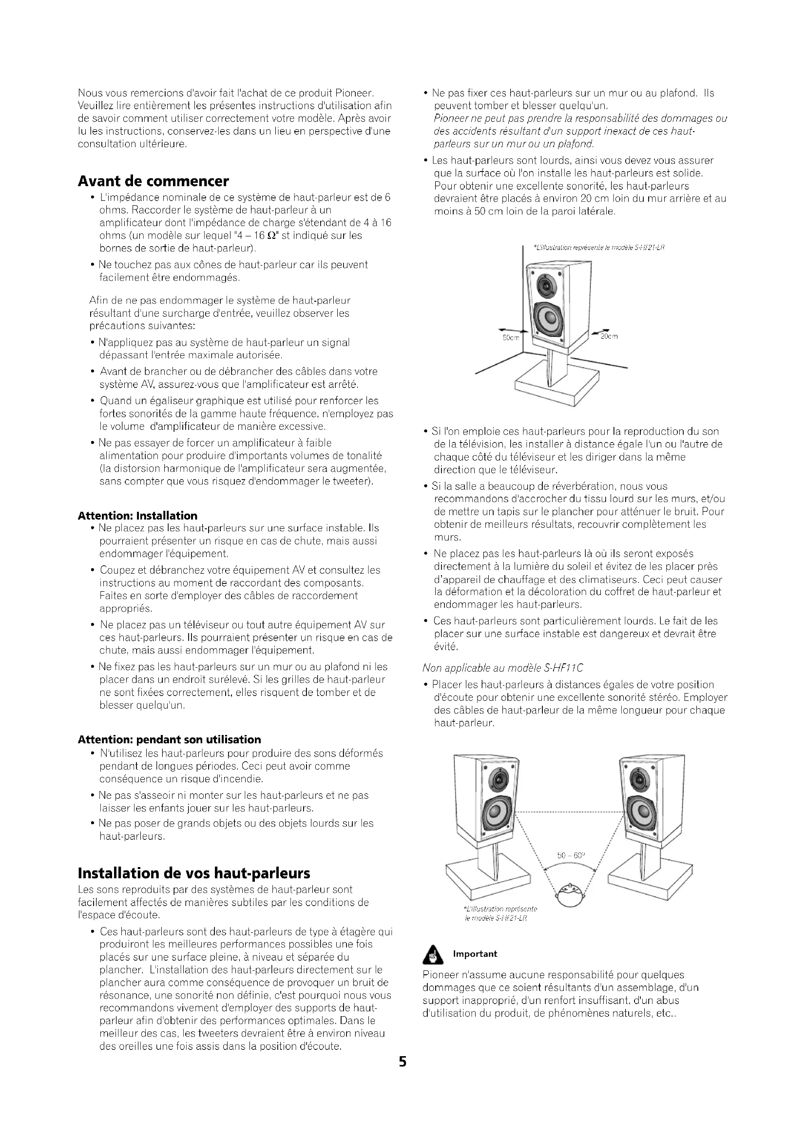 - Placer les haut-parleurs à distances égales de votre position d'écoute pour obtenir une excellente sonorité stéréo. Employer des câbles de haut-parleur de la même longueur pour chaque haut-parleur. 50 – 60º *L'illustration représente le modèle S-HF21-LR Important Pioneer n'assume aucune responsabilité pour quelques dommages que ce soient résultants d'un assemblage, d'un support inapproprié, d'un renfort insuffisant, d'un abus d'utilisation du produit, de phénomènes naturels, etc..6 Choix des câbles de haut-parleur Ces haut-parleurs n'incluent pas des câbles de haut-parleur utilisés pour se raccorder à une chaîne stéréo. Noter ce qui suit lors de la sélection des câbles de haut-parleur.