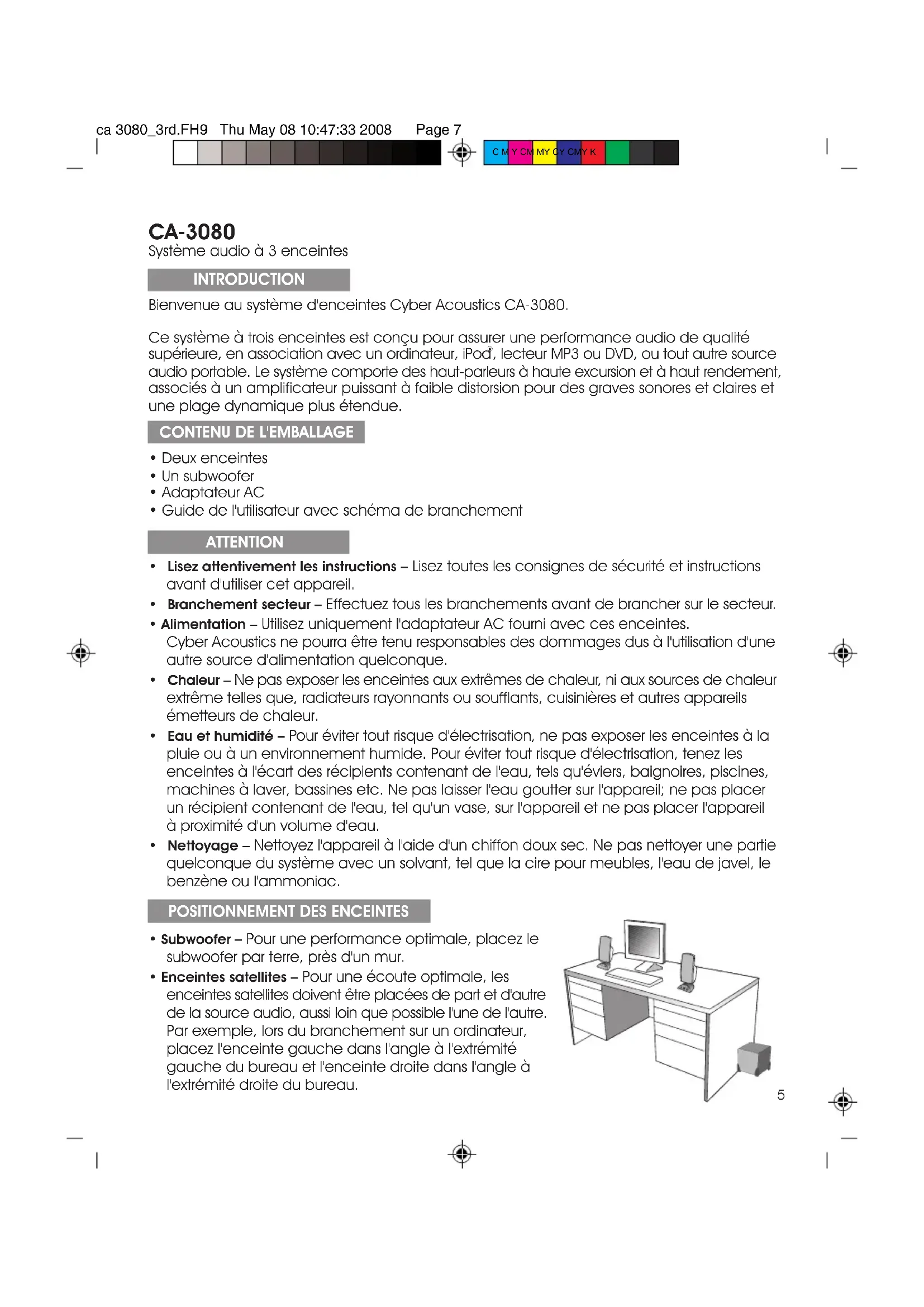 , lecteur MP3 ou DVD, ou tout autre source audio portable. Le système comporte des haut-parleurs à haute excursion et à haut rendement, associés à un amplificateur puissant à faible distorsion pour des graves sonores et claires et une plage dynamique plus étendue. Lisez attentivement les instructions Lisez toutes les consignes de sécurité et instructions avant d'utiliser cet appareil. Branchement secteur Effectuez tous les branchements avant de brancher sur le secteur. Alimentation Utilisez uniquement l'adaptateur AC fourni avec ces enceintes. Cyber Acoustics ne pourra être tenu responsables des dommages dus à l'utilisation d'une autre source d'alimentation quelconque. Chaleur Ne pas exposer les enceintes aux extrêmes de chaleur, ni aux sources de chaleur extrême telles que, radiateurs rayonnants ou soufflants, cuisinières et autres appareils émetteurs de chaleur. Eau et humidité Pour éviter tout risque d'électrisation, ne pas exposer les enceintes à la pluie ou à un environnement humide. Pour éviter tout risque d'électrisation, tenez les enceintes à l'écart des récipients contenant de l'eau, tels qu'éviers, baignoires, piscines, machines à laver, bassines etc. Ne pas laisser l'eau goutter sur l'appareil; ne pas placer un récipient contenant de l'eau, tel qu'un vase, sur l'appareil et ne pas placer l'appareil à proximité d'un volume d'eau. Nettoyage Nettoyez l'appareil à l'aide d'un chiffon doux sec. Ne pas nettoyer une partie quelconque du système avec un solvant, tel que la cire pour meubles, l'eau de javel, le benzène ou l'ammoniac. Subwoofer Pour une performance optimale, placez le subwoofer par terre, près d'un mur. Enceintes satellites Pour une écoute optimale, les enceintes satellites doivent être placées de part et d'autre de la source audio, aussi loin que possible l'une de l'autre. Par exemple, lors du branchement sur un ordinateur, placez l'enceinte gauche dans l'angle à l'extrémité gauche du bureau et l'enceinte droite dans l'angle à l'extrémité droite du bureau. Deux enceintes Un subwoofer Adaptateur AC Guide de l'utilisateur avec schéma de branchement 5ca 3080_3rd.FH9 Thu May 08 10:47:33 2008 Page 8 C M Y CM MY CY CMY K