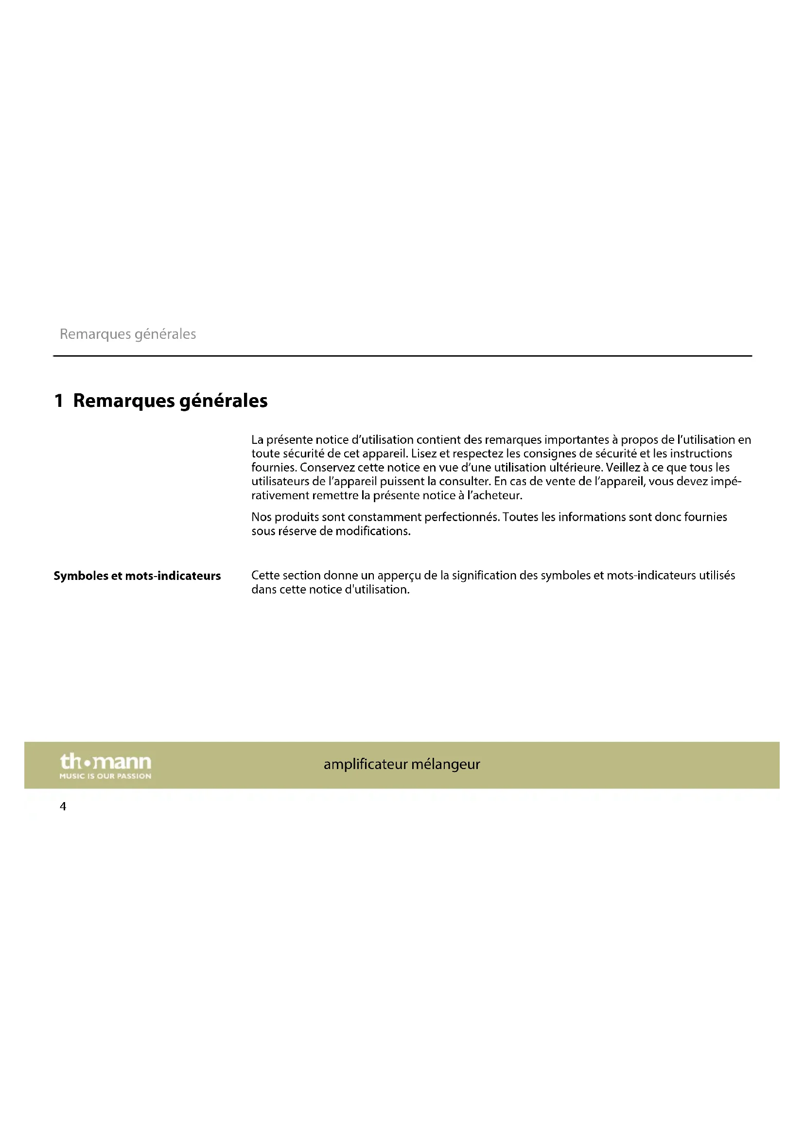 amplificateur mélangeur 4Terme générique Signification DANGER ! Cette association du symbole et du terme générique renvoie à une situation dangereuse directe se traduisant par de graves lésions voire la mort si celle-ci ne peut être évitée. ATTENTION ! Cette association du symbole et du terme générique renvoie à une situation dangereuse potentielle pouvant se traduire par des lésions légères ou moindres si celle-ci ne peut être évitée. REMARQUE ! Cette association du symbole et du terme générique renvoie à une situation dangereuse potentielle pouvant se traduire par des dommages matériels et sur l'environnement si celle- ci ne peut être évitée. Symbole d'avertissement Type de danger Avertissement en cas de tension électrique dangereuse. Remarques générales