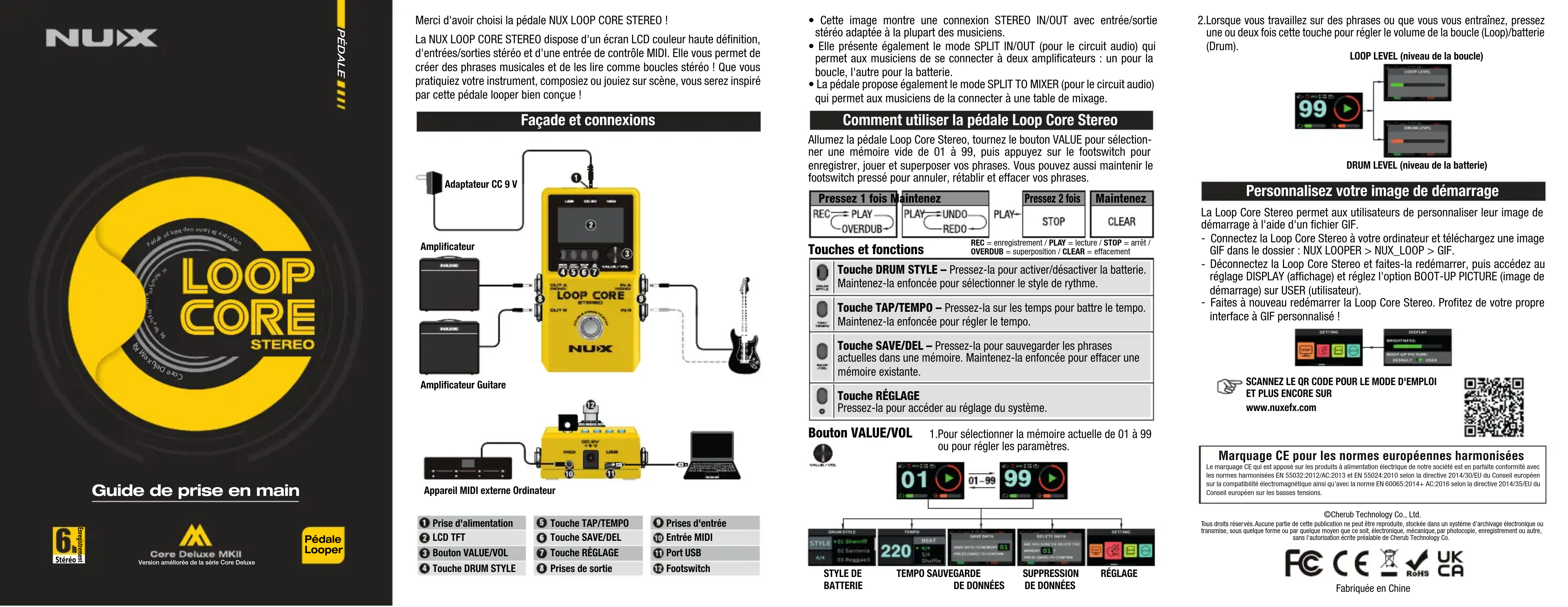 EnregistrementStéréoGuide de prise en mainVersion améliorée de la série Core Deluxe Pédale Looper PÉDALE Merci d'avoir choisi la pédale NUX LOOP CORE STEREO ! La NUX LOOP CORE STEREO dispose d'un écran LCD couleur haute définition, d'entrées/sorties stéréo et d'une entrée de contrôle MIDI. Elle vous permet de créer des phrases musicales et de les lire comme boucles stéréo ! Que vous pratiquiez votre instrument, composiez ou jouiez sur scène, vous serez inspiré par cette pédale looper bien conçue ! Façade et connexionsComment utiliser la pédale Loop Core Stereo Adaptateur CC 9 V Amplificateur Amplificateur Guitare Appareil MIDI externe Ordinateur Prise d'alimentation LCD TFT Bouton VALUE/VOL Touche DRUM STYLE Touche TAP/TEMPO Touche SAVE/DEL Touche RÉGLAGE Prises de sortie Prises d'entrée Entrée MIDI Port USB Footswitch