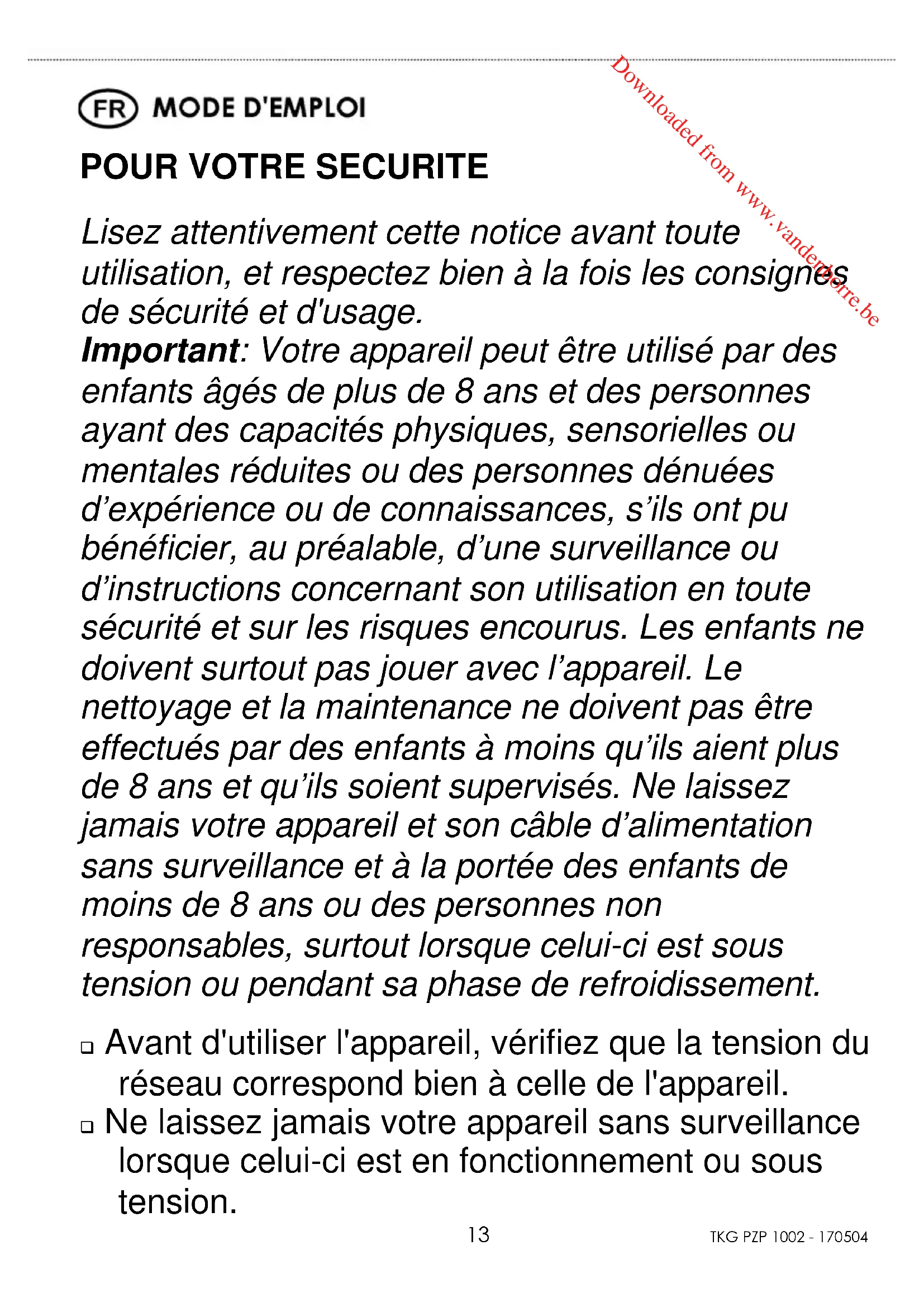 Lisez attentivement cette notice avant toute utilisation, et respectez bien à la fois les consignes de sécurité et d'usage. Important: Votre appareil peut être utilisé par des enfants âgés de plus de 8 ans et des personnes ayant des capacités physiques, sensorielles ou mentales réduites ou des personnes dénuées d’expérience ou de connaissances, s’ils ont pu bénéficier, au préalable, d’une surveillance ou d’instructions concernant son utilisation en toute sécurité et sur les risques encourus. Les enfants ne doivent surtout pas jouer avec l’appareil. Le nettoyage et la maintenance ne doivent pas être effectués par des enfants à moins qu’ils aient plus de 8 ans et qu’ils soient supervisés. Ne laissez jamais votre appareil et son câble d’alimentation sans surveillance et à la portée des enfants de moins de 8 ans ou des personnes non responsables, surtout lorsque celui-ci est sous tension ou pendant sa phase de refroidissement. Avant d'utiliser l'appareil, vérifiez que la tension du réseau correspond bien à celle de l'appareil. Ne laissez jamais votre appareil sans surveillance lorsque celui-ci est en fonctionnement ou sous tension. Downloaded from www.vandenborre.beCopies of the I/B. Please reproduce them without any changes except under special instruction from Team International BELGIUM. The pages must be reproduced and folded in order to obtain a booklet A5 (+/- 148.5 mm width x 210 mm height). When folding, make sure you keep the good numbering when you turn the pages of the I/B. Don’t change the page numbering. Keep the language integrity.