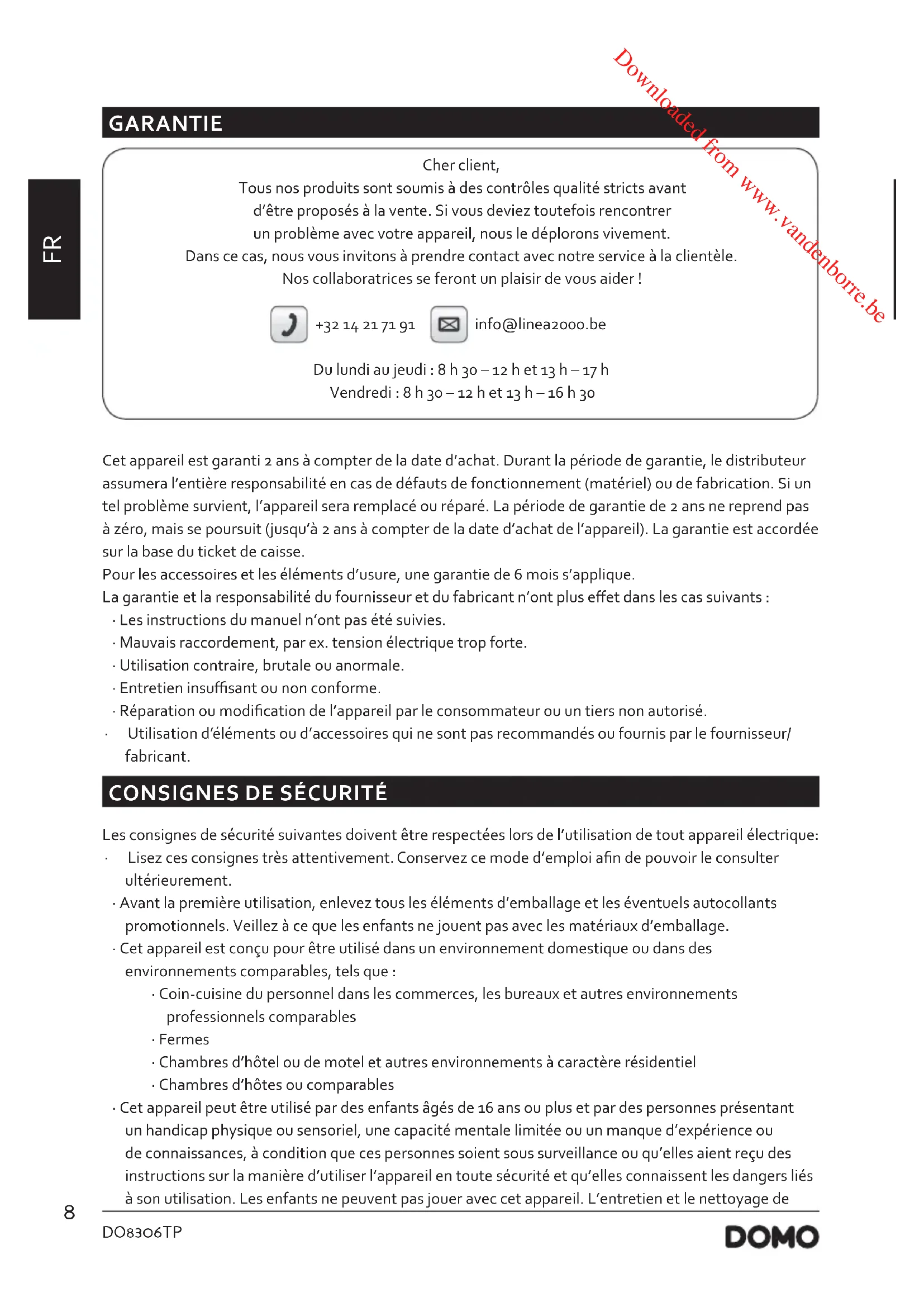 Ce symbole sur le produit ou son emballage indique que ce produit ne peut être traité comme déchet ménager. Il doit plutôt être remis au point de ramassage concerné, se chargeant du recyclage du matériel électrique et électronique. En vous assurant que ce produit est éliminé correctement, vous favorisez la prévention des conséquences négatives pour l’environnement et la santé humaine qui, sinon, seraient le résulat d’un traitement inapproprié des déchets de ce produit. Pour obtenir plus de détails sur le recyclage de ce produit, veuillez prendre contact avec le bureau municipal de votre région, votre service d’éliminiation des déchets ménagers ou le magasin où vous avez acheté le produit. L’emballage est recyclable. Traitez l’emballage écologiquement. Downloaded from www.vandenborre.be13 DO8306TP www.domo-elektro.be