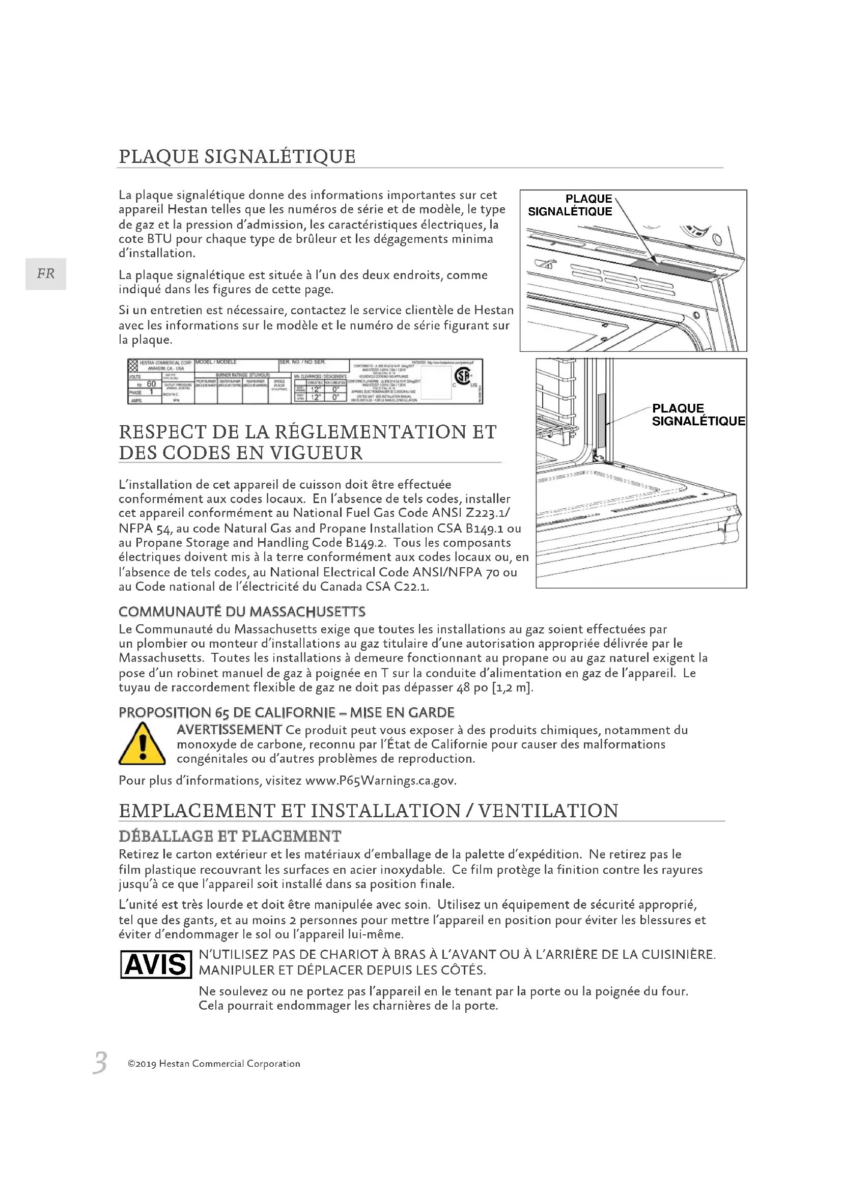 L’installation de cet appareil de cuisson doit être effectuée conformément aux codes locaux. En l’absence de tels codes, installer cet appareil conformément au National Fuel Gas Code ANSI Z223.1/NFPA 54, au code Natural Gas and Propane Installation CSA B149.1 ou au Propane Storage and Handling Code B149.2. Tous les composants électriques doivent mis à la terre conformément aux codes locaux ou, en l’absence de tels codes, au National Electrical Code ANSI/NFPA 70 ou au Code national de l’électricité du Canada CSA C22.1.COMMUNAUTÉ DU MASSACHUSETTSLe Communauté du Massachusetts exige que toutes les installations au gaz soient effectuées par un plombier ou monteur d’installations au gaz titulaire d’une autorisation appropriée délivrée par le Massachusetts. Toutes les installations à demeure fonctionnant au propane ou au gaz naturel exigent la pose d’un robinet manuel de gaz à poignée en T sur la conduite d’alimentation en gaz de l’appareil. Le tuyau de raccordement flexible de gaz ne doit pas dépasser 48 po [1,2 m].PROPOSITION 65 DE CALIFORNIE – MISE EN GARDEAVERTISSEMENT Ce produit peut vous exposer à des produits chimiques, notamment du monoxyde de carbone, reconnu par l’État de Californie pour causer des malformations congénitales ou d’autres problèmes de reproduction.Pour plus d’informations, visitez www.P65Warnings.ca.gov. PLAQUESIGNALÉTIQUE