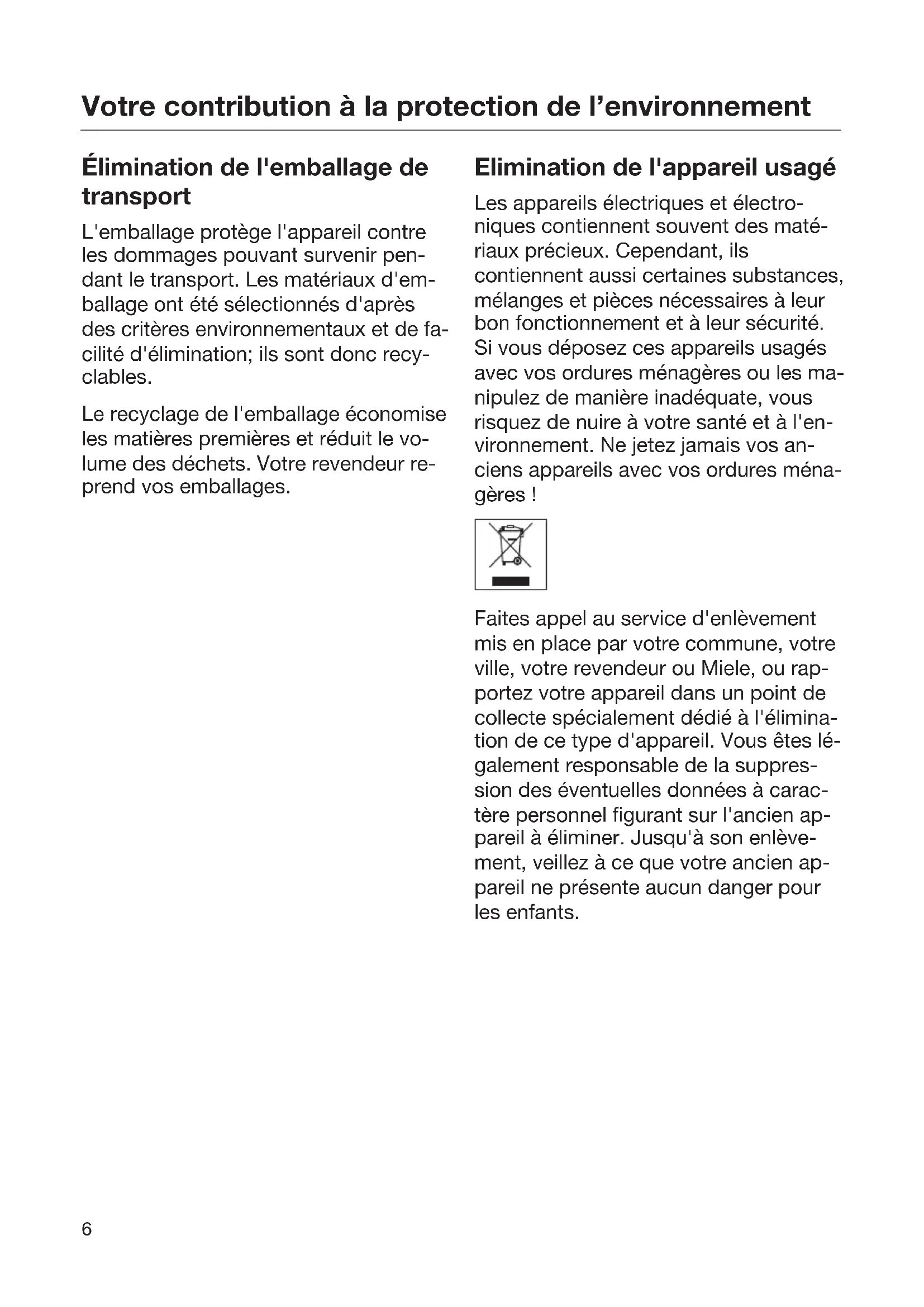 Élimination de l'emballage de transport L'emballage protège l'appareil contre les dommages pouvant survenir pen- dant le transport. Les matériaux d'em- ballage ont été sélectionnés d'après des critères environnementaux et de fa- cilité d'élimination; ils sont donc recy- clables. Le recyclage de l'emballage économise les matières premières et réduit le vo- lume des déchets. Votre revendeur re- prend vos emballages. Elimination de l'appareil usagé Les appareils électriques et électro- niques contiennent souvent des maté- riaux précieux. Cependant, ils contiennent aussi certaines substances, mélanges et pièces nécessaires à leur bon fonctionnement et à leur sécurité. Si vous déposez ces appareils usagés avec vos ordures ménagères ou les ma- nipulez de manière inadéquate, vous risquez de nuire à votre santé et à l'en- vironnement. Ne jetez jamais vos an- ciens appareils avec vos ordures ména- gères! Faites appel au service d'enlèvement mis en place par votre commune, votre ville, votre revendeur ou Miele, ou rap- portez votre appareil dans un point de collecte spécialement dédié à l'élimina- tion de ce type d'appareil. Vous êtes lé- galement responsable de la suppres- sion des éventuelles données à carac- tère personnel figurant sur l'ancien ap- pareil à éliminer. Jusqu'à son enlève- ment, veillez à ce que votre ancien ap- pareil ne présente aucun danger pour les enfants.Prescriptions de sécurité et mises en garde