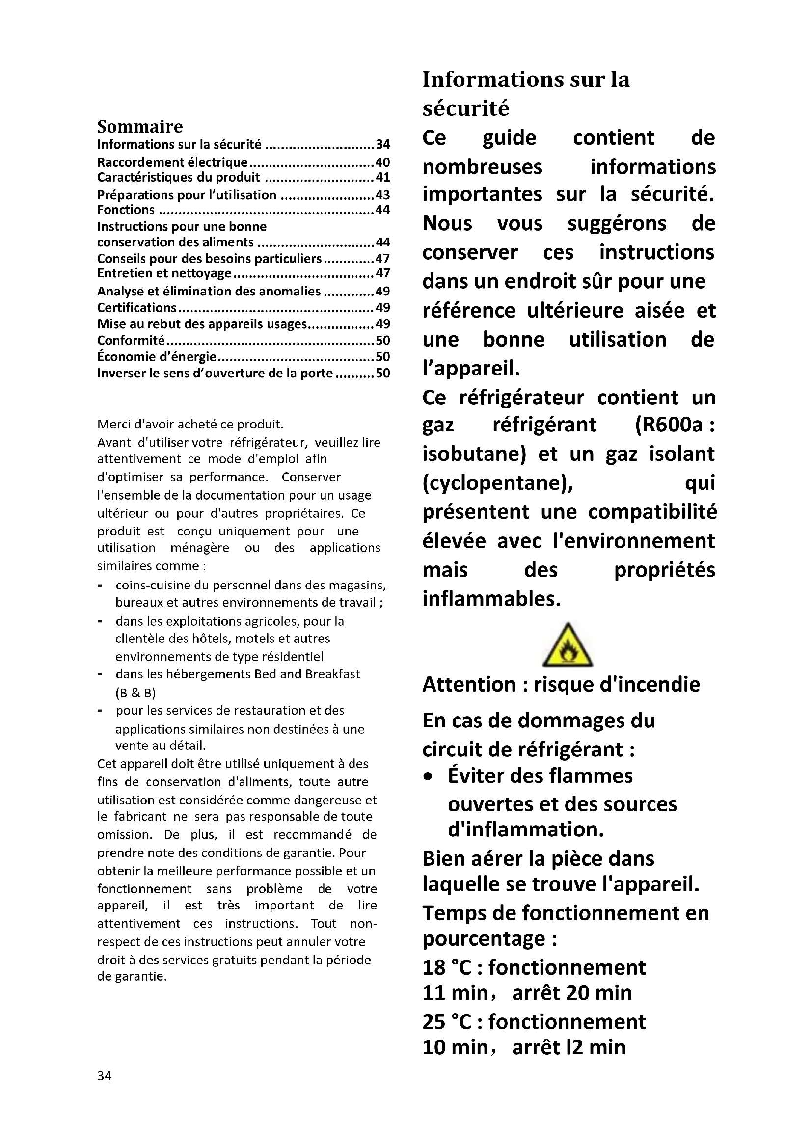 Merci d'avoir acheté ce produit. Avant d'utiliser votre réfrigérateur, veuillez lire attentivement ce mode d'emploi afin d'optimiser sa performance. Conserver l'ensemble de la documentation pour un usage ultérieur ou pour d'autres propriétaires. Ce produit est conçu uniquement pour une utilisation ménagère ou des applications similaires comme : - coins-cuisine du personnel dans des magasins, bureaux et autres environnements de travail ; - dans les exploitations agricoles, pour la clientèle des hôtels, motels et autres environnements de type résidentiel - dans les hébergements Bed and Breakfast (B & B) - pour les services de restauration et des applications similaires non destinées à une vente au détail. Cet appareil doit être utilisé uniquement à des fins de conservation d'aliments, toute autre utilisation est considérée comme dangereuse et le fabricant ne sera pas responsable de toute omission. De plus, il est recommandé de prendre note des conditions de garantie. Pour obtenir la meilleure performance possible et un fonctionnement sans problème de votre appareil, il est très important de lire attentivement ces instructions. Tout non- respect de ces instructions peut annuler votre droit à des services gratuits pendant la période de garantie. Informations sur la sécurité Ce guide contient de nombreuses informations importantes sur la sécurité. Nous vous suggérons de conserver ces instructions dans un endroit sûr pour une référence ultérieure aisée et une bonne utilisation de l’appareil. Ce réfrigérateur contient un gaz réfrigérant (R600a : isobutane) et un gaz isolant (cyclopentane), qui présentent une compatibilité élevée avec l'environnement mais des propriétés inflammables. Attention : risque d'incendie En cas de dommages du circuit de réfrigérant :