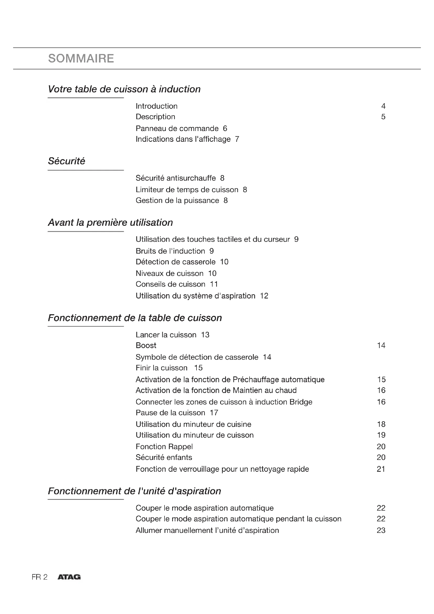 *805212* www.atag.nl www.atag.beMode d’emploi Plaque de cuisson avec extracteur Bedienungsanleitung Induktionskochfeld mit integriertem Abzug HIDD8471EV HIDD8472EVFR 2 SOMMAIRE Votre table de cuisson à induction Introduction 4 Description 5 Panneau de commande 6 Indications dans l'affichage 7 Sécurité Sécurité antisurchauffe 8 Limiteur de temps de cuisson 8 Gestion de la puissance 8 Avant la première utilisation Utilisation des touches tactiles et du curseur 9 Bruits de l'induction 9 Détection de casserole 10 Niveaux de cuisson 10 Conseils de cuisson 11 Utilisation du système d'aspiration 12 Fonctionnement de la table de cuisson Lancer la cuisson 13 Boost 14 Symbole de détection de casserole 14 Finir la cuisson 15 Activation de la fonction de Préchauffage automatique 15 Activation de la fonction de Maintien au chaud 16 Connecter les zones de cuisson à induction Bridge 16 Pause de la cuisson 17 Utilisation du minuteur de cuisine 18 Utilisation du minuteur de cuisson 19 Fonction Rappel 20 Sécurité enfants 20 Fonction de verrouillage pour un nettoyage rapide 21 Fonctionnement de l'unité d'aspiration Couper le mode aspiration automatique 22 Couper le mode aspiration automatique pendant la cuisson 22 Allumer manuellement l’unité d’aspiration 23FR 3 SOMMAIRE Pictogrammes utilisés Important à savoir Bon à savoir Branchement électrique Boost 23 Définir un arrêt différé de 15 minutes 24 Saturation du filtre à graisse 24 Saturation du filtre à odeurs 25 Réinitialiser la mémoire de l’indication de saturation du filtre 25 Menu utilisateur 26 Limiteur de puissance 27 Entretien Nettoyage 29 Récupérateur d‘eau 29 Nettoyage des filtres 30 Diagnostic des pannes 31 Spécifications techniques Données techniques 33 Informations conformément à la réglementation (UE) 66/2014 33 Aspects environnementaux Mise au rebut de l’appareil et de l’emballage 34FR 4 Introduction Nous vous félicitons d'avoir choisi cet appareil Atag. La souplesse et la simplicité de l’utilisation sont les principes qui ont guidé son développement. Ce manuel vous explique comment utiliser cet appareil de manière optimale. En plus des informations relatives au fonctionnement de l'appareil, vous y trouverez des renseignements de base susceptibles d’en faciliter l’utilisation. Veuillez lire attentivement les consignes de sécurité fournies séparément avant toute utilisation de l’appareil. Lisez attentivement cette notice d'utilisation avant d'utiliser l'appareil et rangez-la en lieu sûr pour la consulter ultérieurement. Ce manuel sert également de document de référence pour le service après-vente. Veuillez coller l'étiquette signalétique de l'appareil dans le rectangle au verso du manuel. L’étiquette signalétique mentionne toutes les informations nécessaires au service après-vente pour répondre à vos besoins et questions de façon satisfaisante. Vous pouvez trouver la version la plus récente de le mode d’emploi sur notre site Web.