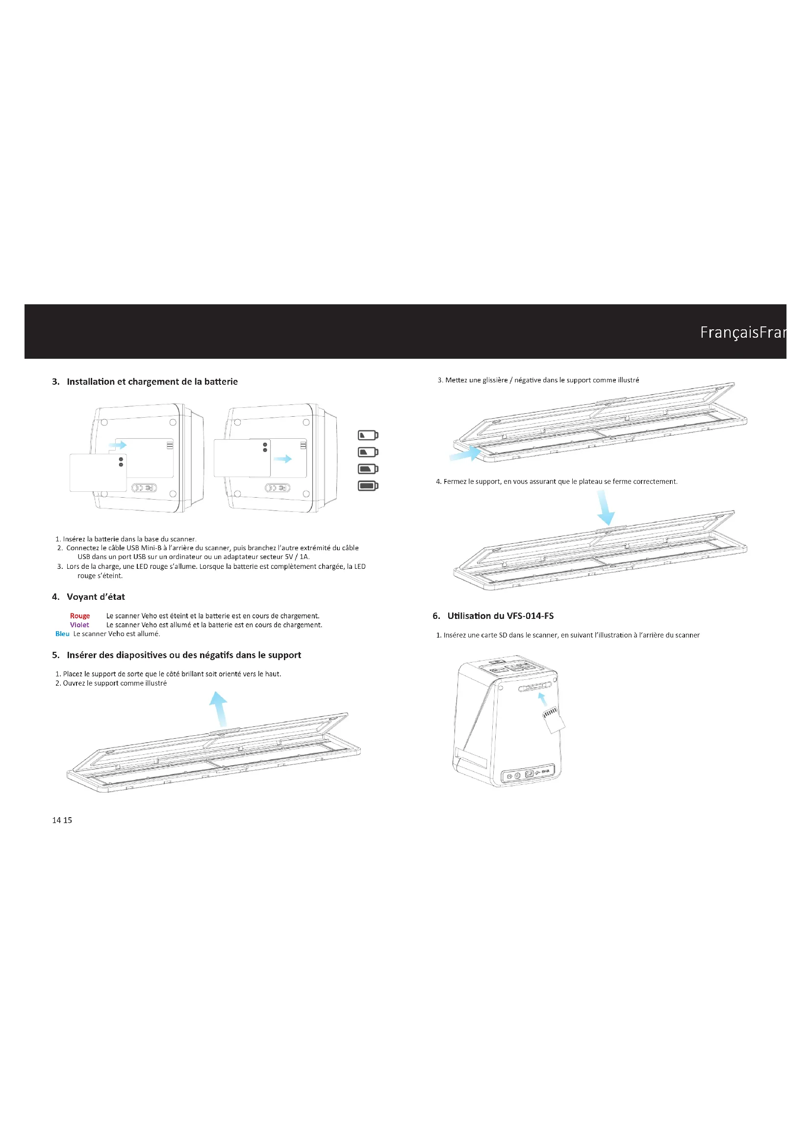 Caractérisques Capteur d’image 1 / 2.33" 14 capteur méga CMOS Aperçu et revue Écran LCD couleur 2,4 po Spécicaon des lenlles F = 4,8, f = 12,95 mm FrançaisFrançais20 21 Balance des couleurs Automaque Contrôle de l’exposion Réglage automaque et manuel Taille du lm pris en charge Auto Cropping 135 négaf et diaposive (3: 2) 110 négaf (4: 3) 126 négaf (1: 1) Type de lm pris en charge 135 Slide Conversion automaque Film négaf couleur (135, 110 et 126) Film négaf noir et blanc Mise au point réparée Concentrer Réglage EV + - 2.0 EV Interface PC USB 2.0 Format d’image 135 Rao 3: 2 négaf 110 Rao 4: 3 négaf 126 Négaf 1: 1 Rao Source de lumière 3 LED blanche Puissance Du port USB, baerie Li-ion 3.7V / 1050mAh, Système de télévision NTSC et PAL Dimensions 14,4 (H) x 11,6 (W) x 11,9 (L) cm Icônes et indicateurs Conguraon requise Exigences du système PC ¢ Penum® P4 1.6GHz ou équivalent AMD Athlon ¢ Port USB2.0 gratuit ¢ 512 Mo de RAM ¢ 500 Mo d’espace disque libre ¢ Moniteur couleur de 1024 x 768 pixels ¢ lecteur de CD-ROM ¢ Windows® XP Service Pack II / Vista™, 32/64 bits Windows 7 / Windows 8 / Windows 10 Conguraon système requise ¢ Le processeur PowerPC G5 ou Intel Core Duo est recommandé ¢ Port USB2.0 gratuit ¢ 768 Mo de RAM ¢ 500 Mo d’espace disque libre ¢ Moniteur couleur 1024 x 768 ¢ lecteur de CD-ROM Mac 10.5 ~ Up Ce symbole sur le produit ou dans les instrucons signie que vos équipements électriques et électroniques devraient être disposés en n de vie séparément de vos ordures ménagères. Il existe des systèmes de collecte disncts pour le recyclage dans l’UE. Pour plus d’informaons, contactez l’autorité locale ou votre détaillant où vous avez acheté le produit. Avant d’uliser le VFS-014-SF (Veho Scanner), assurez-vous de lire et de comprendre les consignes de sécurité décrites ci-dessous. Assurez- vous toujours que le VFS-014-SF fonconne correctement. N’ulisez jamais le VFS-014-SF à l’intérieur d’un avion ou ailleurs où le fonconnement de ces appareils est restreint. Une mauvaise ulisaon crée un risque d’accident grave. N’essayez pas d’ouvrir le cas du VFS-014-SF ou tentez de modier le VFS-014-SF de quelque façon que ce soit. Les composants internes haute tension créent le risque d’électrocuon lorsqu’ils sont exposés. La maintenance et les réparaons ne doivent être eectuées que par des fournisseurs de services autorisés. Gardez le VFS-014-SF loin de l’eau et d’autres liquides. N’ulisez pas le VFS-014-SF avec les mains humides. N’ulisez jamais le VFS-014-SF sous la pluie ou la neige. L’humidité crée un risque d’incendie et de choc électrique. Gardez le VFS-014-SF et ses accessoires hors de la portée des enfants et des animaux an de prévenir les accidents ou les dommages au VFS-014-SF. Le VFS-014-SF peut devenir légèrement chaud pendant l’ulisaon. Ceci est normal et n’indique pas de dysfonconnement. Si l’extérieur du VFS-014-SF doit être neoyé, essuyez-le avec un chion doux et sec. Si vous remarquez une fumée ou une odeur étrange provenant du VFS-014-SF, meez l’appareil hors tension immédiatement. Prenez le VFS-014-SF au centre de service agréé le plus proche pour la réparaon. N’essayez jamais de réparer le VFS-014-SF seul. Ulisez uniquement les accessoires d’alimentaon recommandés. L’ulisaon de sources d’énergie non expressément recommandées pour le VFS-014-SF peut entraîner une surchaue, une distorsion de l’équipement, des incendies, des chocs électriques ou d’autres risques. Avis FCC Cet équipement a été testé et s’est conformé aux limites d’un disposif de numérisaon de classe B, conformément à la pare 15 des règles de la FCC. Ces limites sont conçues pour fournir une protecon raisonnable contre les interférences nuisibles dans une installaon résidenelle. Cet équipement génère, ulise et peut émere de l’énergie radiofréquence. Si elle n’est pas installée et ulisée conformément aux instrucons, elle peut causer des interférences nuisibles à la communicaon radio. Cependant, il n’y a aucune garane que des interférences ne se produiront pas dans une installaon parculière. Si cet équipement provoque des interférences nuisibles à la récepon Baerie pleine Supprimer un Baerie 2/3 Supprimer tout Baerie 1/3 Format de la carte SD Baerie Vide Oui 135 Slide Non 135 Carte de lm négaf Erreur N/A 135 Film négaf Carte complète 110 Film négaf Verrouillage de carte 126 Film négaf Mode de lecture Sélecon de la carte PC-SD Diaporama Connexion PC-SD-Card connectée Aendez Sélecon du système TV Indicateur de compensaon EV Compensaon EV Numéro disponible dans la carte SD FrançaisFrançais22 23 Pebble P1 10,400mAh Portable Charger VPP-007-P1 M7 Bluetooth Wireless Speaker VSS-014-M7 USB Travel Adapter VAA-200-TA1 de la radio ou de la télévision, ce qui peut être déterminé en allumant l’équipement, l’ulisateur est encouragé à essayer de corriger les interférences en prenant une ou plusieurs des suggesons suivantes.• Réorientez ou déménagez l’antenne de récepon.• Augmenter la distance entre l’équipement et le récepteur.• Connectez l’équipement à une prise de courant diérente de celle où le récepteur est connecté.• Consultez un technicien expérimenté de télévision ou de radio pour obtenir de l’aide.MISE EN GARDE Pour respecter les limites d’un appareil de numérisaon de classe B, conformément à la pare 15 des règles de la FCC, cet appareil doit uniquement être installé sur un équipement informaque ceré conforme aux limites de classe B. Cee unité peut contenir un micro-ordinateur pour le traitement du signal et la foncon de contrôle. Dans des situaons très rares, des interférences graves, du bruit provenant d’une source externe ou de l’électricité staque peuvent l’empêcher de se bloquer. Dans le cas improbable où cela se produirait, éteignez l’