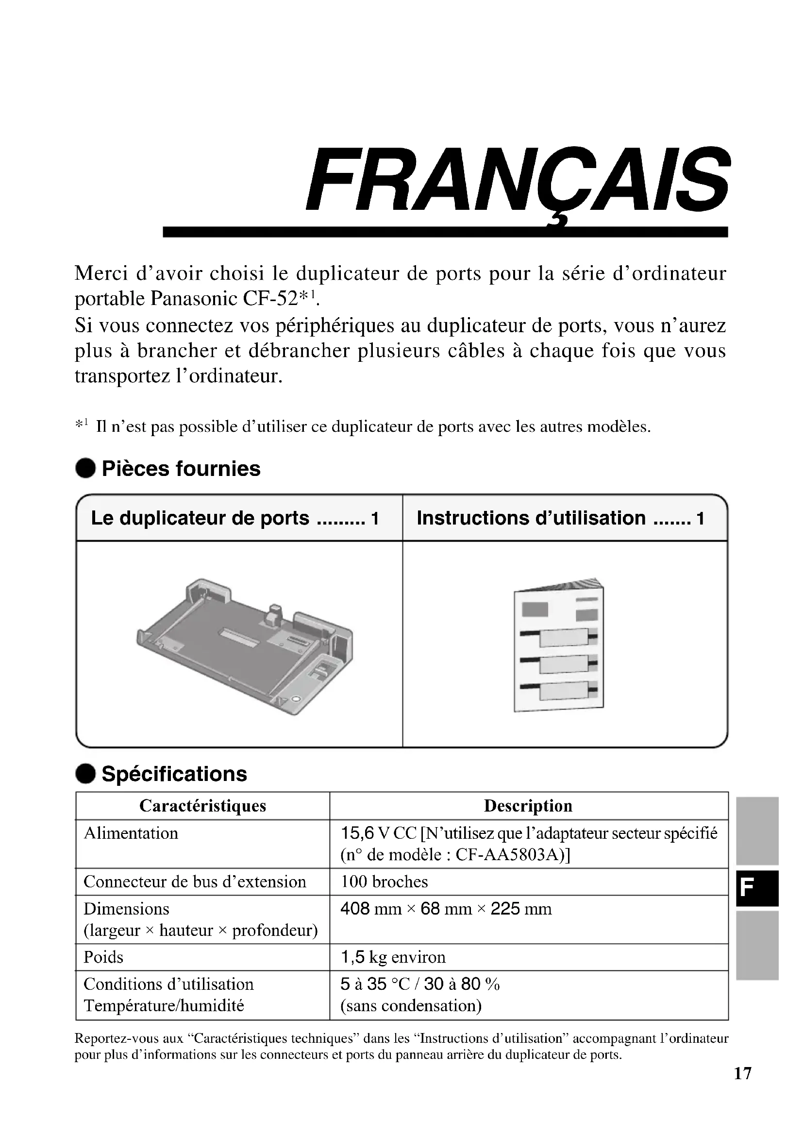 FRANÇAIS Merci d’avoir choisi le duplicateur de ports pour la série d’ordinateur portable Panasonic CF-52*