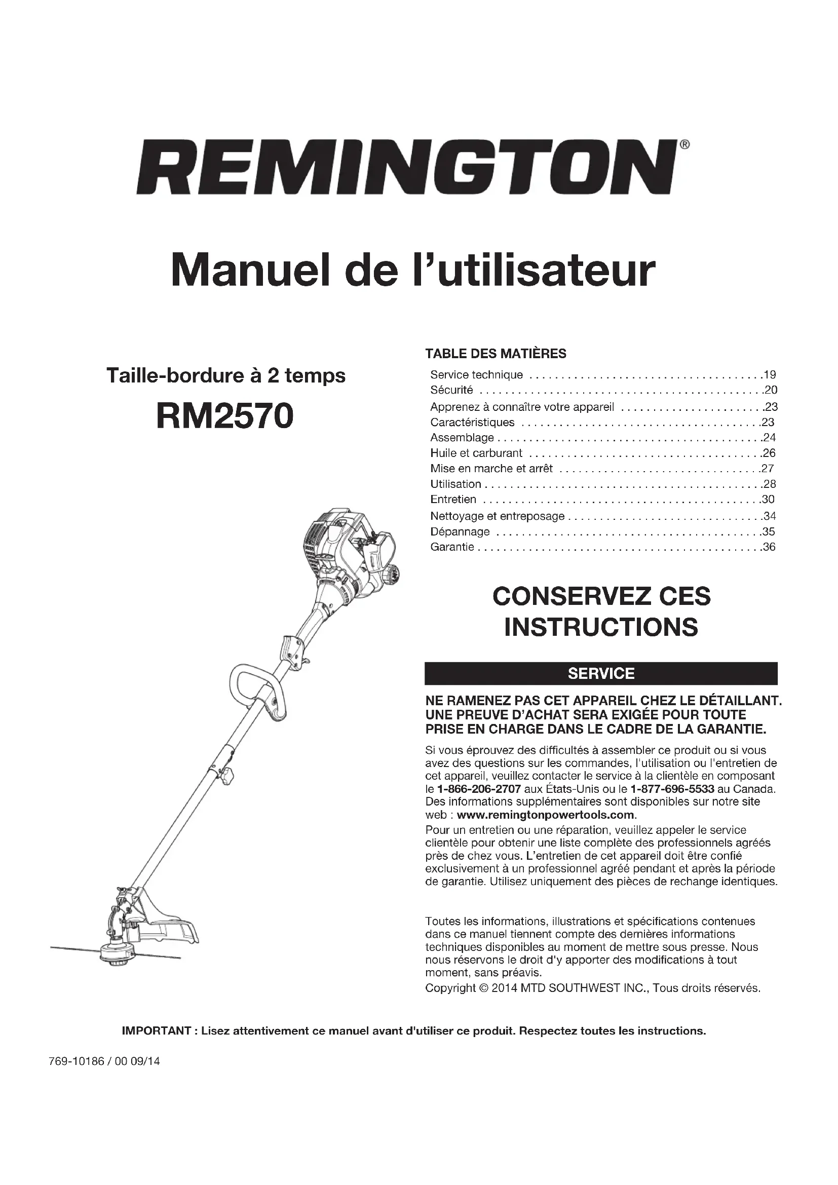 - LE MOTEUR NE SE MET PAS AU RALENTI LE MOTEUR N’ACCÉLÈRE PAS LE MOTEUR MANQUE DE PUISSANCE OU CALE LA TÊTE DE COUPE NE FAIT PAS AVANCER LE FIL LE FIL DE COUPE AVANCE DE MANIÈRE INCONTRÔLÉE36 GARANTIE LIMITÉE DU FABRICANT POUR: La garantie limitée énoncée ci-après est accordée par Remington LLC et concerne les marchandises neuves achetées et utilisées aux États- Unis, ses possessions et territoires. Remington LLC garantit ce produit contre tout vice de matière ou de façon pendant une période de deux (2) ans à compter de la date d’achat initiale et elle se réserve le choix de réparer ou de remplacer, à titre gratuit, toute pièce présentant un vice de matière ou de façon. Cette garantie limitée ne s’appliquera que dans la mesure où le produit aura été utilisé et entretenu conformément au Manuel de l’utilisateur fourni avec le produit et n’aura pas fait l’objet d’un usage inadéquat, abusif, commercial ou négligent, d’un accident, d’un entretien inadéquat, d’une modification, de vandalisme, d’un vol, d’un incendie, de dégâts d’eau ou d’un endommagement résultant d’un autre péril ou d’un désastre naturel. Les dommages résultats de l’installation ou de l’utilisation de tout accessoire ou équipement non approuvé par Remington pour une utilisation avec le(s) produit(s) couvert(s) par le présent manuel annuleront la garantie en ce qui concerne les dommages qui en résulteraient éventuellement. La présente garantie est limitée à quatre-vingt-dix (90) jours à compter de la date d’achat au détail initiale pour tout produit Remington utilisé à des fins locatives ou commerciales, ou toute utilisation produisant des revenus. POUR L’OBTENTION DU SERVICE DE GARANTIE : le service au titre de la garantie est disponible, SUR PRÉSENTATION D’UNE PREUVE D’ACHAT, AUPRÈS DU DISTRIBUTEUR AGRÉÉ LOCAL. Pour trouver un distributeur dans votre région, visitez notre site Web www.remingtonpowertools.com, consultez les Pages Jaunes, appelez le 1-866-206-2707 aux États-Unis ou le 1-877-696-5533 au Canada, ou écrivez à l’adresse Remington LLC, PO Box 361032, Cleveland, OH 44136. Aucun produit retourné à l’usine sans permission écrite préalable du service après-vente de Remington ne sera accepté. La garantie limitée n’offre aucune couverture dans les cas suivants : A. Mises au point : bougies, réglages de carburateur, filtres B. Éléments d’usure : boutons de butée, bobines extérieures, fil de coupe, moulinets, poulie du démarreur, câbles de démarreur, courroies d’entraînement, chaînes de scie, barres de guidage, couteaux de cultivateur, lames. C. Remington LLC n’accorde aucune garantie pour les produits vendus ou exportés des États-Unis d’Amérique, de leurs possessions et territoires, exception faite en ce qui concerne les produits vendus par l’intermédiaire de ses canaux agréés de distribution à l’exportation. Remington LLC se réserve le droit de modifier ou d’améliorer la conception de ses produits sans pour autant assumer l’obligation de modifier tout produit d’une fabrication plus ancienne. Aucune garantie implicite, y compris toute garantie de valeur marchande ou d’adaptation à une fin particulière, ne s’applique après la période applicable de garantie expresse écrite ci-dessus concernant les pièces qui sont identifiées. Aucune autre garantie ou caution expresse, écrite ou orale, à l’exception de celle mentionnée ci-dessus, accordée par toute personne ou entité, y compris tout distributeur ou détaillant, concernant tout produit n’engagera la responsabilité de Remington LLC. Pendant la période de garantie, le recours exclusif est la réparation ou le remplacement du produit dans les conditions énoncées ci-dessus. (Certains états ne permettent pas la limitation de la garantie implicite, il est donc possible que la limitation ci-dessus ne s’applique pas à vous.) Les clauses énoncées dans la présente Garantie constituent le recours unique et exclusif inhérent aux ventes. Remington LLC ne sera en aucun cas tenue pour responsable de tout dommage indirect ou consécutif ou de dommages comprenant, entre autres, les dépenses encourues du fait du recours à des services de remplacement ou de substitution pour l’entretien des pelouses, le transport ou des frais connexes, ou les frais entraînés par une location destinée à remplacer provisoirement un produit sous garantie. (Certains états ne permettent pas la limitation de la garantie implicite, il est donc possible que la limitation ci-dessus ne s’applique pas à vous.) Aucun recouvrement, quel qu’il soit, ne sera d’un montant supérieur au prix du produit vendu. Toute modification des dispositifs de sécurité du produit annulera la présente Garantie. Vous assumez tout risque et toute responsabilité résultant de la perte, de l’endommagement ou du préjudice que vous et votre propriété et/ou d’autres et leur propriété pourront encourir d’un fait de l’utilisation normale, de la mauvaise utilisation ou de l’incapacité d’utiliser le produit. La présente garantie limitée n’est accordée qu’à l’acheteur initial, au preneur initial ou à la personne à laquelle le produit a été offert. Le Droit des États vis à vis de la présente garantie : la présente garantie vous confère certains droits juridiques et vous pouvez bénéficier d’autres droits lesquels varient d’un état à l’autre. Pour obtenir l’adresse du distributeur réparateur le plus proche, composez le : 1-866-206-2707 aux États-Unis ou le 1-877-696-5533 au Canada. REMINGTON LLC P.O. Box 361032 Cleveland, OH 44136ÍNDICEReparación y mantenimiento p. 37