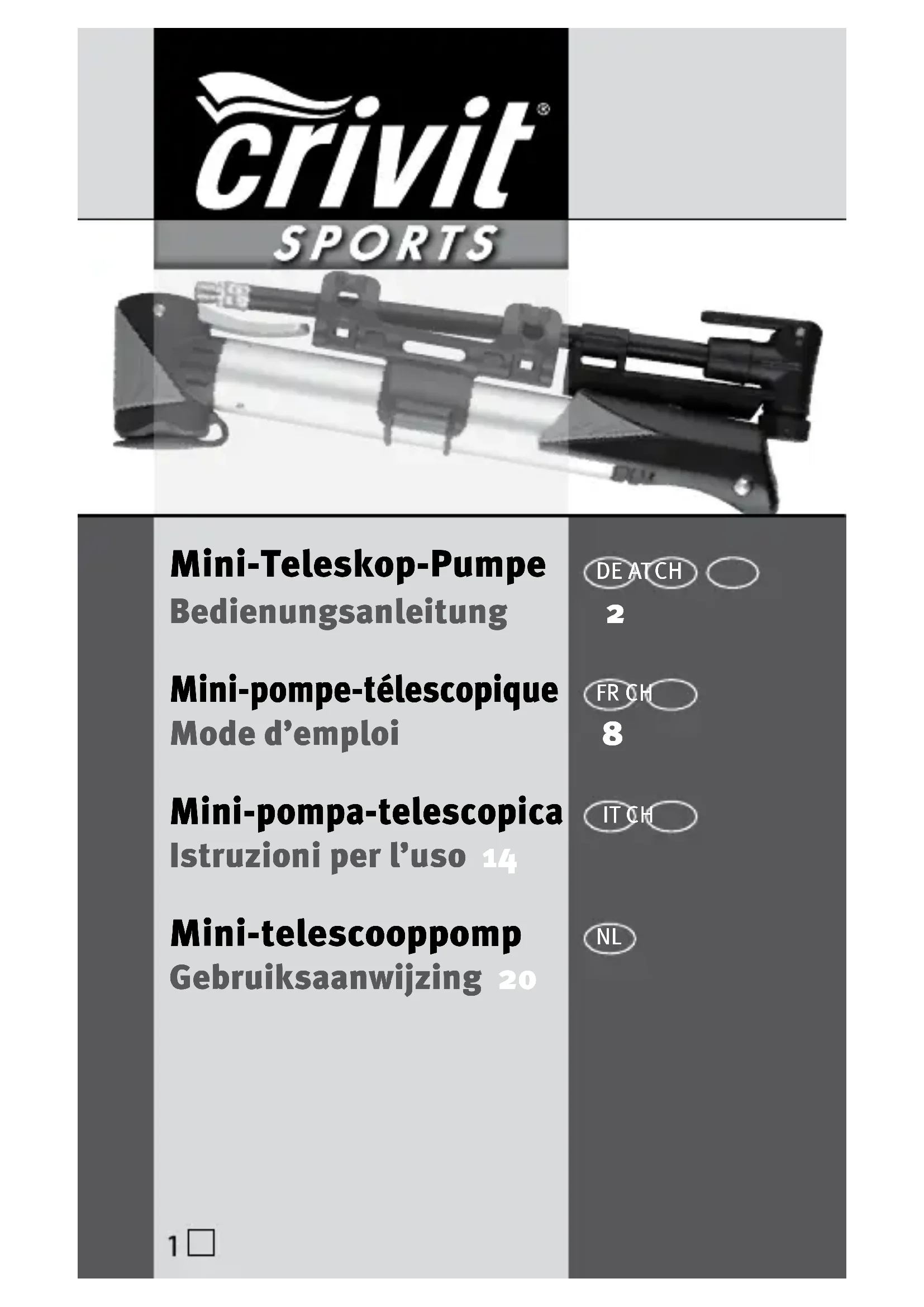 7Mini-pompe-télescopique Situation : 23.03.11 Mode d’emploi Introduction : Nous vous félicitons pour l’achat de cette Mini-pompe- télescopique de très grande qualité. Pour des raisons de sécurité, veuillez lire entièrement et le plus attentivement possible le mode d’emploi et les indications de sécurité, qu’il contient, et le conserver, car il peut toujours vous être utile en cas de problème avec votre Mini-pompe- télescopique. Le mode d’emploi est une partie composante fixe de ce produit et doit l’accompagner en cas de transfert à un tiers. Utilisation conforme aux dispositions : Cette Mini-pompe-télescopique convient pour le gonflage de tous les pneus de vélos courants. Toute autre utilisa- tion ou modification du produit sont considérées comme non conformes aux dispositions et peuvent entraîner des risques ainsi que des blessures et des endommagements. Le responsable de la mise en circulation décline toute res- ponsabilité pour les dommages résultants d’une utilisation non conforme aux dispositions. Le produit n’est pas destiné à l’utilisation industrielle. Avertissements : Vous pouvez gonfler tous les pneus de vélos jusqu’à la pression d’air maximale indiquée de la pompe (max. 5 bars) ou jusqu’à la pression maximale indiquée du fabricant de pneus. En générale, vous les trouverez sur le côté du pneu. Les valeurs maximales indiquées ne doivent être dépassées à aucun moment. Pour éviter toute blessure, ne pas utiliser les pompes à air défectueuses ou endommagées. Les pom- pes défectueuses doivent être éliminées conformément aux règles de l‘art. Une réparation n’est pas possible.