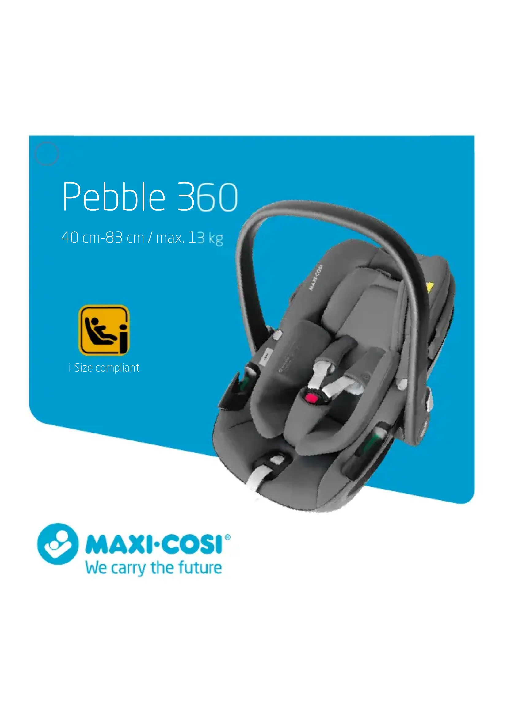 Le Pebble 360 est un dispositif de retenue « universel » ceinturé. Il est homologué suivant le règlement R129 ( i-Size) des Nations Unies pour une utilisation sur les places assises « universelles » d’un véhicule, conformément aux indications fournies par le constructeur automobile dans le manuel d’utilisation du véhicule. En cas de doute, contactez le fabricant ou le revendeur du dispositif de retenue pour enfants. Ce siège auto pour bébé fait partie de la gamme Family 360° qui ore une solution de mobilité complète de la naissance à environ 4 ans. Pour en savoir plus sur i-Size, rendez-vous sur le site www.maxi-cosi.com. Catégorie du siège auto : i-Size (40 cm-83 cm – jusqu’à environ 15 mois) Position du siège auto : dos à la route