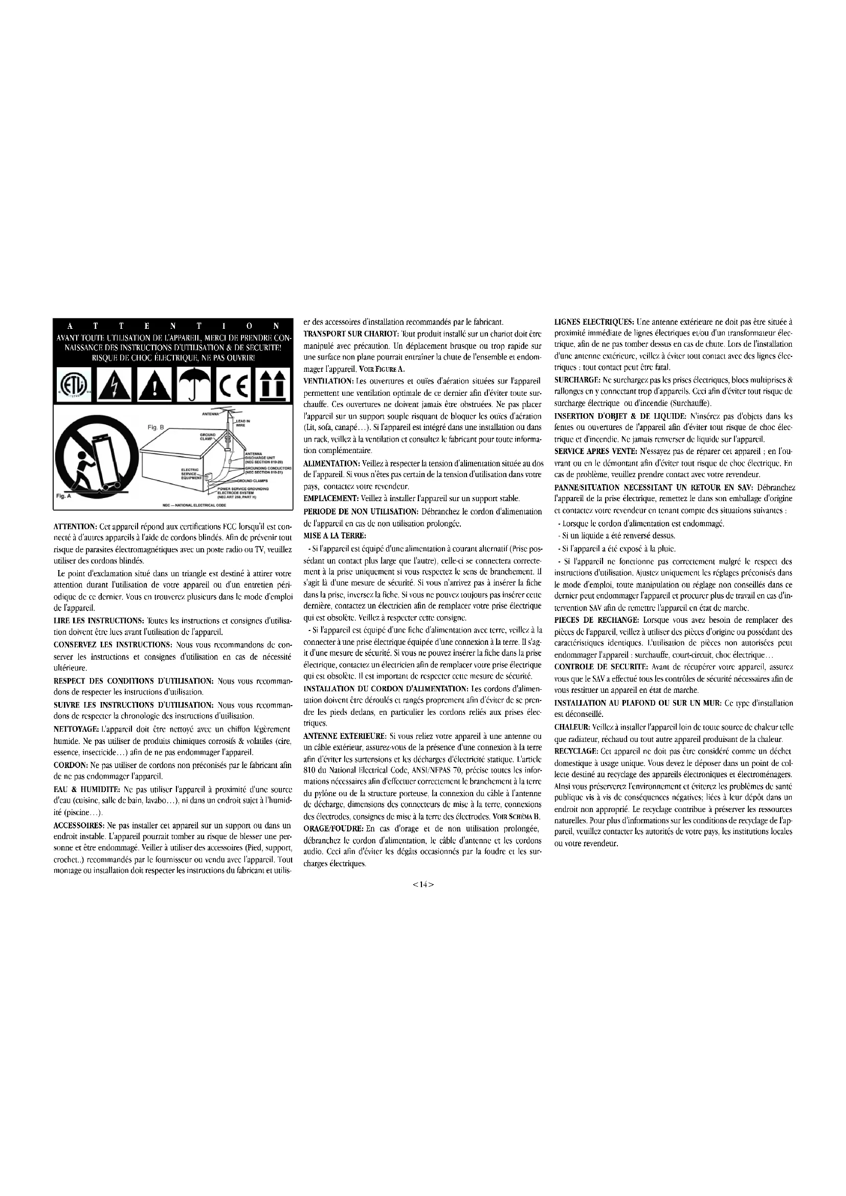 <13> XTR-500ATTENTION: Cet appareil répond aux certifications FCC lorsqu'il est con- necté à d'autres appareils à l'aide de cordons blindés. Afin de prévenir tout risque de parasites électromagnétiques avec un poste radio ou TV, veuillez utiliser des cordons blindés. Le point d'exclamation situé dans un triangle est destiné à attirer votre attention durant l'utilisation de votre appareil ou d'un entretien péri- odique de ce dernier. Vous en trouverez plusieurs dans le mode d'emploi de l'appareil. LIRE LES INSTRUCTIONS: Toutes les instructions et consignes d'utilisa- tion doivent être lues avant l'utilisation de l'appareil. CONSERVEZ LES INSTRUCTIONS: Nous vous recommandons de con- server les instructions et consignes d'utilisation en cas de nécessité ultérieure. RESPECT DES CONDITIONS D'UTILISATION: Nous vous recomman- dons de respecter les instructions d'utilisation. SUIVRE LES INSTRUCTIONS D'UTILISATION: Nous vous recomman- dons de respecter la chronologie des instructions d'utilisation. NETTOYAGE: L'appareil doit être nettoyé avec un chiffon légèrement humide. Ne pas utiliser de produits chimiques corrosifs & volatiles (cire, essence, insecticide…) afin de ne pas endommager l'appareil. CORDON: Ne pas utiliser de cordons non préconisés par le fabricant afin de ne pas endommager l'appareil. EAU & HUMIDITE: Ne pas utiliser l'appareil à proximité d'une source d'eau (cuisine, salle de bain, lavabo…), ni dans un endroit sujet à l'humid- ité (piscine…). ACCESSOIRES: Ne pas installer cet appareil sur un support ou dans un endroit instable. L'appareil pourrait tomber au risque de blesser une per- sonne et être endommagé. Veiller à utiliser des accessoires (Pied, support, crochet..) recommandés par le fournisseur ou vendu avec l'appareil. Tout montage ou installation doit respecter les instructions du fabricant et utilis- er des accessoires d'installation recommandés par le fabricant. TRANSPORT SUR CHARIOT: Tout produit installé sur un chariot doit être manipulé avec précaution. Un déplacement brusque ou trop rapide sur une surface non plane pourrait entraîner la chute de l'ensemble et endom- mager l'appareil. V OIR FIGURE A. VENTILATION: Les ouvertures et ouïes d'aération situées sur l'appareil permettent une ventilation optimale de ce dernier afin d'éviter toute sur- chauffe. Ces ouvertures ne doivent jamais être obstruées. Ne pas placer l'appareil sur un support souple risquant de bloquer les ouïes d'aération (Lit, sofa, canapé…). Si l'appareil est intégré dans une installation ou dans un rack, veillez à la ventilation et consultez le fabricant pour toute informa- tion complémentaire. ALIMENTATION: Veillez à respecter la tension d'alimentation située au dos de l'appareil. Si vous n'êtes pas certain de la tension d'utilisation dans votre pays, contactez votre revendeur. EMPLACEMENT: Veillez à installer l'appareil sur un support stable. PERIODE DE NON UTILISATION: Débranchez le cordon d'alimentation de l'appareil en cas de non utilisation prolongée. MISE A LA TERRE: - Si l'appareil est équipé d'une alimentation à courant alternatif (Prise pos- sédant un contact plus large que l'autre), celle-ci se connectera correcte- ment à la prise uniquement si vous respectez le sens de branchement. Il s'agit là d'une mesure de sécurité. Si vous n'arrivez pas à insérer la fiche dans la prise, inversez la fiche. Si vous ne pouvez toujours pas insérer cette dernière, contactez un électricien afin de remplacer votre prise électrique qui est obsolète. Veillez à respecter cette consigne. - Si l'appareil est équipé d'une fiche d'alimentation avec terre, veillez à la connecter à une prise électrique équipée d'une connexion à la terre. Il s'ag- it d'une mesure de sécurité. Si vous ne pouvez insérer la fiche dans la prise électrique, contactez un électricien afin de remplacer votre prise électrique qui est obsolète. Il est important de respecter cette mesure de sécurité. INSTALLATION DU CORDON D'ALIMENTATION: Les cordons d'alimen- tation doivent être déroulés et rangés proprement afin d'éviter de se pren- dre les pieds dedans, en particulier les cordons reliés aux prises élec- triques. ANTENNE EXTERIEURE: Si vous reliez votre appareil à une antenne ou un câble extérieur, assurez-vous de la présence d'une connexion à la terre afin d'éviter les surtensions et les décharges d'électricité statique. L'article 810 du National Electrical Code, ANSI/NFPAS 70, précise toutes les infor- mations nécessaires afin d'effectuer correctement le branchement à la terre du pylône ou de la structure porteuse, la connexion du câble à l'antenne de décharge, dimensions des connecteurs de mise à la terre, connexions des électrodes, consignes de mise à la terre des électrodes. V OIR SCHÉMA B. ORAGE/FOUDRE: En cas d'orage et de non utilisation prolongée, débranchez le cordon d'alimentation, le câble d'antenne et les cordons audio. Ceci afin d'éviter les dégâts occasionnés par la foudre et les sur- charges électriques. LIGNES ELECTRIQUES: Une antenne extérieure ne doit pas être située à proximité immédiate de lignes électriques et/ou d'un transformateur élec- trique, afin de ne pas tomber dessus en cas de chute. Lors de l'installation d'une antenne extérieure, veillez à éviter tout contact avec des lignes élec- triques : tout contact peut être fatal. SURCHARGE: Ne surchargez pas les prises électriques, blocs multiprises & rallonges en y connectant trop d'appareils. Ceci afin d'éviter tout risque de surcharge électrique ou d'incendie (Surchauffe). INSERTION D'OBJET & DE LIQUIDE: N'insérez pas d'objets dans les fentes ou ouvertures de l'appareil afin d'éviter tout risque de choc élec- trique et d'incendie. Ne jamais renverser de liquide sur l'appareil. SERVICE APRES VENTE: N'essayez pas de réparer cet appareil ; en l'ou- vrant ou en le démontant afin d'éviter tout risque de choc électrique.