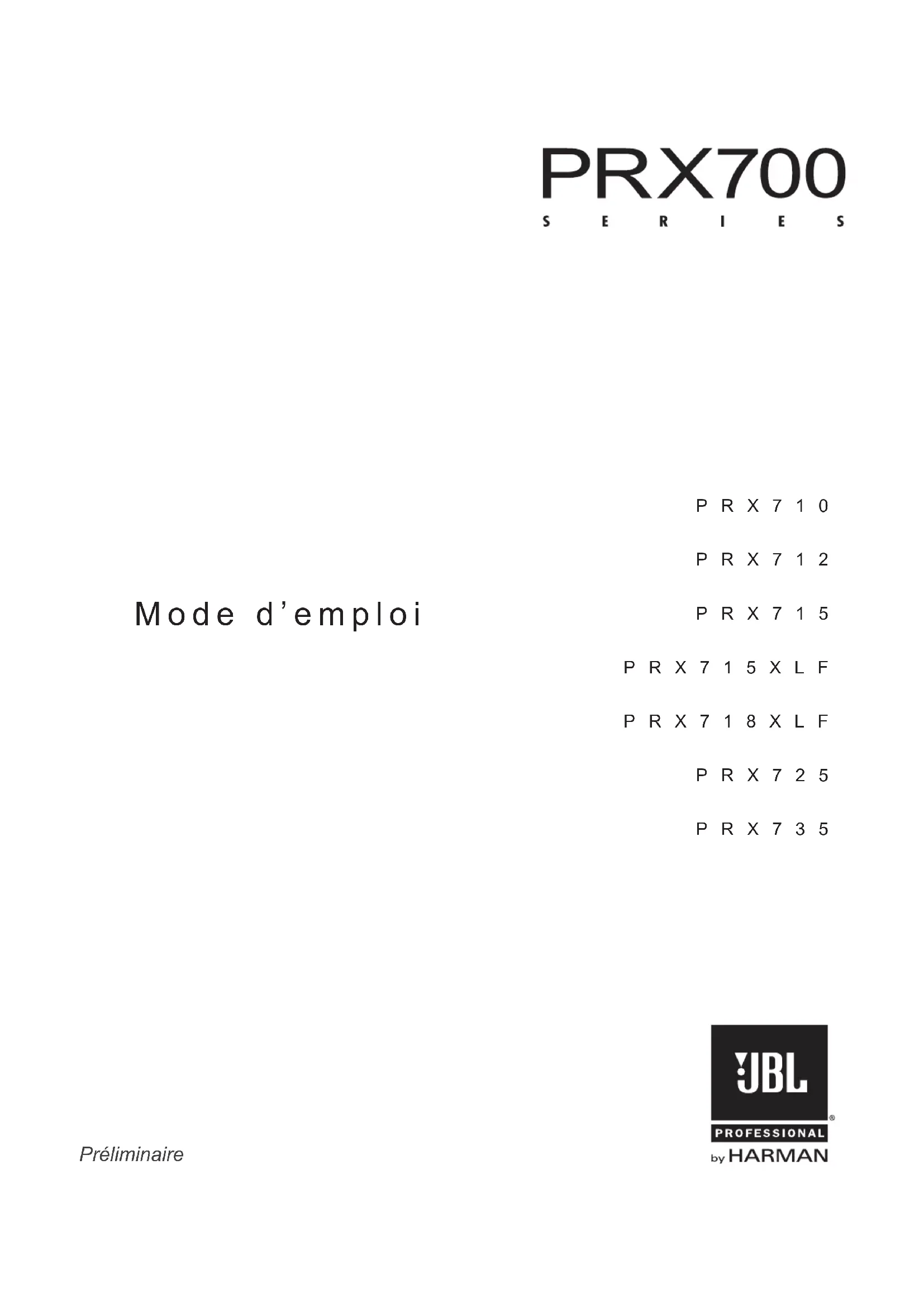 - Consulter le revendeur ou un technicien radio / TV expérimenté pour obtenir de l’aide. Déclaration de conformité des enceintes de la gamme PRX700 Conformité avec les directives de sécurité et de compatibilité électromagnétique EN 55103-1:1997 Compatibilité électromagnétique - Norme de famille de produits pour les appareils audio, vidéo, audiovisuels et de commande de lumières pour spectacles à usage professionnel - Partie 1 : Émissions EN 55103-1:1997 Émissions de champ magnétique, annexe A à 10 cm et 20 cm EN 55022:2003 Limites et méthodes de mesure des caractéristiques d’interférences radiophoniques des équipements des technologies d’information : Rayonnées, limites de la classe B ; Guidées, classe A EN 55103-2:1997 Compatibilité électromagnétique - Norme de famille de produits pour les appareils audio, vidéo, audiovisuels et de commande de lumières de spectacles à usage professionnel - Partie 2 : Immunité EN 61000-4-2: A2:2001 Immunité aux décharges électrostatiques (environnement E2, critère B, contact 4 kV, décharge dans l’air 8 kV) EN 61000-4-3:2003 Rayonnement, fréquence radiophonique, immunité électromagnétique (environnement E2, critère A) EN 61000-4-4:2005 Immunité aux transitoires électriques rapides en salves (critère B) EN 61000-4-5:2001 Immunité aux ondes de choc (critère B) EN 61000-4-6:1996 Immunité aux perturbations conduites, induites par les champs radioélectriques (critère A) EN 61000-4-11:2004 Creux de tension, coupures brèves et variations de tension UL 6500 2nde édition 1999 Appareils audio/vidéo et instruments de musique pour usage domestique, commercial et utilisation générale similaire CAN/CSA-E60065-00 Appareils audio, vidéo et appareils similaires - Exigences de sécurité10 Alimentation électrique nécessaire Les enceintes standard de la gamme PRX700 sont équipées d’un amplicateur de puissance multicanal de classe D et d’une électronique (DSP) propre à l’enceinte nécessitant une alimentation électrique appropriée. Avant de brancher une enceinte PRX700 dans une prise secteur, assurez-vous que celle-ci peut fournir l’alimentation électrique appropriée à l’enceinte. Une alimentation robuste est nécessaire pour des performances optimales. Si l’alimentation est trop faible, les performances des graves peuvent être affectées et si elle chute trop, le système peut se couper lui-même an de se protéger. Dès que l’alimentation secteur adéquate est rétablie, le fonctionnement reprend. Brancher plusieurs enceintes à la même prise et utiliser de grandes rallonges peut affecter l’alimentation électrique fournie aux enceintes. Conformément aux indications des agences de sécurité et pour un bon fonctionnement du système, il est essentiel que l’installateur du système respecte constamment toutes les mesures de sécurité électrique et fournisse une bonne mise à la terre à toutes les connexions secteur. Mise sous tension L’interrupteur d’alimentation se trouve sur le panneau d’entrée à l’arrière de l’enceinte. Assurez-vous toujours que le système d’enceintes soit le dernier élément mis sous tension et le premier éteint quand vous employez votre système de sonorisation complet. Si les enceintes sont reliées en cascade, éteignez toujours en premier la dernière enceinte de la chaîne. La mise sous tension est indiquée par la LED bleue allumée en façade de l’enceinte. Température de fonctionnement La conception de l’amplicateur le rend très efcace du point de vue énergétique et par conséquent il ne chauffe pas beaucoup. Dans les rares cas où il deviendrait trop chaud, il se couperait automatiquement pour se protéger. Quand sa température revient dans la plage de fonctionnement normal, il se rallume. Cela peut arriver quand le système est utilisé dans un environnement où la température ambiante est très élevée ou quand le panneau arrière de l’enceinte est directement exposé au soleil. Assurez toujours un refroidissement adéquat et une mise à l’ombre appropriée. AVERTISSEMENT Amplicateur de puissance de la gamme PRX70011 Introduction à la gamme PRX700 PRX710 PRX712 PRX715 PRX718XLFPRX715XLF PRX725 PRX735 Merci d’avoir choisi les enceintes de sonorisation ampliées JBL de la gamme PRX700. Cette gamme représente un nouveau palier d’évolution dans l’utilisation efcace de la puissance d’un amplicateur, une durabilité renforcée et une polyvalence accrue dans une enceinte ampliée. Les enceintes ont été conçues dès le départ pour être utilisées dans le monde réel de la sonorisation où les environnements audio difciles, les hauts niveaux de bruit ambiants et les forts volumes sont la norme. Et nous avons fabriqué ces enceintes pour qu’elles durent toute une vie en utilisant une technologie testée dans les tournées, able et digne de conance. Savoir que vous pouvez vous reposer sur votre système pour fournir tout ce dont vous avez besoin vous donne la liberté de travailler au mieux. Ce sont des performances dans lesquelles vous pouvez avoir conance. Avec la gamme PRX700, comme toujours, JBL offre précision et soin. Correctement entretenue, votre enceinte de la gamme PRX700 vous fournira de nombreuses années de prestations sans défaut. Pour vous assurer des performances constamment optimales, nous vous encourageons à lire entièrement ce mode d’emploi avant de brancher votre nouveau système. La gamme PRX700 est une plate-forme technologique qui vous permet de créer le système dont vous avez besoin à partir d’une gamme intelligente de modèles. Alors que chaque modèle a été conçu pour exceller dans une application spécique, les éléments de la gamme PRX s’intègrent de façon transparente les uns avec les autres, offrant une multitude de choix pour concevoir un système répondant à vos besoins spéciques. Que vous ayez besoin d’une seule enceinte sur pied pour une petite son