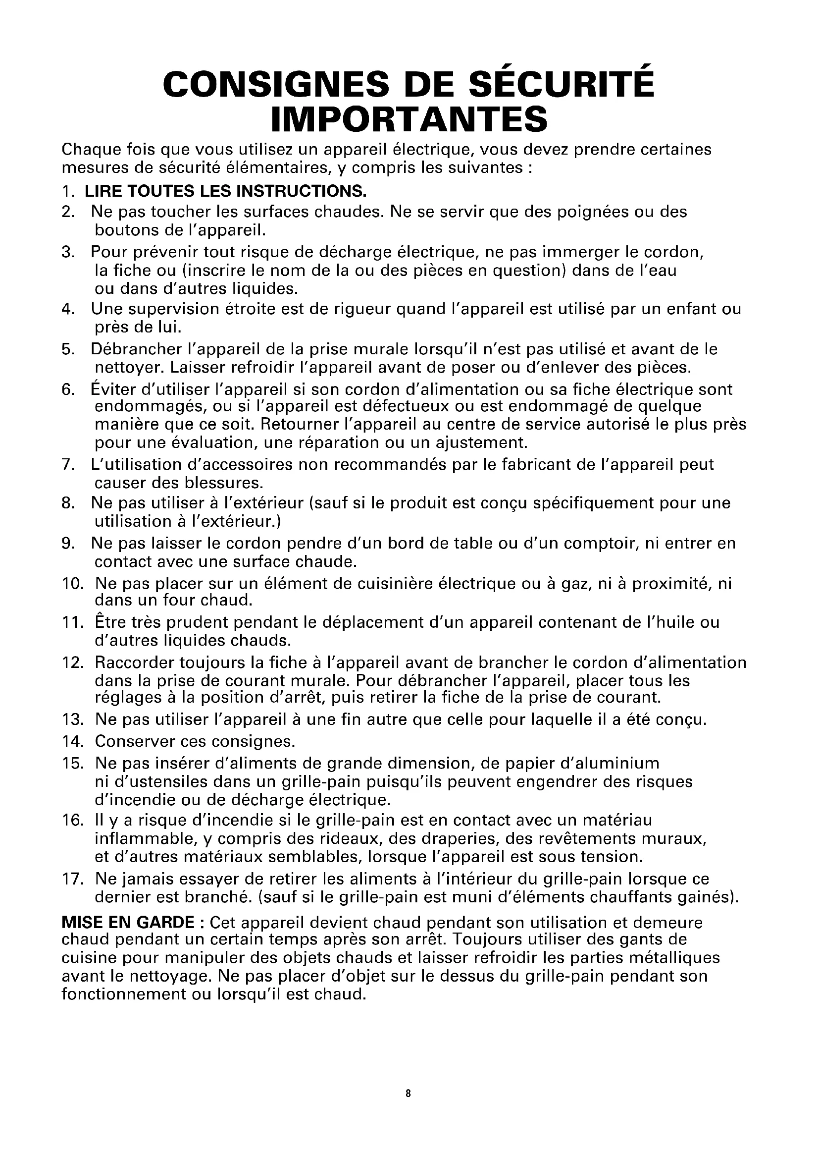 dernier est branché. (sauf si le grille-pain est muni d’éléments chauffants gainés). MISE EN GARDE : Cet appareil devient chaud pendant son utilisation et demeure chaud pendant un certain temps après son arrêt. Toujours utiliser des gants de cuisine pour manipuler des objets chauds et laisser refroidir les parties métalliques avant le nettoyage. Ne pas placer d’objet sur le dessus du grille-pain pendant son fonctionnement ou lorsqu’il est chaud. 8MISE EN GARDE : NE JAMAIS griller de pâtisseries avec garniture ou glaçage susceptible de se liquéer. NE JAMAIS griller de tranche de pain déchirée. NE JAMAIS mettre de pain beurré ou d’aliments emballés dans le grille-pain. NE JAMAIS griller de petits pains, de mini-baguettes, de gressins, etc.