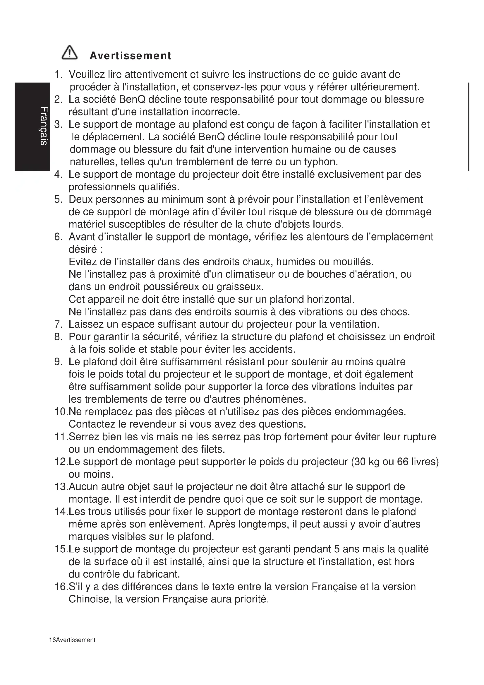 固定Avertissement 16Avertissement Français