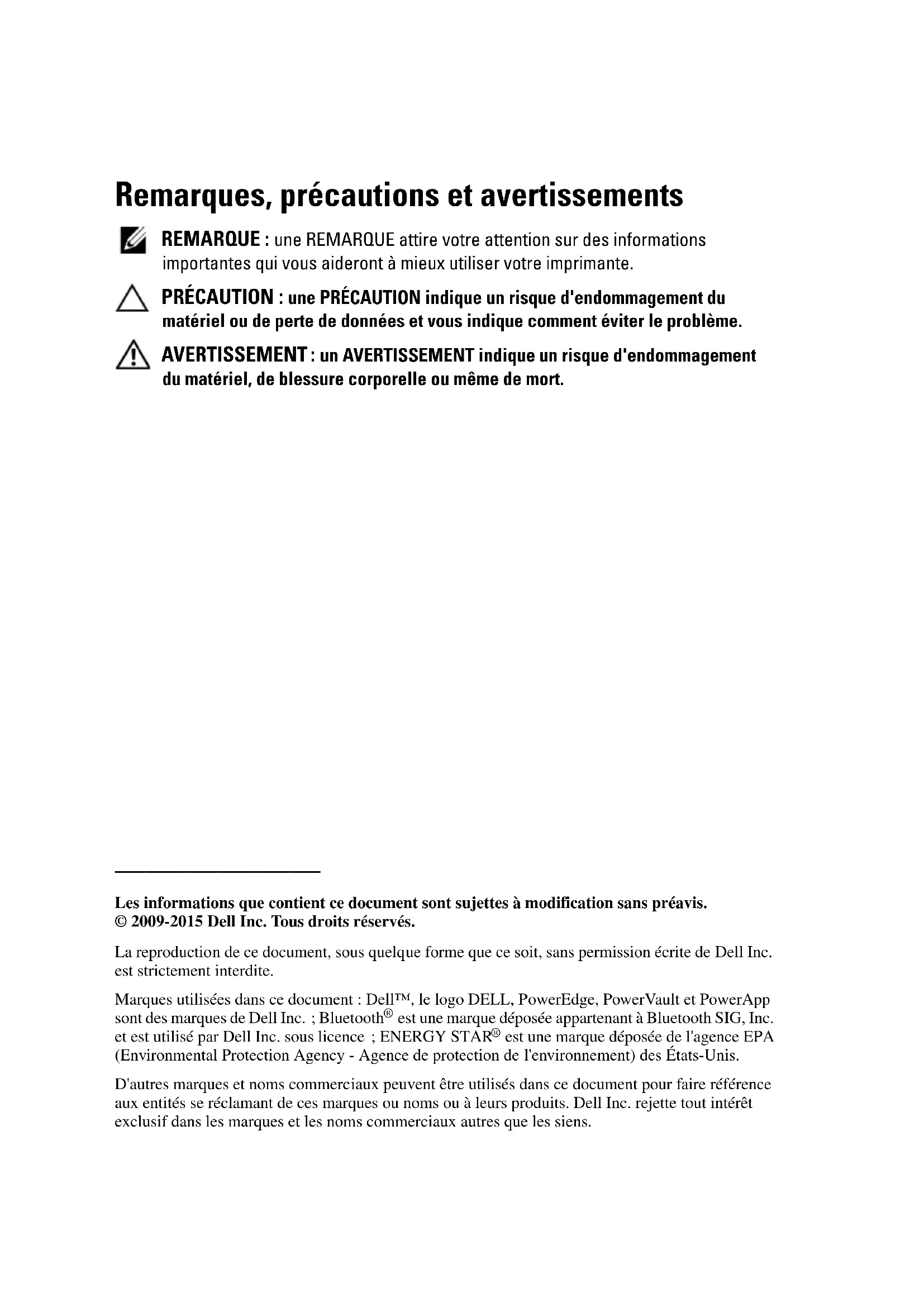 Les informations que contient ce document sont sujettes à modification sans préavis. © 2009-2015 Dell Inc. Tous droits réservés. La reproduction de ce document, sous quelque forme que ce soit, sans permission écrite de Dell Inc. est strictement interdite. Marques utilisées dans ce document : Dell™, le logo DELL, PowerEdge, PowerVault et PowerApp sont des marques de Dell Inc. ; Bluetooth