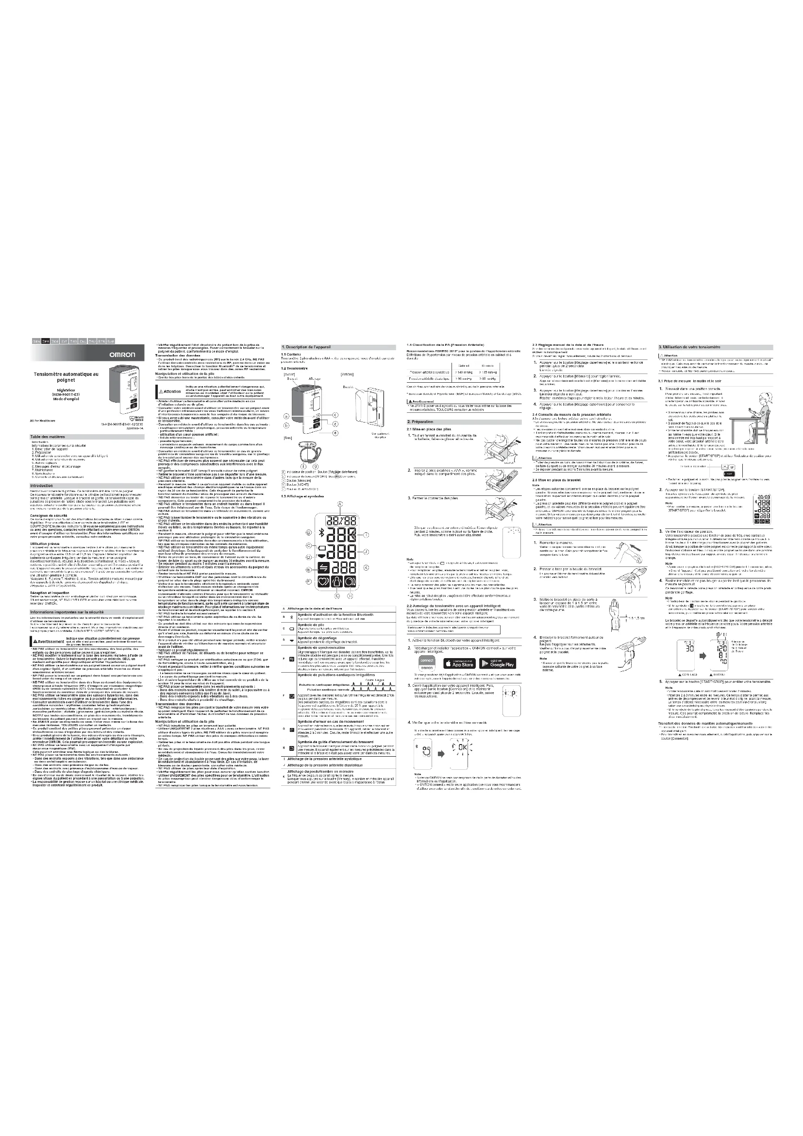 IntroductionInformations importantes sur la sécurité1. Description de l’appareil2. Préparation3. Utilisation du tensiomètre avec un appareil intelligent4. Utilisation de la fonction de mémoire5. Autres réglages6. Messages d’erreur et dépannage7. Maintenance8. Spécifications9. Conseils et déclaration du fabricantMerci d’avoir acheté le NightView. Ce tensiomètre doit être porté au poignet.Ce nouveau tensiomètre fonctionne sur le principe de l’oscillométrie pour mesurer votre pression artérielle. Lorsque le bracelet se gonfle, ce tensiomètre capte les pulsations de pression de l’artère située sous le bracelet. Les pulsations sont appelées pulsations oscillométriques. Le capteur de pression électronique affiche une mesure numérique de la pression artérielle.Consignes de sécuritéCe mode d’emploi vous fournit des informations importantes relatives au tensiomètre NightView. Pour une utilisation sûre et correcte de ce tensiomètre, LIRE et COMPRENDRE toutes ces instructions. Si vous ne comprenez pas ces instructions ou avez des questions, contactez votre détaillant ou votre revendeur OMRON avant d’essayer d’utiliser ce tensiomètre. Pour des informations spécifiques sur votre propre pression artérielle, consultez votre médecin.Utilisation prévueL’appareil est un tensiomètre numérique destiné à être utilisé pour mesurer la pression artérielle et la fréquence du pouls de patients adultes dont la circonférence du poignet se situe entre 13,5 cm et 21,5 cm. L’appareil détecte l’apparition de battements cardiaques irréguliers pendant la mesure et lance un signal d’avertissement lors du résultat. À la discrétion de l’utilisateur, le mode « Mesure nocturne » peut être activé afin d’effectuer automatiquement 3 mesures pendant la nuit. L’appareil mesure la pression artérielle nocturne, que l’utilisateur soit endormi ou éveillé au moment de la prise des mesures*. Il a été conçu essentiellement pour une utilisation générale à domicile. *Asayama K, Fujiwara T, Hoshide S, et al. Tension artérielle nocturne mesurée par des appareils à domicile : preuves et perspectives d’application clinique. J Hypertens. 2019;37(5):905-916.Réception et inspectionRetirer ce tensiomètre de son emballage et vérifier qu’il n’est pas endommagé. S’il est endommagé, NE PAS L’UTILISER et consulter votre détaillant ou votre revendeur OMRON.Lire les informations importantes sur la sécurité dans ce mode d’emploi avant d’utiliser ce tensiomètre.Suivre attentivement le présent mode d’emploi pour votre sécurité.Le conserver pour s’y référer ultérieurement. Pour des informations spécifiques sur votre propre pression artérielle, CONSULTER VOTRE MÉDECIN. Avertissement Indique une situation potentiellement dangereuse qui, si elle n’est pas évitée, peut entraîner la mort ou de graves lésions.