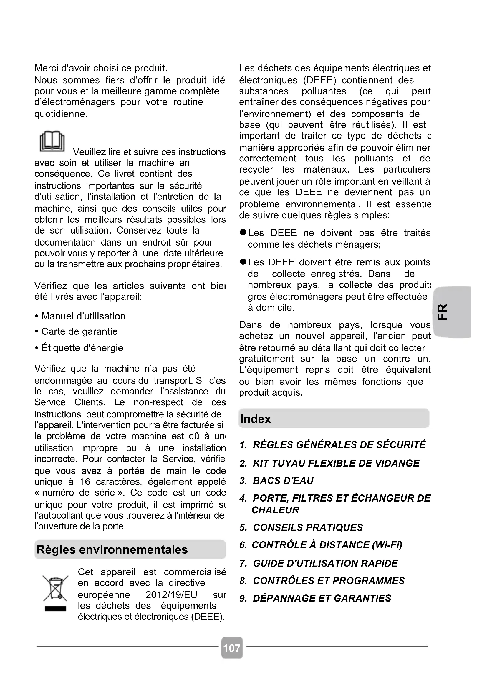 Merci d'avoir choisi ce produit. Nous sommes fiers d’offrir le produit idéal pour vous et la meilleure gamme complète d’électroménagers pour votre routine quotidienne. Veuillez lire et suivre ces instructions avec soin et utiliser la machine en conséquence. Ce livret contient des instructions importantes sur la sécurité d'utilisation, l'installation et l'entretien de la machine, ainsi que des conseils utiles pour obtenir les meilleurs résultats possibles lors de son utilisation. Conservez toute la documentation dans un endroit sûr pour pouvoir vous y reporter à une date ultérieure ou la transmettre aux prochains propriétaires. Vérifiez que les articles suivants ont bien été livrés avec l’appareil: