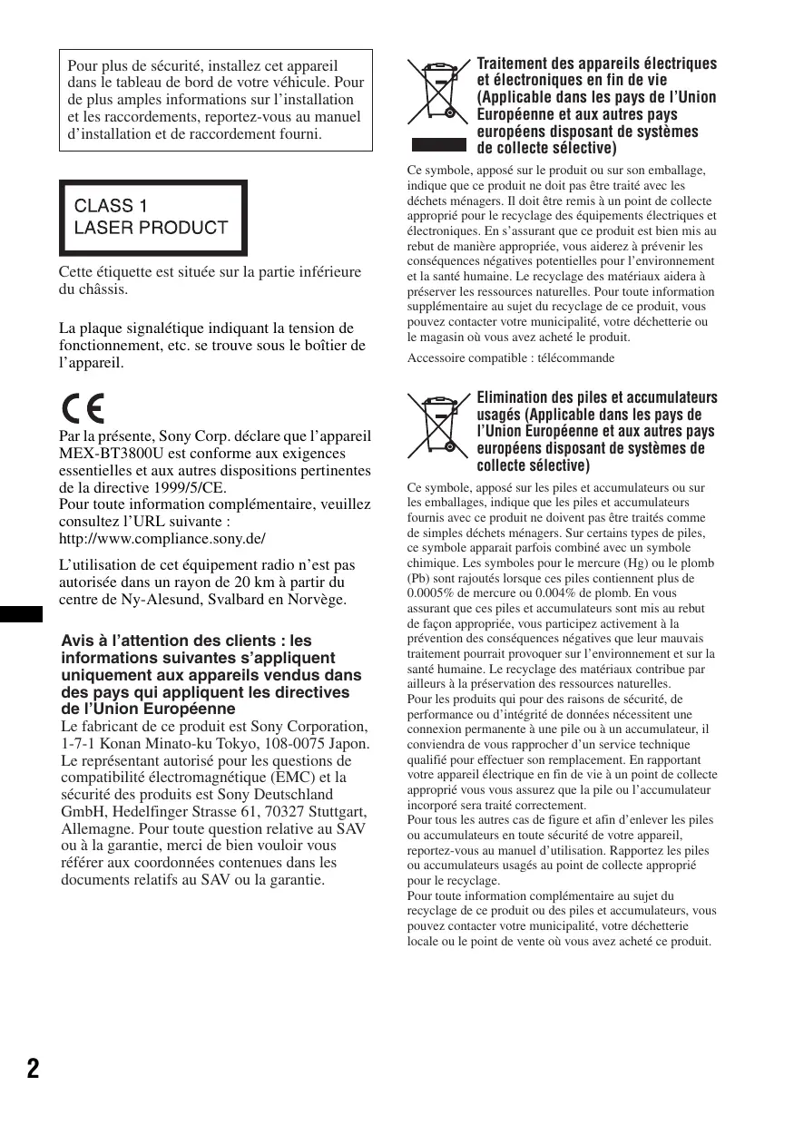 Pour plus de sécurité, installez cet appareil dans le tableau de bord de votre véhicule. Pour de plus amples informations sur l’installation et les raccordements, reportez-vous au manuel d’installation et de raccordement fourni. Cette étiquette est située sur la partie inférieure du châssis. La plaque signalétique indiquant la tension de fonctionnement, etc. se trouve sous le boîtier de l’appareil. Par la présente, Sony Corp. déclare que l’appareil MEX-BT3800U est conforme aux exigences essentielles et aux autres dispositions pertinentes de la directive 1999/5/CE. Pour toute information complémentaire, veuillez consultez l’URL suivante : http://www.compliance.sony.de/ L’utilisation de cet équipement radio n’est pas autorisée dans un rayon de 20 km à partir du centre de Ny-Alesund, Svalbard en Norvège. Avis à l’attention des clients : les informations suivantes s’appliquent uniquement aux appareils vendus dans des pays qui appliquent les directives de l’Union Européenne Le fabricant de ce produit est Sony Corporation, 1-7-1 Konan Minato-ku Tokyo, 108-0075 Japon. Le représentant autorisé pour les questions de compatibilité électromagnétique (EMC) et la sécurité des produits est Sony Deutschland GmbH, Hedelfinger Strasse 61, 70327 Stuttgart, Allemagne. Pour toute question relative au SAV ou à la garantie, merci de bien vouloir vous référer aux coordonnées contenues dans les documents relatifs au SAV ou la garantie.