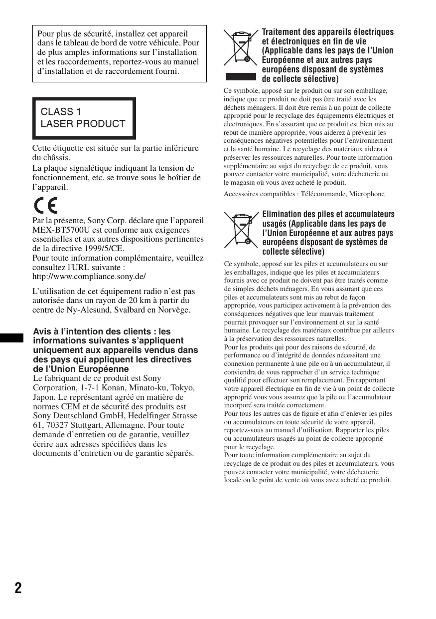Traitement des appareils électriques et électroniques en fin de vie (Applicable dans les pays de l’Union Européenne et aux autres pays européens disposant de systèmes de collecte sélective) Ce symbole, apposé sur le produit ou sur son emballage, indique que ce produit ne doit pas être traité avec les déchets ménagers. Il doit être remis à un point de collecte approprié pour le recyclage des équipements électriques et électroniques. En s’assurant que ce produit est bien mis au rebut de manière appropriée, vous aiderez à prévenir les conséquences négatives potentielles pour l’environnement et la santé humaine. Le recyclage des matériaux aidera à préserver les ressources naturelles. Pour toute information supplémentaire au sujet du recyclage de ce produit, vous pouvez contacter votre municipalité, votre déchetterie ou le magasin où vous avez acheté le produit. Accessoires compatibles : Télécommande, Microphone Elimination des piles et accumulateurs usagés (Applicable dans les pays de l’Union Européenne et aux autres pays européens disposant de systèmes de collecte sélective) Ce symbole, apposé sur les piles et accumulateurs ou sur les emballages, indique que les piles et accumulateurs fournis avec ce produit ne doivent pas être traités comme de simples déchets ménagers. En vous assurant que ces piles et accumulateurs sont mis au rebut de façon appropriée, vous participez activement à la prévention des conséquences négatives que leur mauvais traitement pourrait provoquer sur l’environnement et sur la santé humaine. Le recyclage des matériaux contribue par ailleurs à la préservation des ressources naturelles. Pour les produits qui pour des raisons de sécurité, de performance ou d’intégrité de données nécessitent une connexion permanente à une pile ou à un accumulateur, il conviendra de vous rapprocher d’un service technique qualifié pour effectuer son remplacement. En rapportant votre appareil électrique en fin de vie à un point de collecte approprié vous vous assurez que la pile ou l’accumulateur incorporé sera traitée correctement. Pour tous les autres cas de figure et afin d’enlever les piles ou accumulateurs en toute sécurité de votre appareil, reportez-vous au manuel d’utilisation. Rapporter les piles ou accumulateurs usagés au point de collecte approprié pour le recyclage. Pour toute information complémentaire au sujet du recyclage de ce produit ou des piles et accumulateurs, vous pouvez contacter votre municipalité, votre déchetterie locale ou le point de vente où vous avez acheté ce produit. Remarque sur la pile au lithium N’exposez pas la pile à une chaleur excessive comme à la lumière directe du soleil, au feu ou autre. La marque Bluetooth et les logos appartiennent à Bluetooth SIG, Inc. et sont utilisés sous licence uniquement par Sony Corporation. Les autres marques commerciales et noms commerciaux appartiennent à leurs propriétaires respectifs. ZAPPIN est une marque commerciale de Sony Corporation. Windows Media et le logo Windows sont des marques de commerce ou des marques déposées de Microsoft Corporation aux Etats-Unis et/ou dans d’autres pays. Avertissement au cas où le contact de votre véhicule ne dispose pas d’une position ACC Veillez à activer la fonction arrêt automatique (page 34). L’appareil s’éteint complètement et automatiquement à l’issue d’un délai défini une fois l’appareil mis hors tension, afin d’éviter que la batterie ne se décharge. Si vous n’activez pas la fonction arrêt automatique, appuyez sur la touche (OFF) et maintenez-la enfoncée jusqu’à ce que l’affichage disparaisse chaque fois que vous coupez le contact. iPod est une marque commerciale de Apple Inc. déposée aux Etats-Unis et dans d’autres pays. iPhone est une marque commerciale de Apple Inc. Licence de la technologie de codage audio MPEG Layer-3 et des brevets obtenue de Fraunhofer IIS et Thomson. Ce produit est protégé par des droits de propriété intellectuelle de Microsoft Corporation. Toute utilisation ou diffusion de la technologie décrite sortant du cadre de l’utilisation de ce produit est interdite sans licence accordée par Microsoft ou une filiale autorisée de Microsoft. Les fournisseurs de ce contenu utilisent la technologie de gestion des droits numériques pour Windows Media contenue dans cet appareil (« WM-DRM ») pour protéger l’intégrité de leur contenu (« Contenu sécurisé ») pour que la propriété intellectuelle, y compris les droits d’auteur, de ce contenu, ne soit pas détournée. Cet appareil utilise le logiciel WM-DRM pour lire le contenu sécurisé (« Logiciel WM-DRM »). Si la sécurité du logiciel WM-DRM de cet appareil a été compromise, les propriétaires du contenu sécurisé (« Propriétaires du contenu sécurisé ») peuvent exiger de Microsoft qu’il refuse le droit à WMDRM Software d’acquérir de nouvelles licences pour copier, afficher et/ou lire le contenu sécurisé. La révocation ne modifie pas l’autorisation de WM-DRM Software de lire le contenu non protégé. Une liste des WM-DRM Software révoqués est envoyée sur votre appareil lorsque vous téléchargez une licence relative au contenu sécurisé à partir d’Internet ou d’un PC. Microsoft peut également, conjointement à cette licence, télécharger les listes de révocation sur votre appareil pour le compte des propriétaires du contenu sécurisé.
