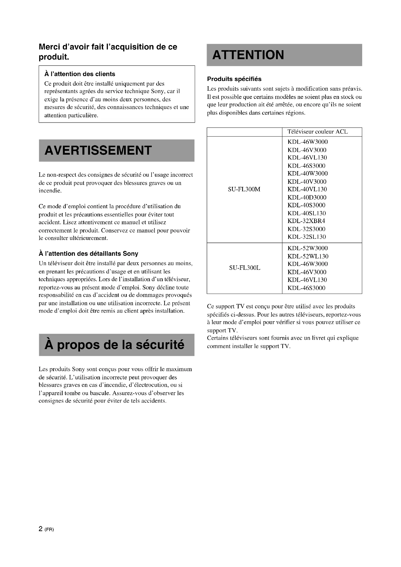 Hang the Center Speaker onto the hook screws as shown. Speaker Hook Screw(+P4 × 15)Speaker Hook SS-CT71/CNP2200 SS-CT72/CT74 Screw(+P4 × 15)Center Speaker2 (FR) Merci d’avoir fait l’acquisition de ce produit. Le non-respect des consignes de sécurité ou l’usage incorrect de ce produit peut provoquer des blessures graves ou un incendie. Ce mode d’emploi contient la procédure d’utilisation du produit et les précautions essentielles pour éviter tout accident. Lisez attentivement ce manuel et utilisez correctement le produit. Conservez ce manuel pour pouvoir le consulter ultérieurement. À l’attention des détaillants Sony Un téléviseur doit être installé par deux personnes au moins, en prenant les précautions d’usage et en utilisant les techniques appropriées. Lors de l’installation d’un téléviseur, reportez-vous au présent mode d’emploi. Sony décline toute responsabilité en cas d’accident ou de dommages provoqués par une installation ou une utilisation incorrecte. Le présent mode d’emploi doit être remis au client après installation. Les produits Sony sont conçus pour vous offrir le maximum de sécurité. L’utilisation incorrecte peut provoquer des blessures graves en cas d’incendie, d’électrocution, ou si l’appareil tombe ou bascule. Assurez-vous d’observer les consignes de sécurité pour éviter de tels accidents. Produits spécifiés Les produits suivants sont sujets à modification sans préavis. Il est possible que certains modèles ne soient plus en stock ou que leur production ait été arrêtée, ou encore qu’ils ne soient plus disponibles dans certaines régions. Ce support TV est conçu pour être utilisé avec les produits spécifiés ci-dessus. Pour les autres téléviseurs, reportez-vous à leur mode d’emploi pour vérifier si vous pouvez utiliser ce support TV. Certains téléviseurs sont fournis avec un livret qui explique comment installer le support TV. À l’attention des clients Ce produit doit être installé uniquement par des représentants agrées du service technique Sony, car il exige la présence d’au moins deux personnes, des mesures de sécurité, des connaissances techniques et une attention particulière. AVERTISSEMENT À propos de la sécurité ATTENTION Téléviseur couleur ACL SU-FL300M KDL-46W3000 KDL-46V3000 KDL-46VL130 KDL-46S3000 KDL-40W3000 KDL-40V3000 KDL-40VL130 KDL-40D3000 KDL-40S3000 KDL-40SL130 KDL-32XBR4 KDL-32S3000 KDL-32SL130 SU-FL300L KDL-52W3000 KDL-52WL130 KDL-46W3000 KDL-46V3000 KDL-46VL130 KDL-46S30003 (FR) Les produits ne doivent être installés que par des représentants agréés du service technique Sony. Le téléviseur et son support sont très lourds ; toute installation par un tiers non agréé risque de provoquer des blessures graves. Assurez-vous de prendre toutes les mesures nécessaires afin d’éviter que le support TV ne bascule. Dans le cas contraire, le téléviseur risque de basculer et de provoquer des blessures. Ancrez le téléviseur sur un mur, etc., afin d’éviter qu’il ne bascule. Assurez-vous d’installer le support TV sur une surface plane et solide. N’installez pas le support TV s’il penche d’un côté. Sinon, le support TV risque de basculer ou le téléviseur risque de tomber. Vous pourriez endommager le téléviseur ou vous blesser. Si vous installez le support TV sur une surface moelleuse, comme un tapis ou une moquette, posez au préalable une plaque à l’emplacement concerné. N’utilisez pas de support TV fissuré. Ne vous appuyez pas sur le téléviseur et ne vous y suspendez pas. Le support TV risque de basculer et le téléviseur risque de tomber, ce qui peut provoquer des blessures graves, voire la mort. Assurez-vous que les enfants ne grimpent pas sur le support TV et empêchez-les de se faufiler entre les étagères. Si des enfants grimpent sur le support TV ou sur les étagères, ils risquent de briser le verre, de faire basculer le support TV ou de faire basculer le téléviseur, ce qui peut provoquer des blessures graves, voire la mort. Ne montez pas sur le support TV. Vous risquez de tomber ou de briser le verre et de vous blesser. Ne bouchez pas les orifices de ventilation du téléviseur. Si vous couvrez les orifices de ventilation du téléviseur (avec un drap ou autre), le téléviseur risque de surchauffer et de provoquer un incendie. Assurez-vous de ne pas coincer le cordon d’alimentation CA ou le câble de raccordement.