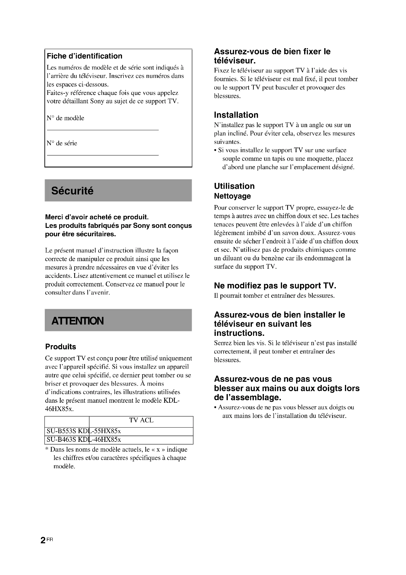 - Assurez-vous de ne pas vous blesser aux doigts ou aux mains lors de l’installation du téléviseur. Fiche d’identification Les numéros de modèle et de série sont indiqués à l’arrière du téléviseur. Inscrivez ces numéros dans les espaces ci-dessous. Faites-y référence chaque fois que vous appelez votre détaillant Sony au sujet de ce support TV. N° de modèle N° de série Sécurité ATTENTION TV ACL SU-B553S KDL-55HX85x SU-B463S KDL-46HX85x3