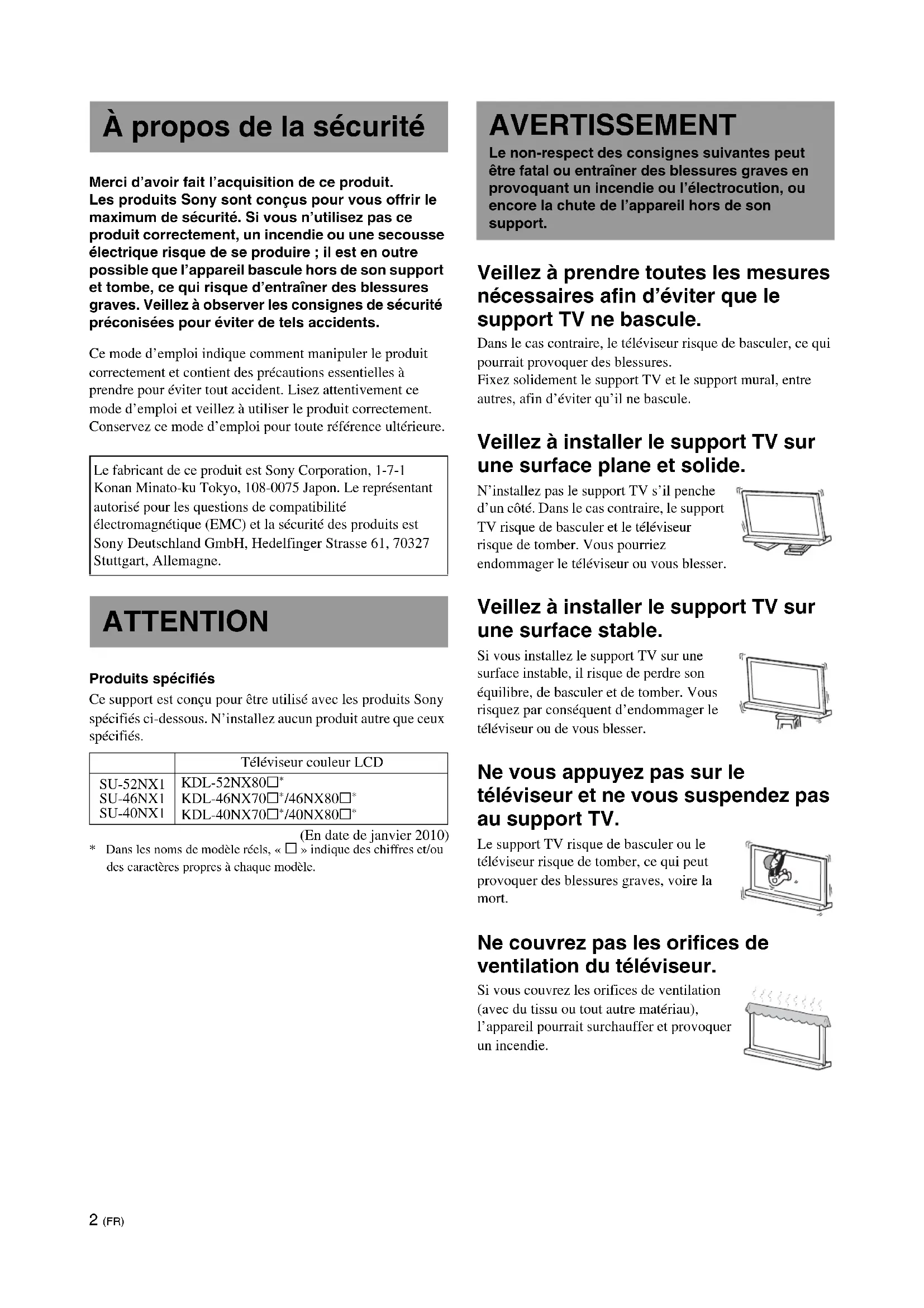 - Dans les noms de modèle réels, « s » indique des chiffres et/ou des caractères propres à chaque modèle. Veillez à prendre toutes les mesures nécessaires afin d’éviter que le support TV ne bascule. Dans le cas contraire, le téléviseur risque de basculer, ce qui pourrait provoquer des blessures. Fixez solidement le support TV et le support mural, entre autres, afin d’éviter qu’il ne bascule. Veillez à installer le support TV sur une surface plane et solide. N’installez pas le support TV s’il penche d’un côté. Dans le cas contraire, le support TV risque de basculer et le téléviseur risque de tomber. Vous pourriez endommager le téléviseur ou vous blesser. Veillez à installer le support TV sur une surface stable. Si vous installez le support TV sur une surface instable, il risque de perdre son équilibre, de basculer et de tomber. Vous risquez par conséquent d’endommager le téléviseur ou de vous blesser. Ne vous appuyez pas sur le téléviseur et ne vous suspendez pas au support TV. Le support TV risque de basculer ou le téléviseur risque de tomber, ce qui peut provoquer des blessures graves, voire la mort. Ne couvrez pas les orifices de ventilation du téléviseur. Si vous couvrez les orifices de ventilation (avec du tissu ou tout autre matériau), l’appareil pourrait surchauffer et provoquer un incendie. À propos de la sécurité Le fabricant de ce produit est Sony Corporation, 1-7-1 Konan Minato-ku Tokyo, 108-0075 Japon. Le représentant autorisé pour les questions de compatibilité électromagnétique (EMC) et la sécurité des produits est Sony Deutschland GmbH, Hedelfinger Strasse 61, 70327 Stuttgart, Allemagne. ATTENTION Téléviseur couleur LCD SU-52NX1 SU-46NX1 SU-40NX1 KDL-52NX80s