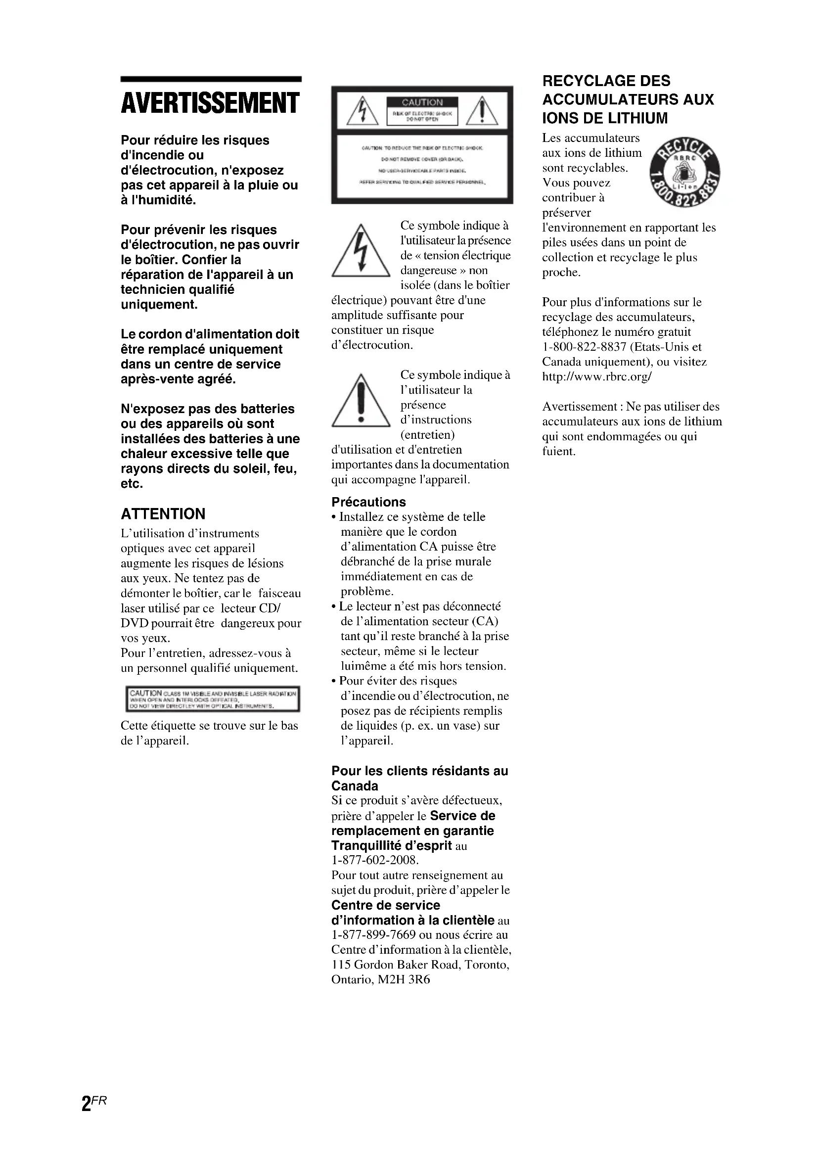 - Pour éviter des risques d’incendie ou d’électrocution, ne posez pas de récipients remplis de liquides (p. ex. un vase) sur l’appareil. Pour les clients résidants au Canada Si ce produit s’avère défectueux, prière d’appeler le Service de remplacement en garantie Tranquillité d’esprit au 1-877-602-2008. Pour tout autre renseignement au sujet du produit, prière d’appeler le Centre de service d’information à la clientèle au 1-877-899-7669 ou nous écrire au Centre d’information à la clientèle, 115 Gordon Baker Road, Toronto, Ontario, M2H 3R6 RECYCLAGE DES ACCUMULATEURS AUX