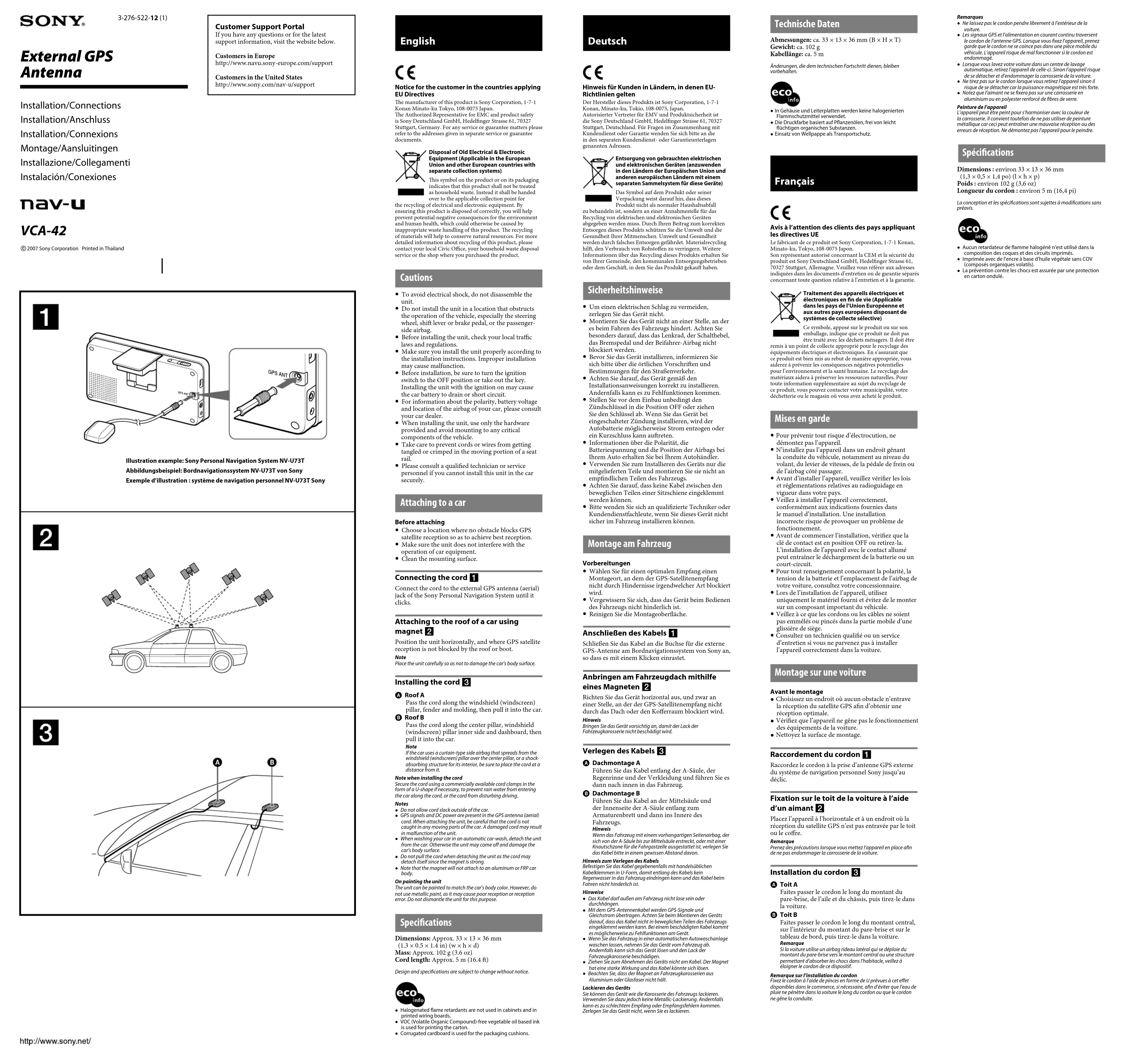 Placez l’appareil à l’horizontale et à un endroit où la réception du satellite GPS n’est pas entravée par le toit ou le coffre.RemarquePrenez des précautions lorsque vous mettez l’appareil en place afin de ne pas endommager la carrosserie de la voiture. Installation du cordon Toit AFaites passer le cordon le long du montant du pare-brise, de l’aile et du châssis, puis tirez-le dans la voiture. Toit BFaites passer le cordon le long du montant central, sur l’intérieur du montant du pare-brise et sur le tableau de bord, puis tirez-le dans la voiture.RemarqueSi la voiture utilise un airbag rideau latéral qui se déploie du montant du pare-brise vers le montant central ou une structure permettant d’absorber les chocs dans l’habitacle, veillez à éloigner le cordon de ce dispositif.Remarque sur l’installation du cordonFixez le cordon à l’aide de pinces en forme de U prévues à cet effet disponibles dans le commerce, si nécessaire, afin d’éviter que l’eau de pluie ne pénètre dans la voiture le long du cordon ou que le cordon ne gêne la conduite.Remarques Ne laissez pas le cordon pendre librement à l’extérieur de la voiture. Les signaux GPS et l’alimentation en courant continu traversent le cordon de l’antenne GPS. Lorsque vous fixez l’appareil, prenez garde que le cordon ne se coince pas dans une pièce mobile du véhicule. L’appareil risque de mal fonctionner si le cordon est endommagé. Lorsque vous lavez votre voiture dans un centre de lavage automatique, retirez l’appareil de celle-ci. Sinon l’appareil risque de se détacher et d’endommager la carrosserie de la voiture. Ne tirez pas sur le cordon lorsque vous retirez l’appareil sinon il risque de se détacher car la puissance magnétique est très forte. Notez que l’aimant ne se fixera pas sur une carrosserie en aluminium ou en polyester renforcé de fibres de verre.Peinture de l’appareilL’appareil peut être peint pour s’harmoniser avec la couleur de la carrosserie. Il convient toutefois de ne pas utiliser de peinture métallique car ceci peut entraîner une mauvaise réception ou des erreurs de réception. Ne démontez pas l’appareil pour le peindre. Spécifications Dimensions : environ 33 × 13 × 36 mm (1,3 × 0,5 × 1,4 po) (l × h × p)Poids : environ 102 g (3,6 oz)Longueur du cordon : environ 5 m (16,4 pi)La conception et les spécifications sont sujettes à modifications sans préavis. Aucun retardateur de flamme halogéné n’est utilisé dans la composition des coques et des circuits imprimés. Imprimée avec de l’encre à base d’huile végétale sans COV (composés organiques volatils). La prévention contre les chocs est assurée par une protection en carton ondulé.Illustration example: Sony Personal Navigation System NV-U73TAbbildungsbeispiel: Bordnavigationssystem NV-U73T von Sony Exemple d’illustration : système de navigation personnel NV-U73T SonySONY VCA-42 (GB,DE,FR,NL,IT,ES) 3-276-522-12 (1) SONY VCA-42 (GB,DE,FR,NL,IT,ES) 3-276-522- 12 (1) Česky Upozornění pro zákazníky, na které se vztahují směrnice EU Výrobcem tohoto produktu je společnost Sony Corporation, 1-7-1 Konan Minato-ku Tokyo, 108-0075 Japonsko.Oprávněným zástupcem pro EMC a bezpečnost produktů je společnost Sony Deutschland GmbH, Hedelfinger Strasse 61, 70327 Stuttgart, Německo. S otázkami týkajícími se servisu či záruky se obracejte na adresy uvedené ve zvláštních servisních či záručních dokumentech. Dansk Bemærkning til kunder i lande, hvor EU- direktiverne gælder Producenten af dette produkt er Sony Corporation, 1-7-1 Konan Minato-ku Tokyo, 108-0075 Japan.Den autoriserede repræsentant for EMC og produktsikkerhed er Sony Deutschland GmbH, Hedelfinger Strasse 61, 70327 Stuttgart, Germany. Se de angivne adresser i de separate service- og garantidokumenter angående service og garanti. Eesti Märkus klientidele riikides, kus kehtivad EL-i direktiivid Selle toote valmistaja on Sony Corporation, 1-7-1 Konan Minato-ku Tokyo, 108-0075 Japan.EMÜ ja tooteohutuse volitatud esindaja on Sony Deutschland GmbH, Hedelfinger Strasse 61, 70327 Stuttgart, Germany. Teenindus- või garantiiküsimustes pöörduge palun eriteeninduses või garantiidokumentides antud aadressidele. Latviski Paziņojums klientiem valstīs, kur ir spēkā ES direktīvas Šī produkta ražotājs ir Sony Corporation, 1-7-1 Konan Minato-ku Tokyo, 108-0075 Japāna.Pilnvarotais EMC un produktu drošības pārstāvis ir Sony Deutschland GmbH, Hedelfinger Strasse 61, 70327 Stuttgart, Vācija. Jebkādiem jautājumiem, kas saistīti ar pakalpojumiem vai garantiju, lūdzu, skatiet adreses, kas sniegtas atsevišķos pakalpojumu vai garantijas dokumentos. Nederlands Kennisgeving voor klanten in de landen waar EU- richtlijnen van toepassing zijn De fabrikant van dit product is Sony Corporation, 1-7-1 Konan Minato-ku Tokio, 108-0075 Japan.De geautoriseerde vertegenwoordiger voor EMC en productveiligheid is Sony Deutschland GmbH, Hedelfinger Strasse 61, 70327 Stuttgart, Duitsland. Voor zaken met betrekking tot onderhoud of garantie kunt u contact opnemen met de adressen die worden vermeld in de afzonderlijke onderhouds- of garantiedocumenten.Verwijdering van oude elektrische en elektronische apparaten (Toepasbaar in de Europese Unie en andere Europese landen met gescheiden ophaalsystemen)Het symbool op het product of op de verpakking wijst erop dat dit product niet als huishoudelijk afval mag worden behandeld. Het moet echter naar een plaats worden gebracht waar elektrische en elektronische apparatuur wordt gerecycled. Als u ervoor zorgt dat dit product op de correcte manier wordt verwijderd, voorkomt u voor mens en milieu negatieve gevolgen die zich zouden kunnen voordoen in geval van verkeerde afvalbehandeling. De recycling van materialen draagt bij tot het vrijwaren van natuurlijke bronnen. Voor meer details in verband met het recyclen van dit product, neemt u contact op met de gemeentelijke inst