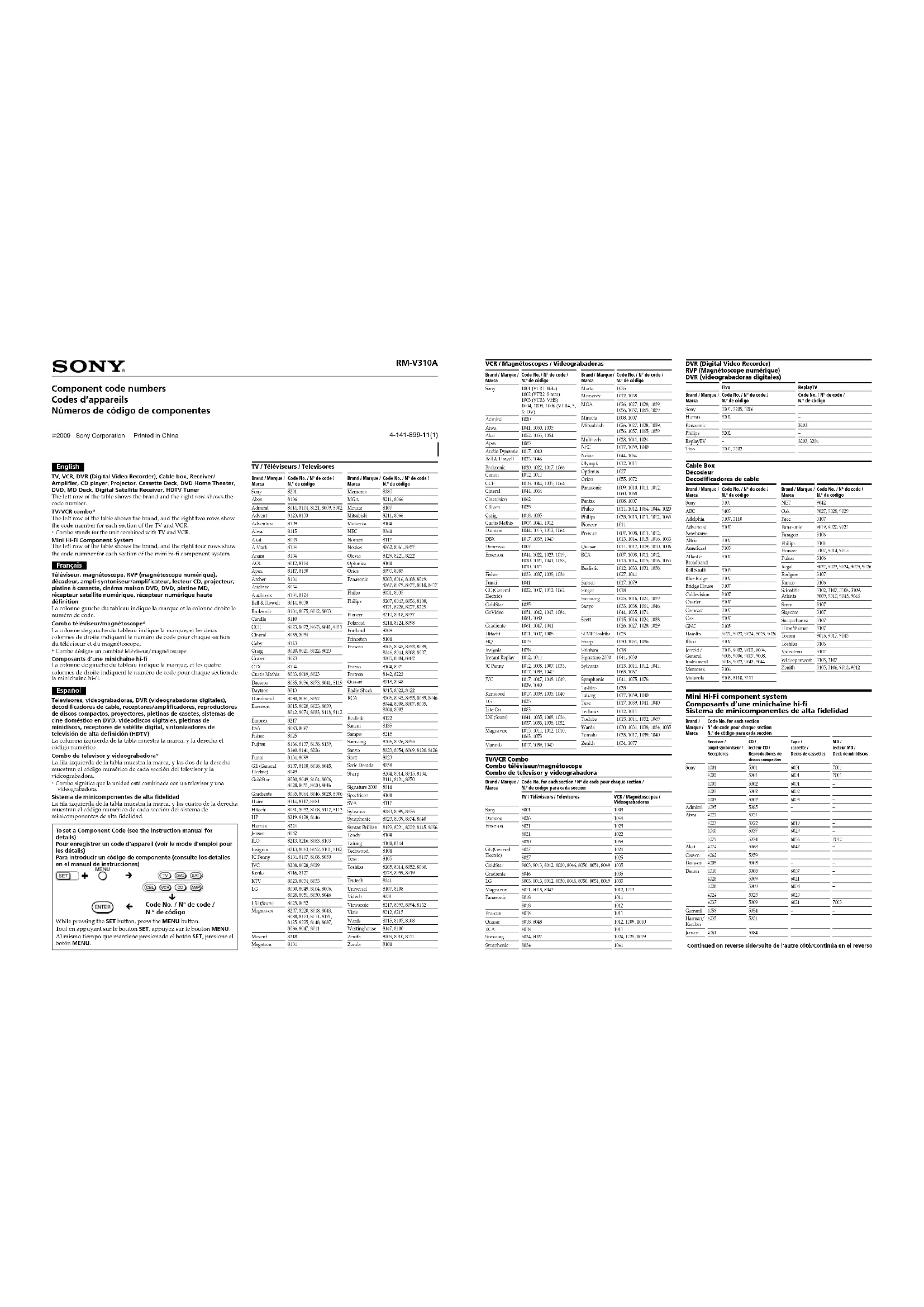 RMV310A - Télécommande SONY - Notice d'utilisation et mode d'emploi gratuit