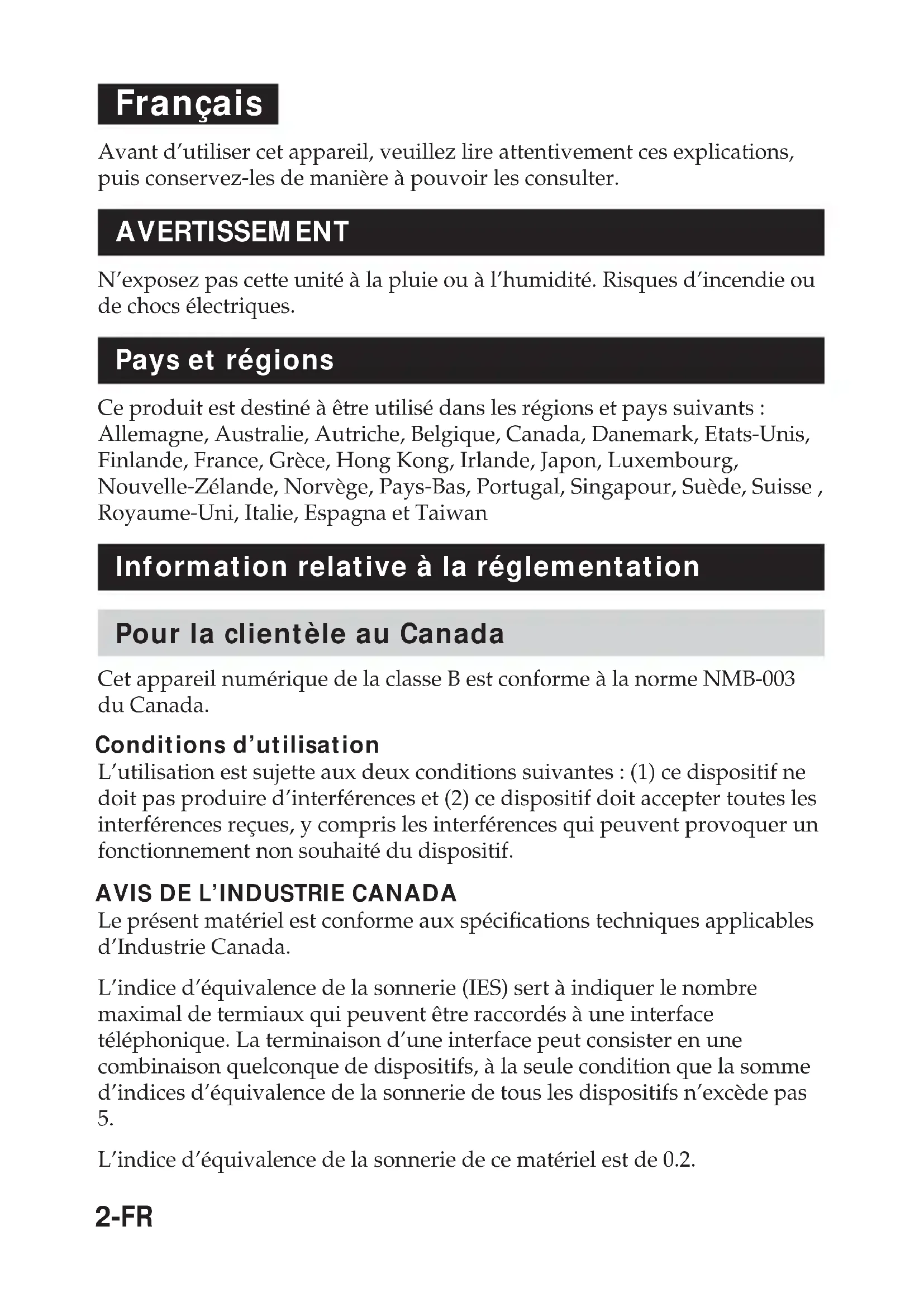 Le présent matériel est conforme aux spécifications techniques applicables d’Industrie Canada. L’indice d’équivalence de la sonnerie (IES) sert à indiquer le nombre maximal de termiaux qui peuvent être raccordés à une interface téléphonique. La terminaison d’une interface peut consister en une combinaison quelconque de dispositifs, à la seule condition que la somme d’indices d’équivalence de la sonnerie de tous les dispositifs n’excède pas