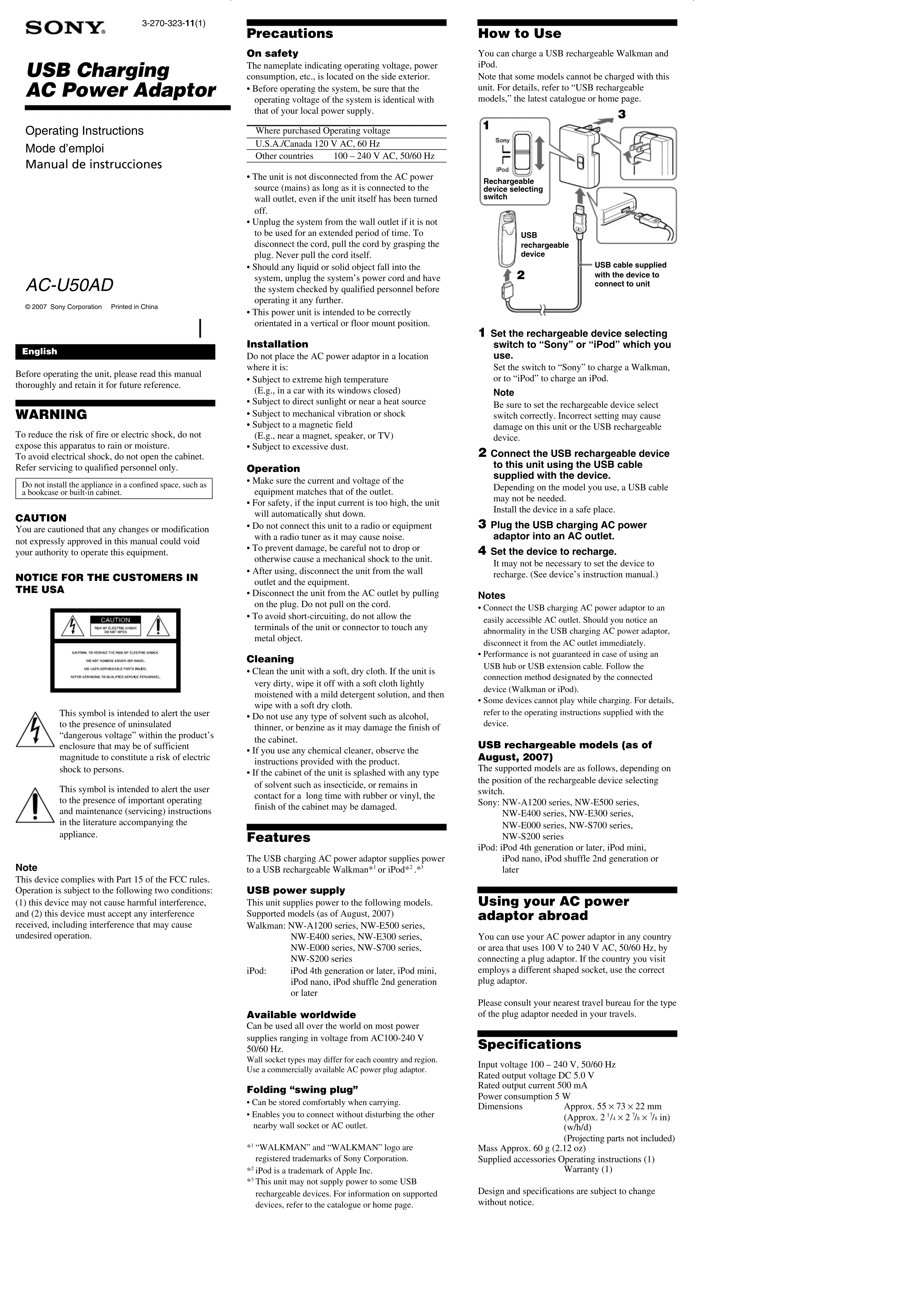 Alimentation USB Cet appareil alimente les modèles ci-dessous. Modèles compatibles (au mois d’août 2007) Walkman : Série NW-A1200, série NW-E500, série NW-E400, série NW-E300, série NW-E000, série NW-S700, série NW-S200 iPod : iPod 4ème génération ou ultérieure, iPod mini, iPod nano, iPod shuffle 2ème génération ou ultérieure Disponible dans le monde entier Cet appareil peut être utilisé partout dans le monde, sur la plupart des plages d’alimentation comprises entre 100 et 240 V CA, 50/60 Hz. Les types de prise murale peuvent varier selon le pays et la région. Utilisez un adaptateur de fiche CA disponible dans le commerce. Fiche « pivotante » pliable