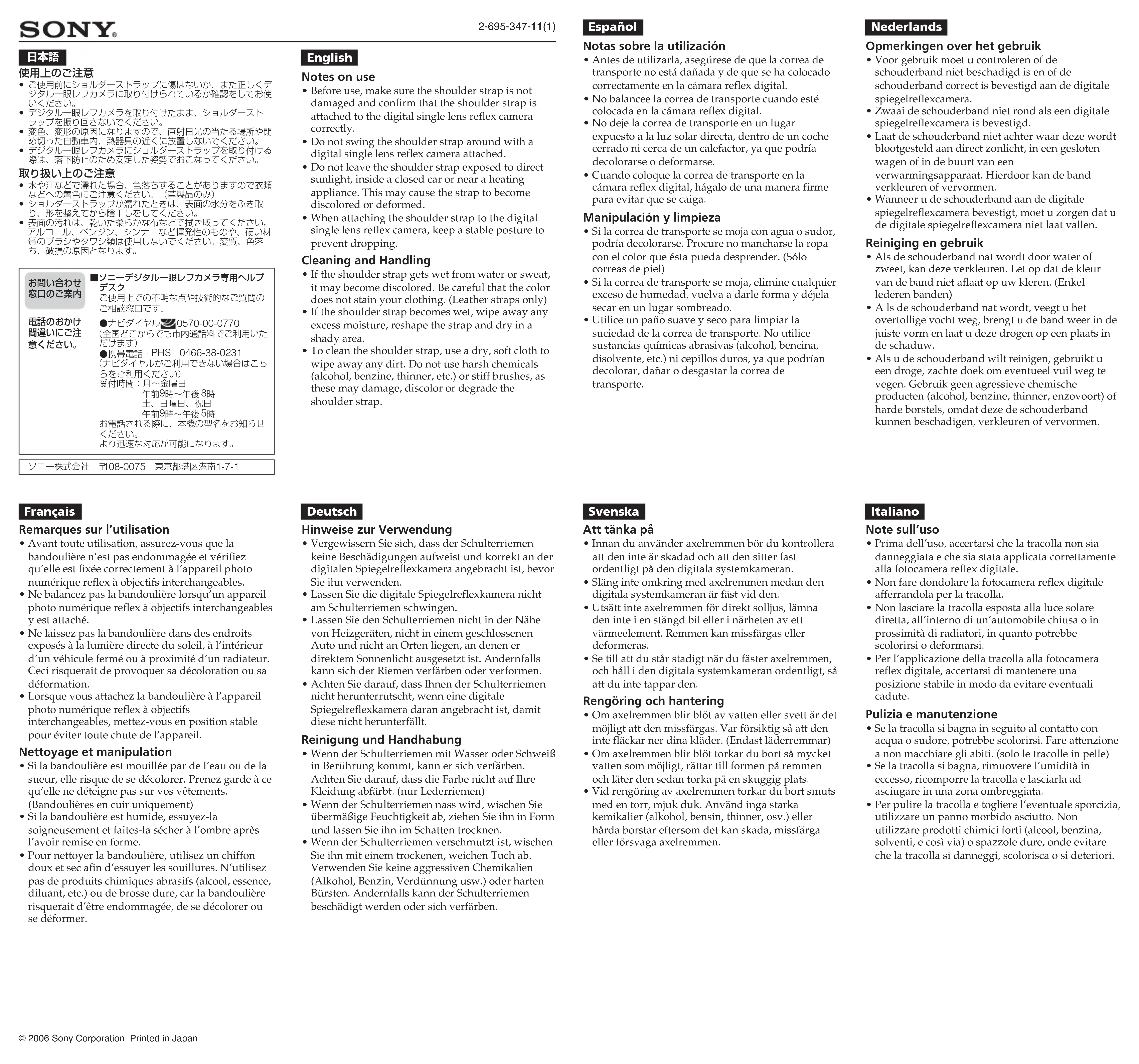 - Si la bandoulière est mouillée par de l’eau ou de la sueur, elle risque de se décolorer. Prenez garde à ce qu’elle ne déteigne pas sur vos vêtements. (Bandoulières en cuir uniquement)