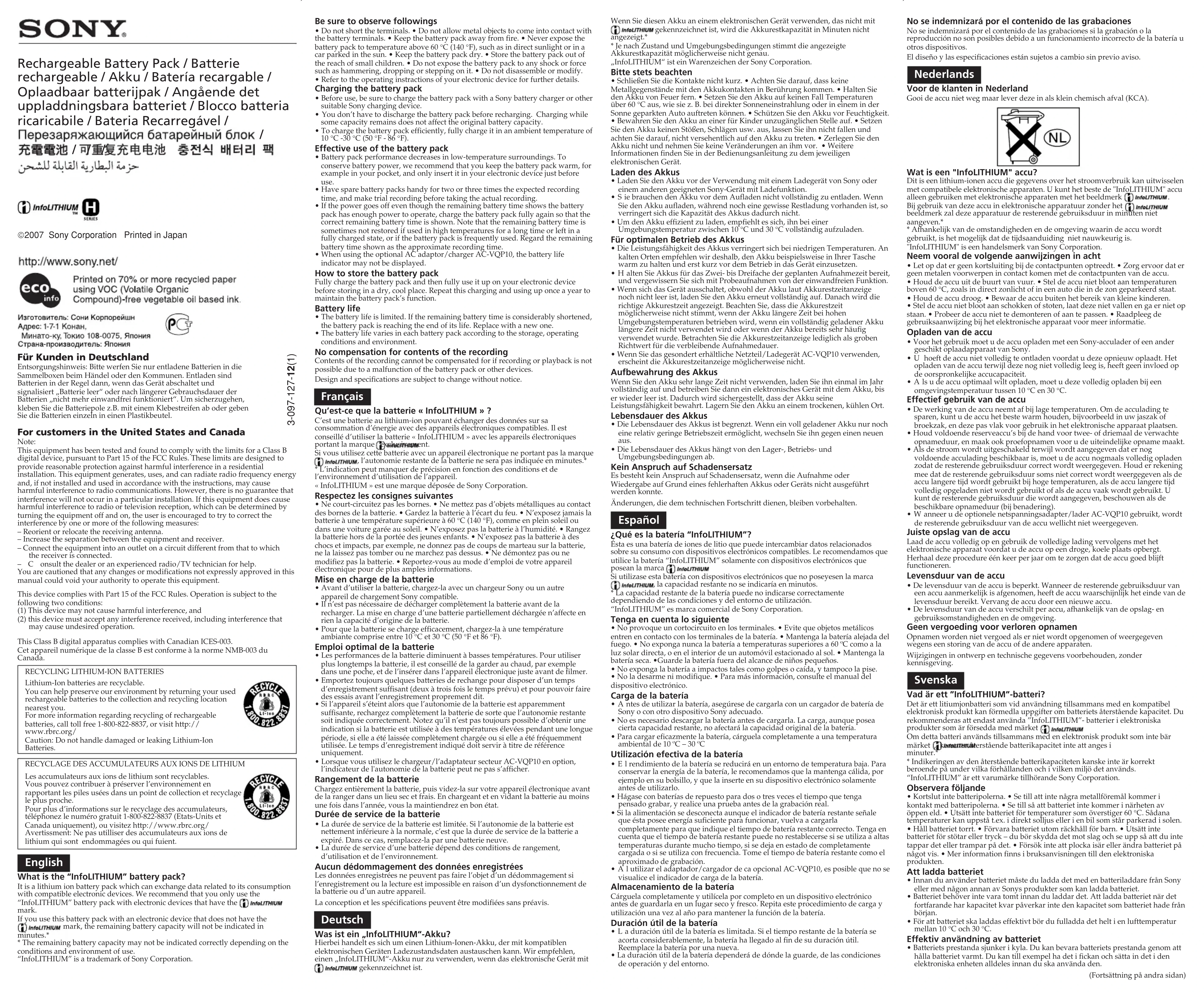 - La durée de service de la batterie est limitée. Si l’autonomie de la batterie estnettement inférieure à la normale, c’est que la durée de service de la batterie aexpiré. Dans ce cas, remplacez-la par une batterie neuve.• La durée de service d’une batterie dépend des conditions de rangement,d’utilisation et de l’environnement. Aucun dédommagement des données enregistrées Les données enregistrées ne peuvent pas faire l’objet d’un dédommagement sil’enregistrement ou la lecture est impossible en raison d’un dysfonctionnement dela batterie ou d’un autre appareil.La conception et les spécifications peuvent être modifiées sans préavis. Deutsch Was ist ein „InfoLITHIUM“-Akku? Hierbei handelt es sich um einen Lithium-Ionen-Akku, der mit kompatiblenelektronischen Geräten Ladezustandsdaten austauschen kann. Wir empfehlen,einen „InfoLITHIUM“-Akku nur zu verwenden, wenn das elektronische Gerät mit gekennzeichnet ist.Wenn Sie diesen Akku an einem elektronischen Gerät verwenden, das nicht mit gekennzeichnet ist, wird die Akkurestkapazität in Minuten nichtangezeigt.** Je nach Zustand und Umgebungsbedingungen stimmt die angezeigteAkkurestkapazität möglicherweise nicht genau.„InfoLITHIUM“ ist ein Warenzeichen der Sony Corporation. Bitte stets beachten
