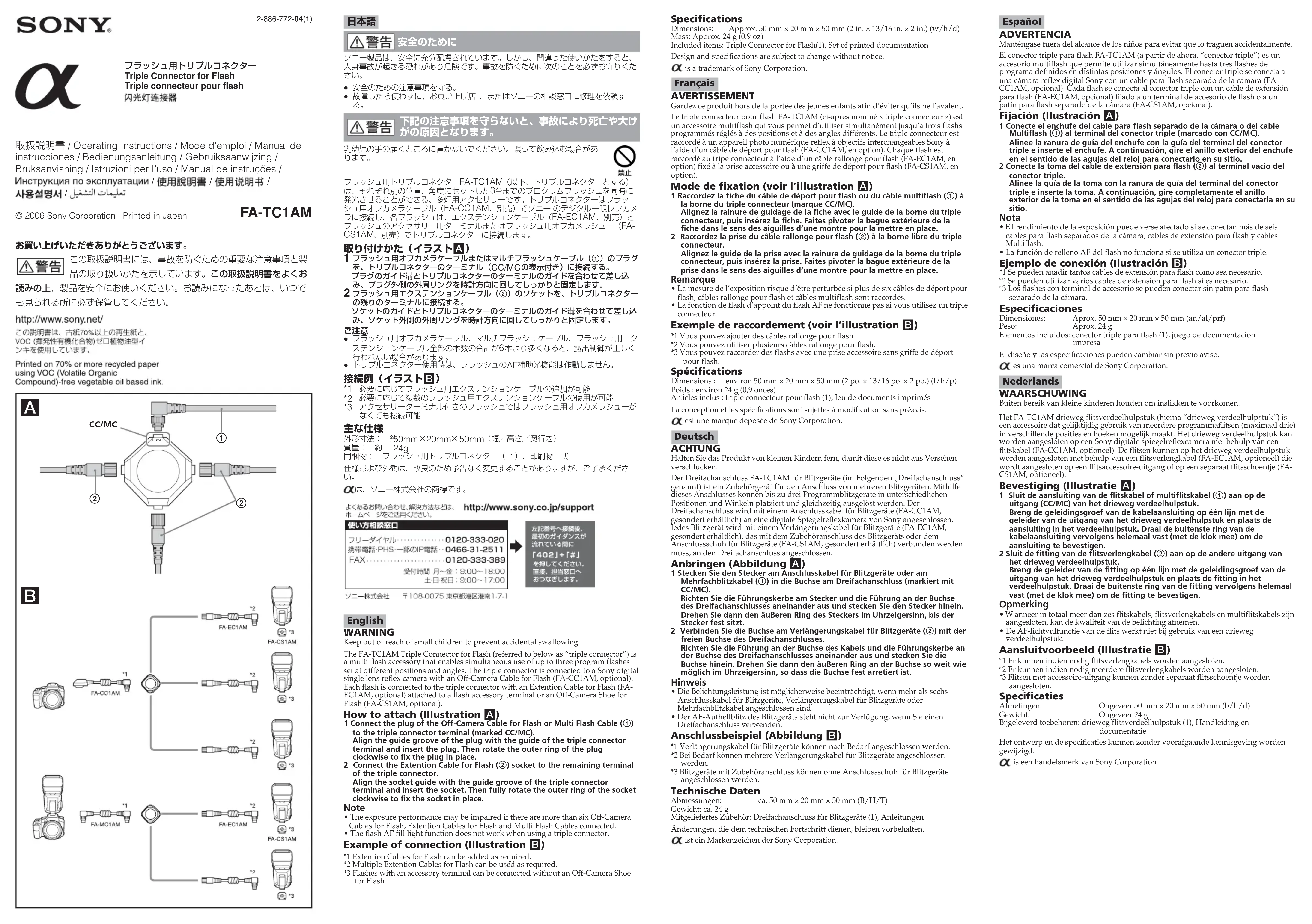 Specifications Dimensions: Approx. 50 mm × 20 mm × 50 mm (2 in. × 13/16 in. × 2 in.) (w/h/d) Mass: Approx. 24 g (0.9 oz)Included items: Triple Connector for Flash(1), Set of printed documentationDesign and specifications are subject to change without notice. is a trademark of Sony Corporation. Français AVERTISSEMENT Gardez ce produit hors de la portée des jeunes enfants afin d’éviter qu’ils ne l’avalent.Le triple connecteur pour flash FA-TC1AM (ci-après nommé « triple connecteur ») estun accessoire multiflash qui vous permet d’utiliser simultanément jusqu’à trois flashsprogrammés réglés à des positions et à des angles différents. Le triple connecteur estraccordé à un appareil photo numérique reflex à objectifs interchangeables Sony àl’aide d’un câble de déport pour flash (FA-CC1AM, en option). Chaque flash estraccordé au tripe connecteur à l’aide d’un câble rallonge pour flash (FA-EC1AM, enoption) fixé à la prise accessoire ou à une griffe de déport pour flash (FA-CS1AM, enoption). Mode de fixation (voir l’illustration A) 1 Raccordez la fiche du câble de déport pour flash ou du câble multiflash (1) àla borne du triple connecteur (marque CC/MC).Alignez la rainure de guidage de la fiche avec le guide de la borne du tripleconnecteur, puis insérez la fiche. Faites pivoter la bague extérieure de lafiche dans le sens des aiguilles d’une montre pour la mettre en place. 2 Raccordez la prise du câble rallonge pour flash (2) à la borne libre du triple connecteur.Alignez le guide de la prise avec la rainure de guidage de la borne du tripleconnecteur, puis insérez la prise. Faites pivoter la bague extérieure de laprise dans le sens des aiguilles d’une montre pour la mettre en place. Remarque