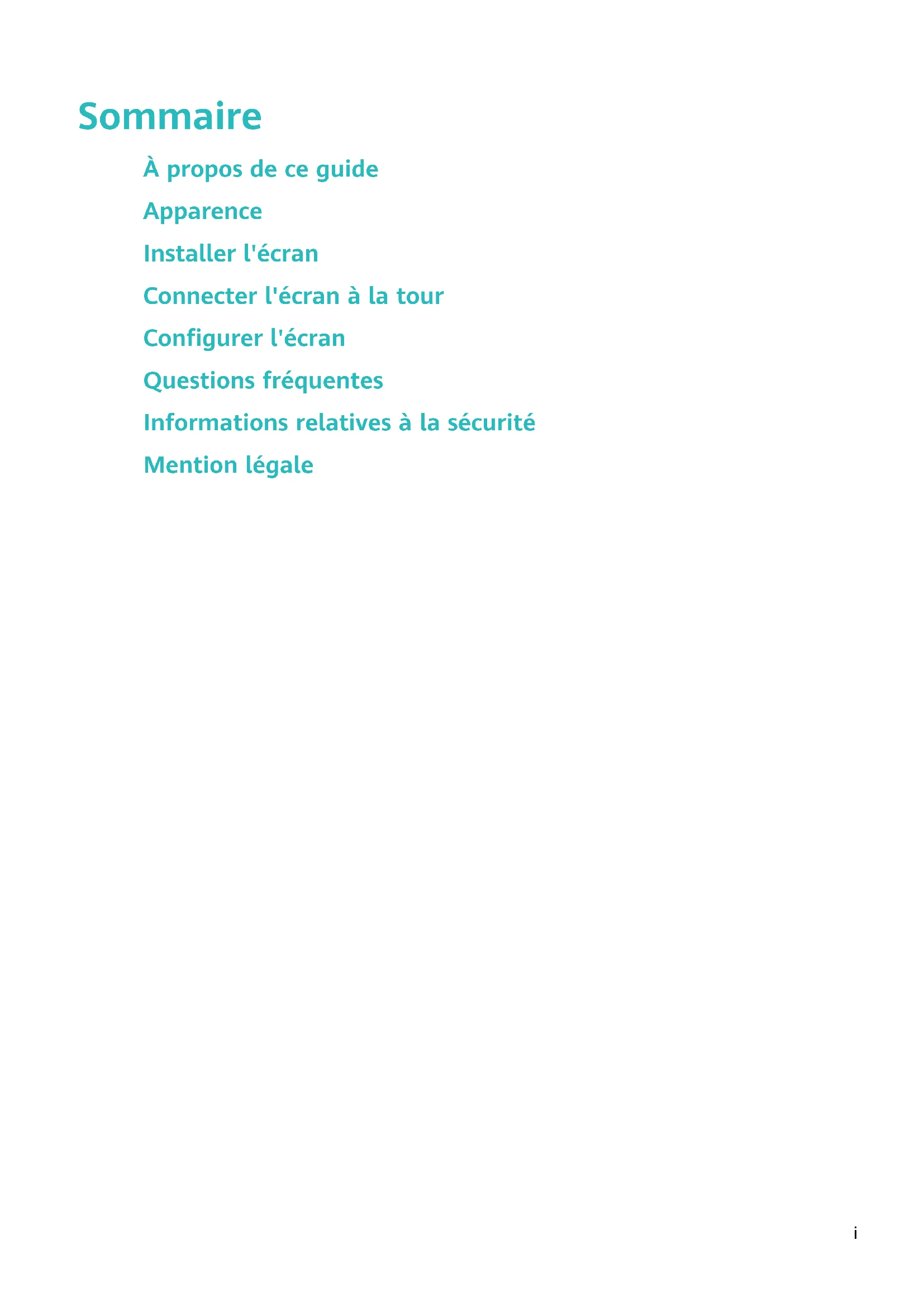 Guide d'utilisationSommaire À propos de ce guide Apparence Installer l'écran Connecter l'écran à la tour Congurer l'écran Questions fréquentes Informations relatives à la sécurité Mention légale iÀ propos de ce guide Le présent document s'applique uniquement aux appareils associés. Lisez attentivement ce document avant d'utiliser l'appareil. Les composants énumérés dans ce document ne sont pas forcément inclus dans l'appareil. Si c'est le cas, vous devrez les acheter séparément. Les fonctions décrites dans ce document ne peuvent être utilisées que lorsqu'elles sont utilisées avec les autres composants. Les illustrations et les éléments d'interface utilisateur montrés dans ce document ne reètent pas forcément l'apparence eective de l'appareil. Toutes les illustrations sont donnés à titre indicatif uniquement. Symboles et dénitions Souligne des informations ou des conseils importants et fournit des informations complémentaires. Indique des problèmes potentiels qui peuvent survenir, comme l'endommagement de l'appareil ou la perte de données. 1Apparence