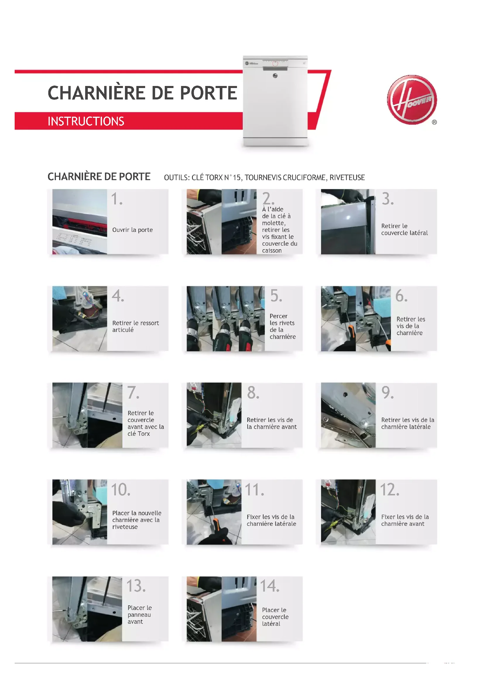 Retirer le couvercle avant avec la clé TorxRetirer les vis de la charnière avant Retirer les vis de la charnière latérale Placer la nouvelle charnière avec la riveteuse