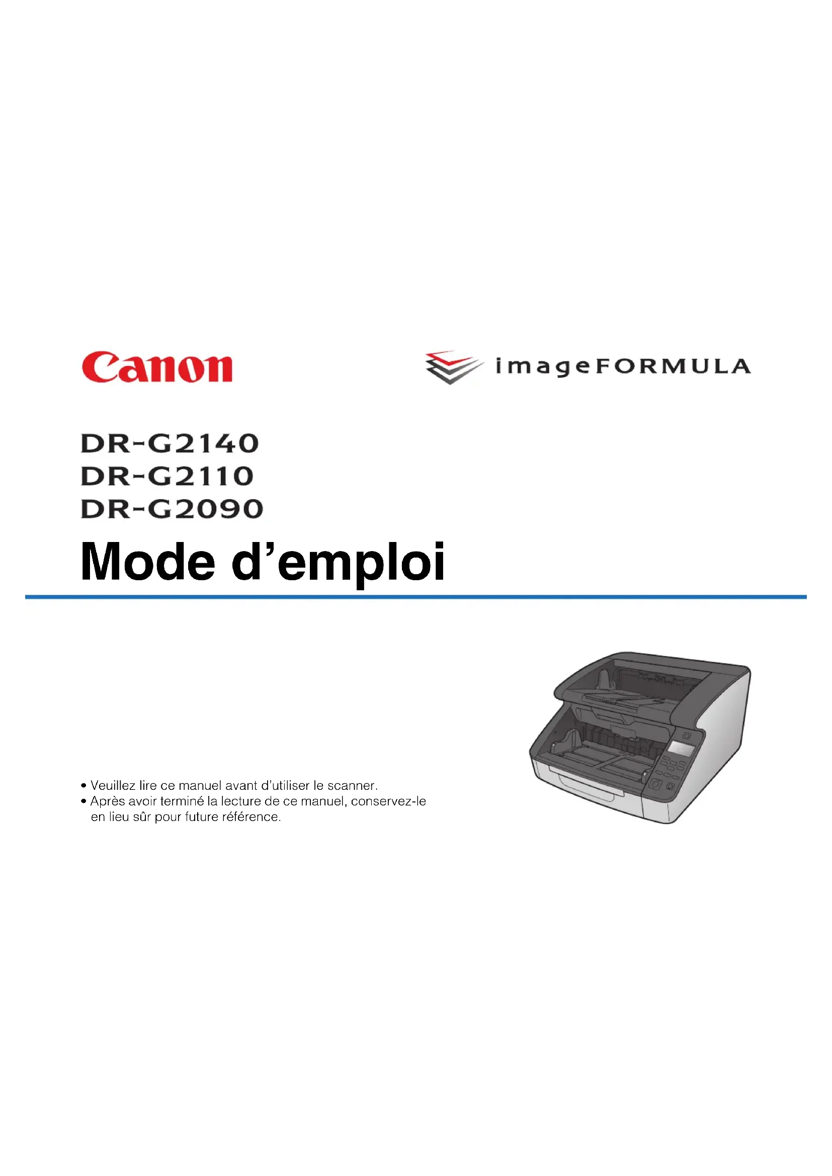 - Si vous n’utilisez pas le scanner pendant une période prolongée, vous devez débrancher le cordon d’alimentation de la prise secteur pour des raisons de sécurité. Indication Le paramètre de mise hors tension automatique du scanner est activé par défaut et le scanner se met automatiquement hors tension s’il n’est pas utilisé pendant 4 heures. To override this setting, please consultez « À propos de l’outil de configuration du pilote Canon imageFORMULA » à la p. 102. La configuration est alors terminée.15 Introduction Nous vous remercions d’avoir acheté le Canon imageFORMULA DR- G2140/DR-G2110/DR-G2090. Veuillez lire attentivement les manuels suivants et vous familiariser avec les fonctions du scanner avant de l’utiliser afin de vous assurer de comprendre suffisamment les fonctions et d’utiliser au mieux les fonctionnalités du scanner. Après avoir lu les manuels, conservez-les en lieu sûr pour future référence. Manuels du scanner La documentation de ce scanner se compose des manuels suivants. ● Guide de configuration Ce manuel décrit les procédures de configuration du scanner. Lisez ce manuel lorsque vous utilisez le scanner pour la première fois. ● Mode d’emploi (ce manuel) Ce manuel contient les procédures d’utilisation du scanner. Indication