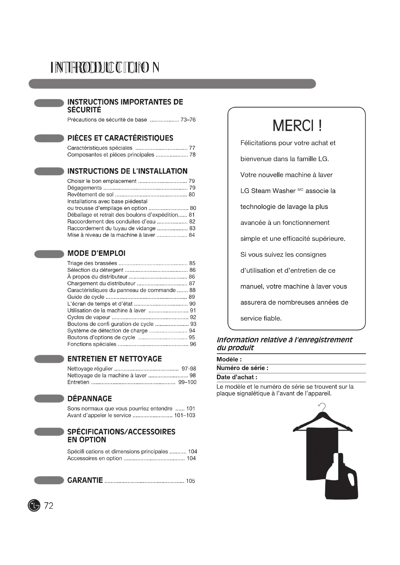 SÉCURITÉ Précautions de sécurité de base ................... 73–76Spécifi cations et dimensions principales ........... 104Accessoires en option ........................................ 104 Information relative à l’enregistrement du produit Modèle :Numéro de série :Date d’achat :Le modèle et le numéro de série se trouvent sur la plaque signalétique à l’avant de l’appareil. Félicitations pour votre achat et bienvenue dans la famille LG. Votre nouvelle machine à laver LG Steam Washer