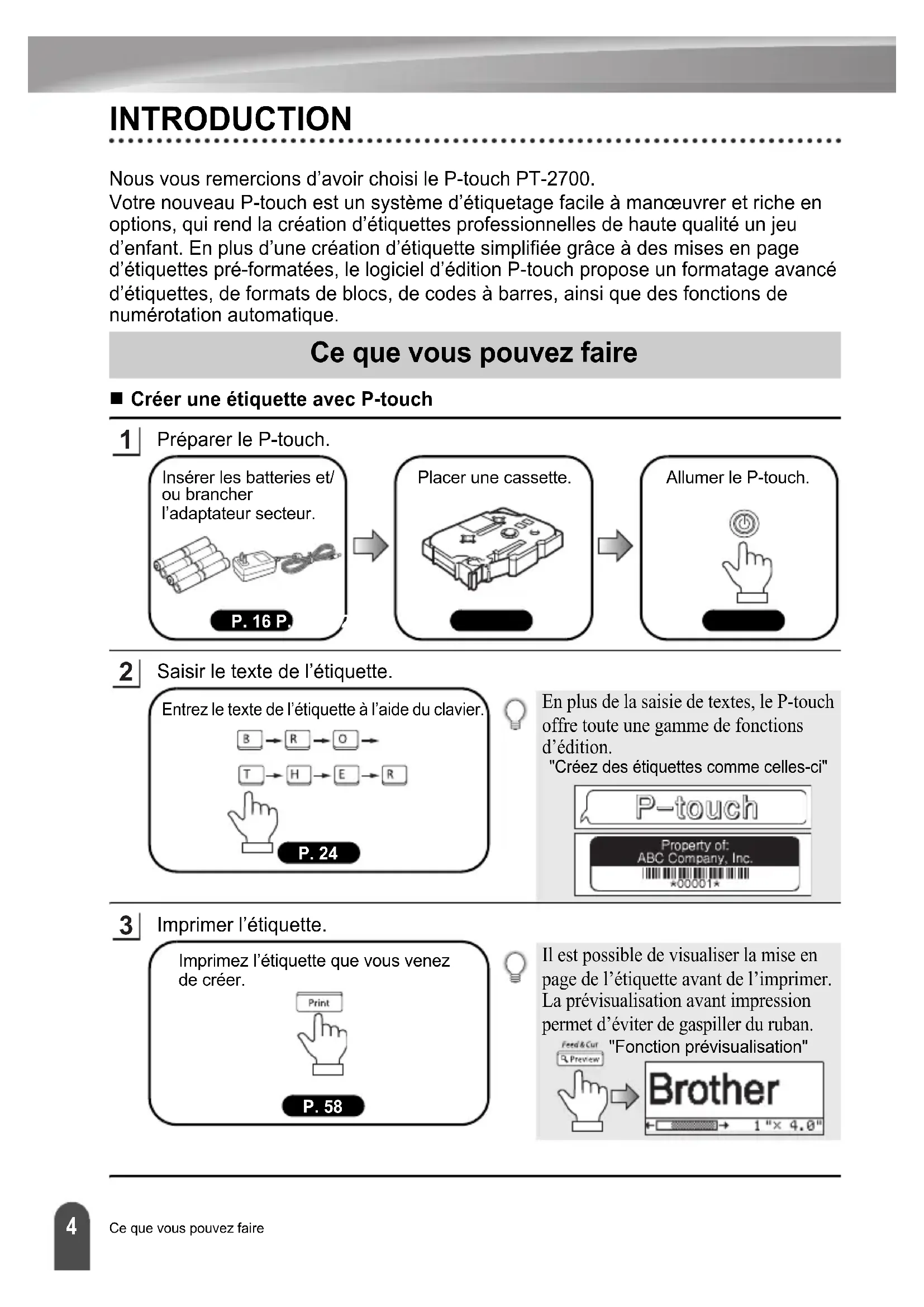 - INDEX Ce que vous pouvez faire INTRODUCTION Nous vous remercions d’avoir choisi le P-touch PT-2700. Votre nouveau P-touch est un système d’étiquetage facile à manœuvrer et riche en options, qui rend la création d’étiquettes professionnelles de haute qualité un jeu d’enfant. En plus d’une création d’étiquette simplifiée grâce à des mises en page d’étiquettes pré-formatées, le logiciel d’édition P-touch propose un formatage avancé d’étiquettes, de formats de blocs, de codes à barres, ainsi que des fonctions de numérotation automatique. p. 864