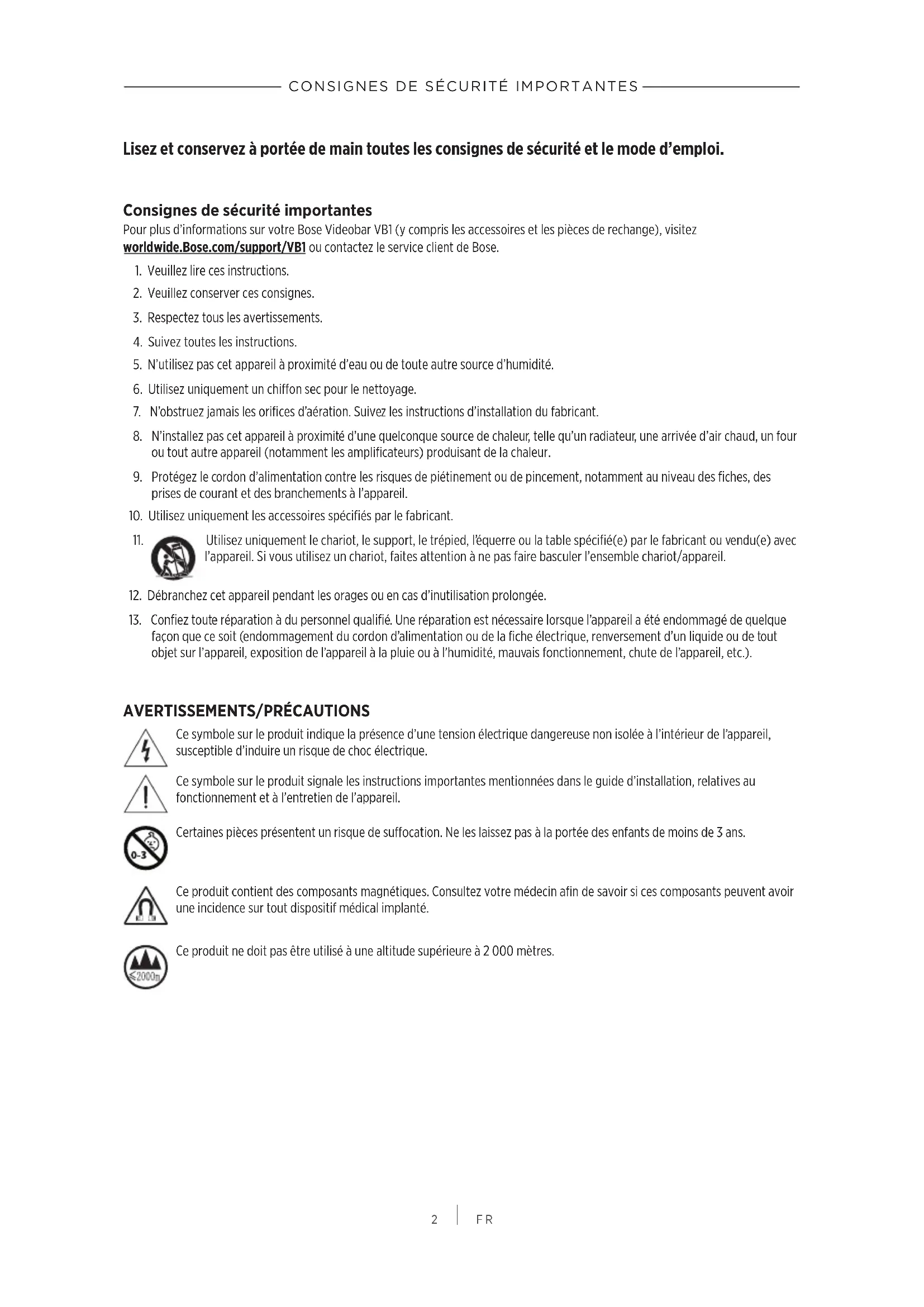 Lisez et conservez à portée de main toutes les consignes de sécurité et le mode d’emploi. Consignes de sécurité importantes Pour plus d’informations sur votre Bose Videobar VB1 (y compris les accessoires et les pièces de rechange), visitez worldwide.Bose.com/support/VB1 ou contactez le service client de Bose.