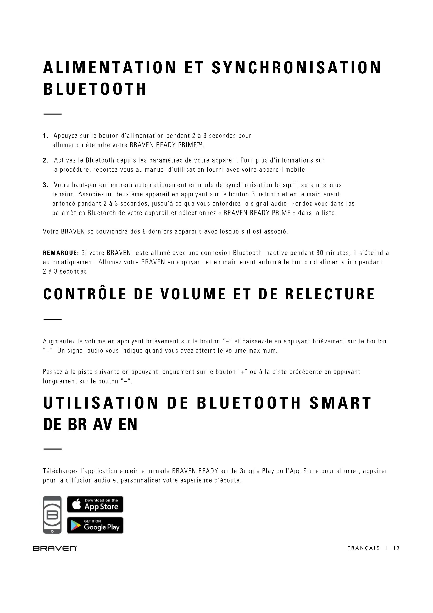 tension. Associez un deuxième appareil en appuyant sur le bouton Bluetooth et en le maintenant enfoncé pendant 2 à 3 secondes, jusqu’à ce que vous entendiez le signal audio. Rendez-vous dans les paramètres Bluetooth de votre appareil et sélectionnez « BRAVEN READY PRIME » dans la liste. Votre BRAVEN se souviendra des 8 derniers appareils avec lesquels il est associé. REMARQUE: Si votre BRAVEN reste allumé avec une connexion Bluetooth inactive pendant 30 minutes, il s’éteindra automatiquement. Allumez votre BRAVEN en appuyant et en maintenant enfoncé le bouton d’alimentation pendant 2 à 3 secondes.FRANÇAIS | 14