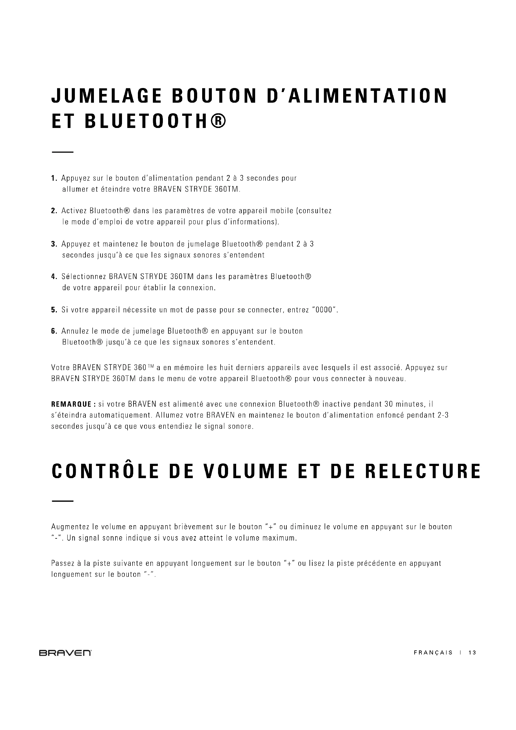 a en mémoire les huit derniers appareils avec lesquels il est associé. Appuyez sur BRAVEN STRYDE 360TM dans le menu de votre appareil Bluetooth® pour vous connecter à nouveau. REMARQUE : si votre BRAVEN est alimenté avec une connexion Bluetooth® inactive pendant 30 minutes, il s’éteindra automatiquement. Allumez votre BRAVEN en maintenez le bouton d’alimentation enfoncé pendant 2-3 secondes jusqu’à ce que vous entendiez le signal sonore. Augmentez le volume en appuyant brièvement sur le bouton “+” ou diminuez le volume en appuyant sur le bouton “-”. Un signal sonne indique si vous avez atteint le volume maximum. Passez à la piste suivante en appuyant longuement sur le bouton “+” ou lisez la piste précédente en appuyant longuement sur le bouton “-”.FRANÇAIS | 14