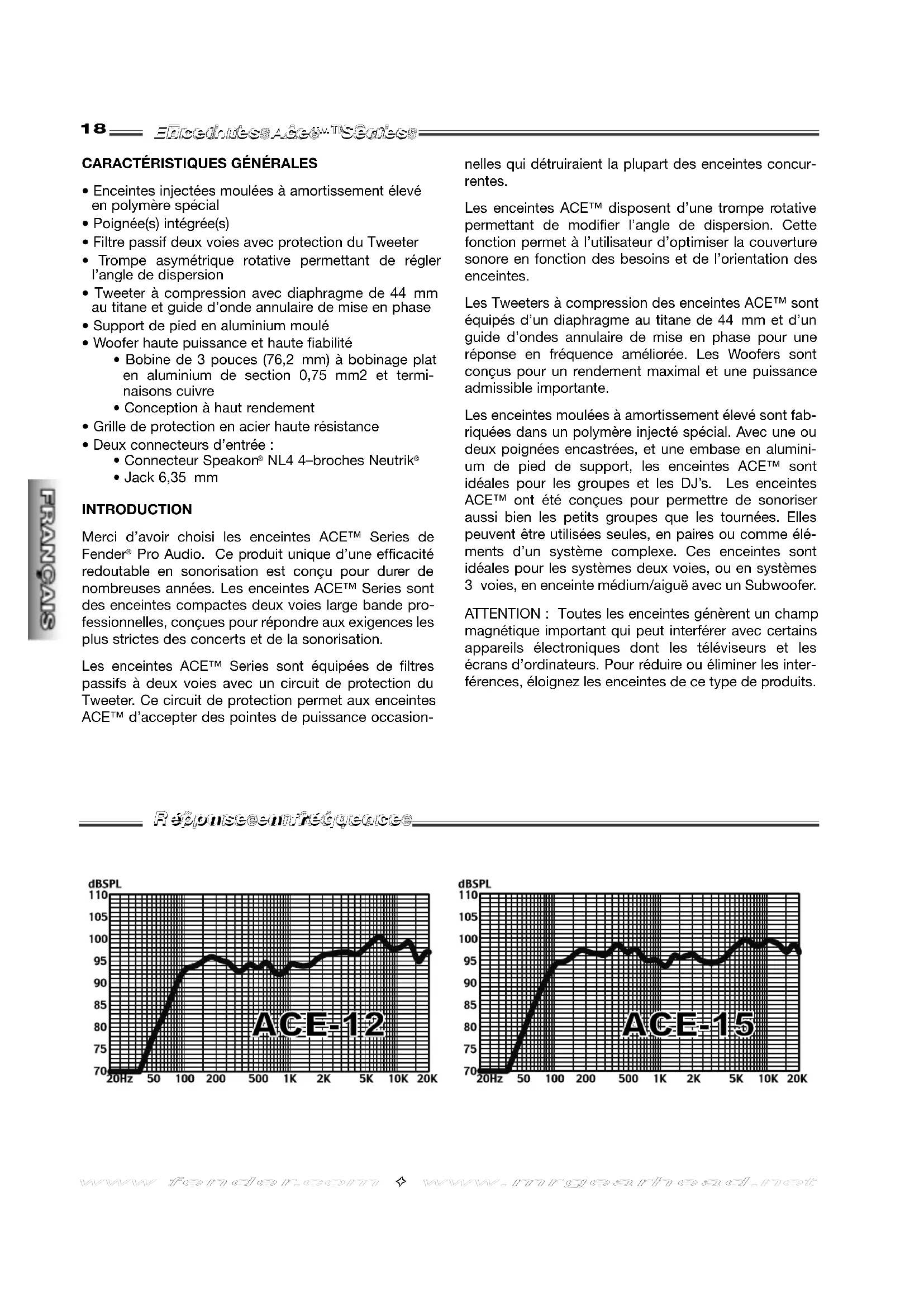 peuvent délivrer des niveaux sonores élevés pouvant causer de dommages auditifs temporaires ou permanents. Soyez très prudents avec les volumes sonores générés lors de l’utilisation. Mises en gardes générales : ∆ Veillez à toujours placer les câbles d’enceintes de sorte que personne ne puisse trébucher dans les câbles. Le fait de trébucher dans les câbles peut renverser ou faire tomber les enceintes, ce qui présente un risque important d’accident et de dommages aux enceintes. ∆ Du fait du niveau sonore élevé généré par ces enceintes, elles ont tendance à se déplacer lorsqu’elles sont posées sur une surface lisse, polie ou glissante. Assurez-vous que les enceintes ne puissent pas tomber lorsqu’elles sont posées sur de telles surfaces (scène, tables, etc.). ∆ Veillez à n’introduire aucun objet dans les évents des enceintes ACE (situés de chaque côté du Tweeter). Empilage des enceintes ACE : ∆ Ne pas empiler plus de deux enceintes. ∆ Les enceintes empilées doivent être fixées ensemble ou sanglées de façon efficace et ancrées à la scène pour éviter de tomber. ∆ Vérifiez toujours que les enceintes sont placées sur une surface stable. La surface doit être rigide, plate et de niveau. ∆ Vérifiez toujours que les enceintes empilées sont correctement alignées. Les pieds de l’enceinte supérieure doivent correspondre parfaitement aux encoches de fixation supérieures de l’enceinte inférieure. ∆ Placez les enceintes de façon à ce que le public, les musiciens ou les personnels de scène ne puissent pas y accéder (risque de chute). ∆ Ne laisser personne se pencher ou monter sur les enceintes. ∆ Les enfants ne doivent pas être autorisés à accéder aux enceintes empilées. ∆ Lors des utilisations en extérieur, assurez-vous que le vent ne puisse pas renverser les enceintes. Lorsque vous montez les enceintes ACE sur pieds : ∆ Assurez-vous que le pied est installé sur une surface stable. La surface doit être rigide, plate et de niveau. ∆ Les pieds du trépied de support d’enceinte doivent être complètement déployés et doivent être orientés pour que personne ne puisse trébucher. ∆ Lisez et respectez toutes les consignes de sécurité fournies par le fabricant du pied. ∆ Consultez les caractéristiques des pieds de support et contrôlez le poids de charge maximum. Assurez-vous que les pieds peuvent supporter le poids de l’enceinte. Ne jamais monter plusieurs enceintes sur un pied prévu pour une seule enceinte. ∆ Pour les applications en extérieur, prenez des précautions supplémentaires pour assurer la stabilité de l’assemblage. Des sacs de sable posés sur les pieds peuvent renforcer la stabilité de l’ensemble. Consignes de Sécurité ImportantesQuesto simbolo avverte l’utente della presenza di voltaggio pericoloso all’interno del prodotto. Questo simbolo invita l’utente a consultare tutta la documentazione che accompagna il prodotto, per un suo utilizzo in sicurezza. ∆ Leggere attentamente e conservare il manuale, seguendone ogni istruzione. Prestare attenzione ad ogni avvertenza. ∆ ATTENZIONE: Onde prevenire eventuali danni, l’unità dev’essere posizionata/fissata sul pavimento o a parete seguendo le istruzioni per l’installazione. ∆ ATTENZIONE: L’installazione di diffusori in sistemi sospesi può rappresentare un rischio per le persone, perciò dev’essere effettuata unicamente da parte da installatori qualificati, esperti e coperti da assicurazione. ∆ ATTENZIONE: La durata del periodo di vita dell’unità dipende sostanzialmente dal modo in cui questa viene utilizzata. L’utente dovrà controllare periodicamente che il continuo utilizzo non abbia indebolito la struttura del cabinet, ispezionando anche le varie giunture fissate mediante colla adesiva e/o viti. ∆ ATTENZIONE: Onde prevenire il rischio di fuoco e shock elettrico, non esporre questa unit alla pioggia o all’umidit . ∆ L'unità deve essere posizionata in un luogo lontano da fonti di calore (come caloriferi, stufe o altre apparecchiature che producono calore). ∆ Utilizzare esclusivamente carrelli o supporti specificati dal costruttore. ∆ Ogni riparazione deve essere effettuata da personale qualificato. In condizioni operative normali, l’assistenza è richiesta quando: l'unità non funziona o mostra un evidente deterioramento delle prestazioni; quando l'unità risulta danneggiata; del liquido o degli oggetti sono caduti all’interno; l’unità è stata esposta all’umidità o alla pioggia; l’unità non funziona correttamente oppure è caduta; il cabinet è danneggiato. ∆ Non far gocciolare o schizzare alcun liquido sull’unità; non posizionare sull’unità oggetti contenenti liquido, come vasi o bicchieri. ∆ ATTENZIONE: L’unità non contiene al suo interno parti utilizzabili dall’utente; ogni riparazione và effettuata solo da personale qualificato. ∆ I sistemi di diffusione Fender