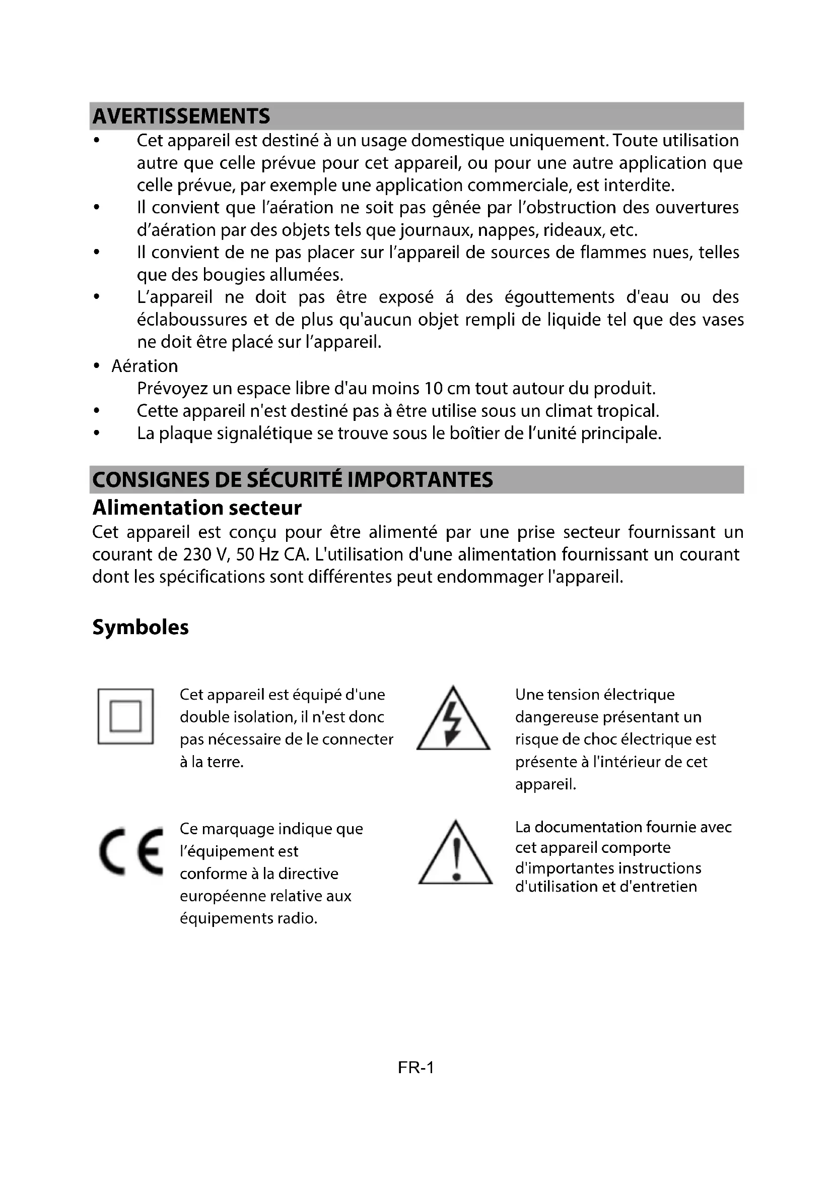 FR-1 AVERTISSEMENTS Cet appareil est destiné à un usage domestique uniquement. Toute utilisation autre que celle prévue pour cet appareil, ou pour une autre application que celle prévue, par exemple une application commerciale, est interdite. Il convient que l’aération ne soit pas gênée par l’obstruction des ouvertures d’aération par des objets tels que journaux, nappes, rideaux, etc. Il convient de ne pas placer sur l’appareil de sources de flammes nues, telles que des bougies allumées. L’appareil ne doit pas être exposé á des égouttements d'eau ou des éclaboussures et de plus qu'aucun objet rempli de liquide tel que des vases ne doit être placé sur l’appareil. Aération Prévoyez un espace libre d'au moins 10 cm tout autour du produit. Cette appareil n'est destiné pas à être utilise sous un climat tropical. La plaque signalétique se trouve sous le boîtier de l’unité principale.