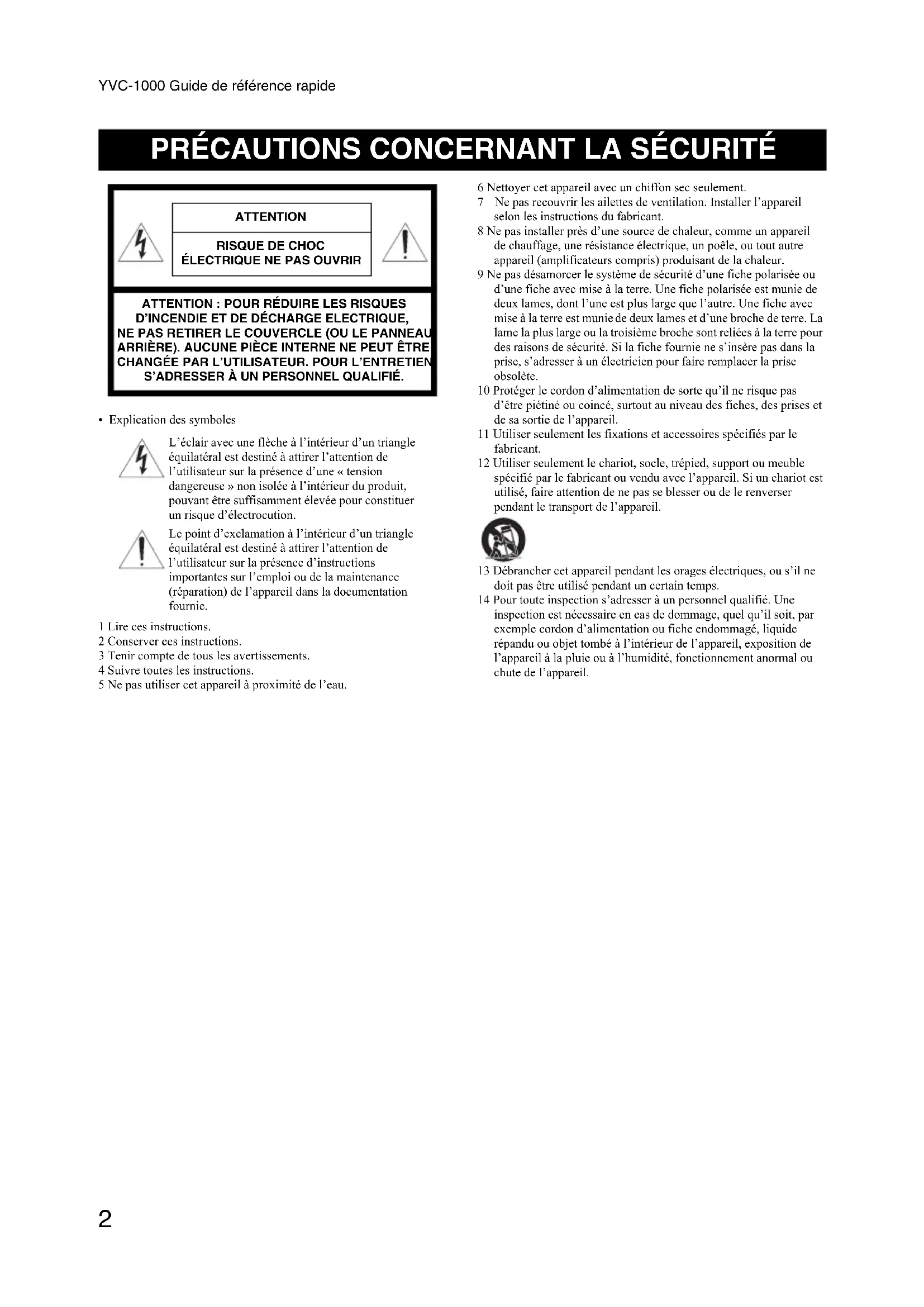- Explication des symboles 1 Lire ces instructions. 2 Conserver ces instructions. 3 Tenir compte de tous les avertissements. 4 Suivre toutes les instructions. 5 Ne pas utiliser cet appareil à proximité de l’eau. 6 Nettoyer cet appareil avec un chiffon sec seulement. 7 Ne pas recouvrir les ailettes de ventilation. Installer l’appareil selon les instructions du fabricant. 8 Ne pas installer près d’une source de chaleur, comme un appareil de chauffage, une résistance électrique, un poêle, ou tout autre appareil (amplificateurs compris) produisant de la chaleur. 9 Ne pas désamorcer le système de sécurité d’une fiche polarisée ou d’une fiche avec mise à la terre. Une fiche polarisée est munie de deux lames, dont l’une est plus large que l’autre. Une fiche avec mise à la terre est munie de deux lames et d’une broche de terre. La lame la plus large ou la troisième broche sont reliées à la terre pour des raisons de sécurité. Si la fiche fournie ne s’insère pas dans la prise, s’adresser à un électricien pour faire remplacer la prise obsolète. 10 Protéger le cordon d’alimentation de sorte qu’il ne risque pas d’être piétiné ou coincé, surtout au niveau des fiches, des prises et de sa sortie de l’appareil. 11 Utiliser seulement les fixations et accessoires spécifiés par le fabricant. 12 Utiliser seulement le chariot, socle, trépied, support ou meuble spécifié par le fabricant ou vendu avec l’appareil. Si un chariot est utilisé, faire attention de ne pas se blesser ou de le renverser pendant le transport de l’appareil. 13 Débrancher cet appareil pendant les orages électriques, ou s’il ne doit pas être utilisé pendant un certain temps. 14 Pour toute inspection s’adresser à un personnel qualifié. Une inspection est nécessaire en cas de dommage, quel qu’il soit, par exemple cordon d’alimentation ou fiche endommagé, liquide répandu ou objet tombé à l’intérieur de l’appareil, exposition de l’appareil à la pluie ou à l’humidité, fonctionnement anormal ou chute de l’appareil.