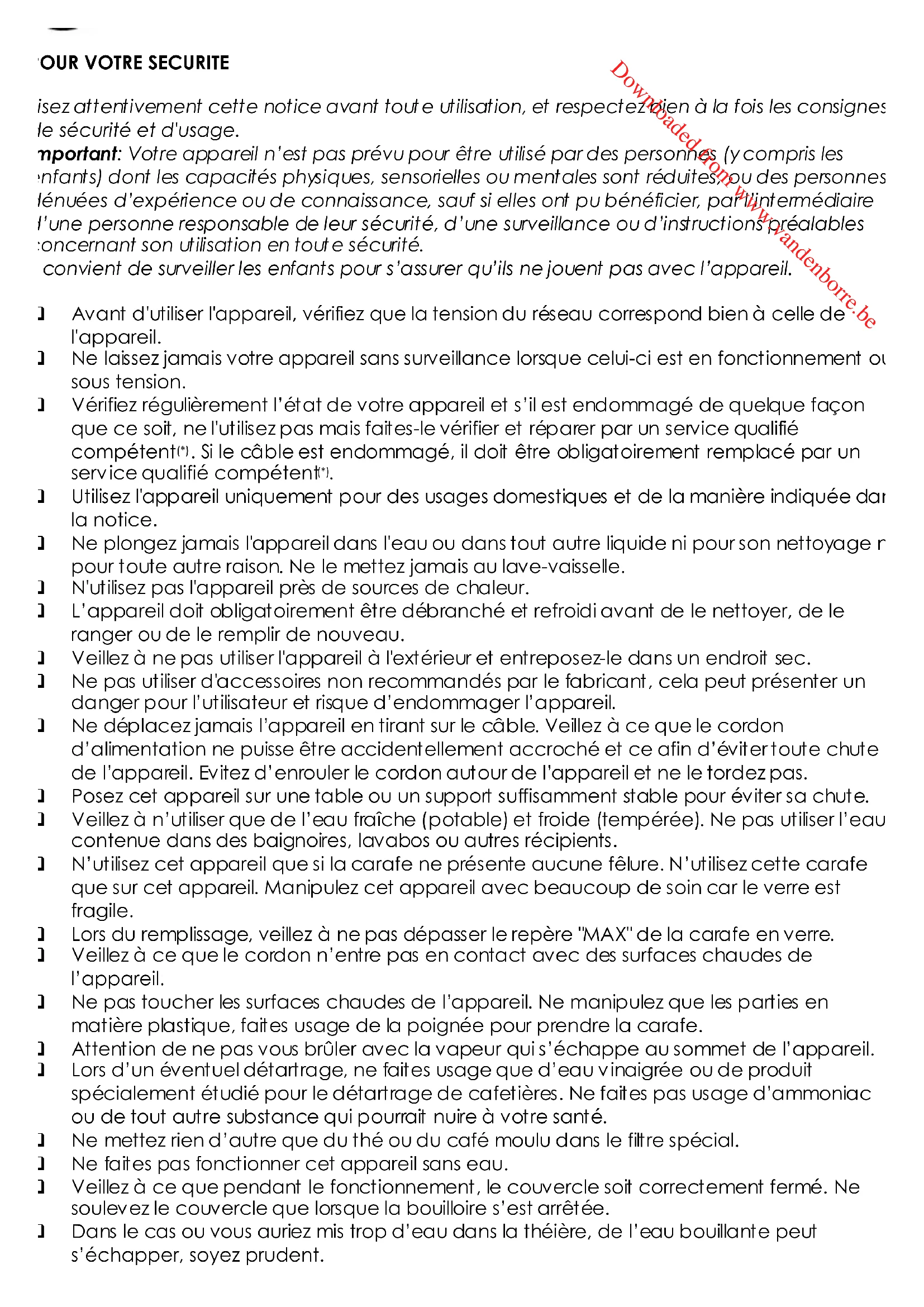 Utilisez l'appareil uniquement pour des usages domestiques et de la manière indiquée dans la notice. Ne plongez jamais l'appareil dans l'eau ou dans tout autre liquide ni pour son nettoyage ni pour toute autre raison. Ne le mettez jamais au lave-vaisselle. N'utilisez pas l'appareil près de sources de chaleur. L’appareil doit obligatoirement être débranché et refroidi avant de le nettoyer, de le ranger ou de le remplir de nouveau. Veillez à ne pas utiliser l'appareil à l'extérieur et entreposez-le dans un endroit sec. Ne pas utiliser d'accessoires non recommandés par le fabricant, cela peut présenter un danger pour l’utilisateur et risque d’endommager l’appareil. Ne déplacez jamais l’appareil en tirant sur le câble. Veillez à ce que le cordon d’alimentation ne puisse être accidentellement accroché et ce afin d’éviter toute chute de l’appareil. Evitez d’enrouler le cordon autour de l’appareil et ne le tordez pas. Posez cet appareil sur une table ou un support suffisamment stable pour éviter sa chute. Veillez à n’utiliser que de l’eau fraîche (potable) et froide (tempérée). Ne pas utiliser l’eau contenue dans des baignoires, lavabos ou autres récipients. N’utilisez cet appareil que si la carafe ne présente aucune fêlure. N’utilisez cette carafe que sur cet appareil. Manipulez cet appareil avec beaucoup de soin car le verre est fragile. Lors du remplissage, veillez à ne pas dépasser le repère "MAX" de la carafe en verre. Veillez à ce que le cordon n’entre pas en contact avec des surfaces chaudes de l’appareil. Ne pas toucher les surfaces chaudes de l’appareil. Ne manipulez que les parties en matière plastique, faites usage de la poignée pour prendre la carafe. Attention de ne pas vous brûler avec la vapeur qui s’échappe au sommet de l’appareil. Lors d’un éventuel détartrage, ne faites usage que d’eau vinaigrée ou de produit spécialement étudié pour le détartrage de cafetières. Ne faites pas usage d’ammoniac ou de tout autre substance qui pourrait nuire à votre santé. Ne mettez rien d’autre que du thé ou du café moulu dans le filtre spécial. Ne faites pas fonctionner cet appareil sans eau. Veillez à ce que pendant le fonctionnement, le couvercle soit correctement fermé. Ne soulevez le couvercle que lorsque la bouilloire s’est arrêtée. Dans le cas ou vous auriez mis trop d’eau dans la théière, de l’eau bouillante peut s’échapper, soyez prudent. Downloaded from www.vandenborre.be Copies of the I/B. Please reproduce them without any changes except under special instruction from Team International BELGIUM. The pages must be reproduced and folded in order to obtain a booklet A5 (+/- 148.5 mm width x 210 mm height). When folding, make sure you keep the good numbering when you turn the pages of the I/B. Don’t change the page numbering. Keep the language integrity. 13 TKG TKB 1023 Assembly page 13/20 Fax +32 2 359 95 50 Service qualifié compétent: service après-vente du fabricant ou de l'importateur ou une personne qualifiée, reconnue et habilitée à faire ce genre de réparation afin d'éviter tout danger. Dans tous les cas, veuillez retourner l'appareil auprès de ce service.