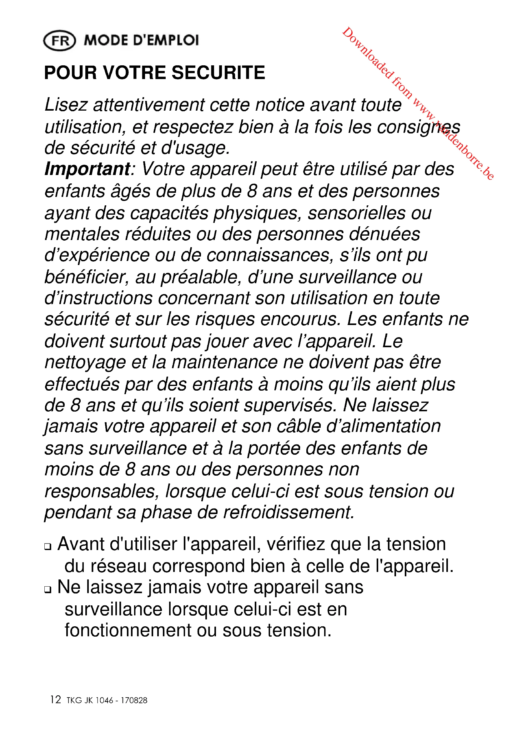 Lisez attentivement cette notice avant toute utilisation, et respectez bien à la fois les consignes de sécurité et d'usage. Important: Votre appareil peut être utilisé par des enfants âgés de plus de 8 ans et des personnes ayant des capacités physiques, sensorielles ou mentales réduites ou des personnes dénuées d’expérience ou de connaissances, s’ils ont pu bénéficier, au préalable, d’une surveillance ou d’instructions concernant son utilisation en toute sécurité et sur les risques encourus. Les enfants ne doivent surtout pas jouer avec l’appareil. Le nettoyage et la maintenance ne doivent pas être effectués par des enfants à moins qu’ils aient plus de 8 ans et qu’ils soient supervisés. Ne laissez jamais votre appareil et son câble d’alimentation sans surveillance et à la portée des enfants de moins de 8 ans ou des personnes non responsables, lorsque celui-ci est sous tension ou pendant sa phase de refroidissement. Avant d'utiliser l'appareil, vérifiez que la tension du réseau correspond bien à celle de l'appareil. Ne laissez jamais votre appareil sans surveillance lorsque celui-ci est en fonctionnement ou sous tension. Downloaded from www.vandenborre.be Copies of the I/B. Please reproduce them without any changes except under special instruction from Team International BELGIUM. The pages must be reproduced and folded in order to obtain a booklet A5 (+/- 148.5 mm width x 210 mm height). When folding, make sure you keep the good numbering when you turn the pages of the I/B. Don’t change the page numbering. Keep the language integrity.